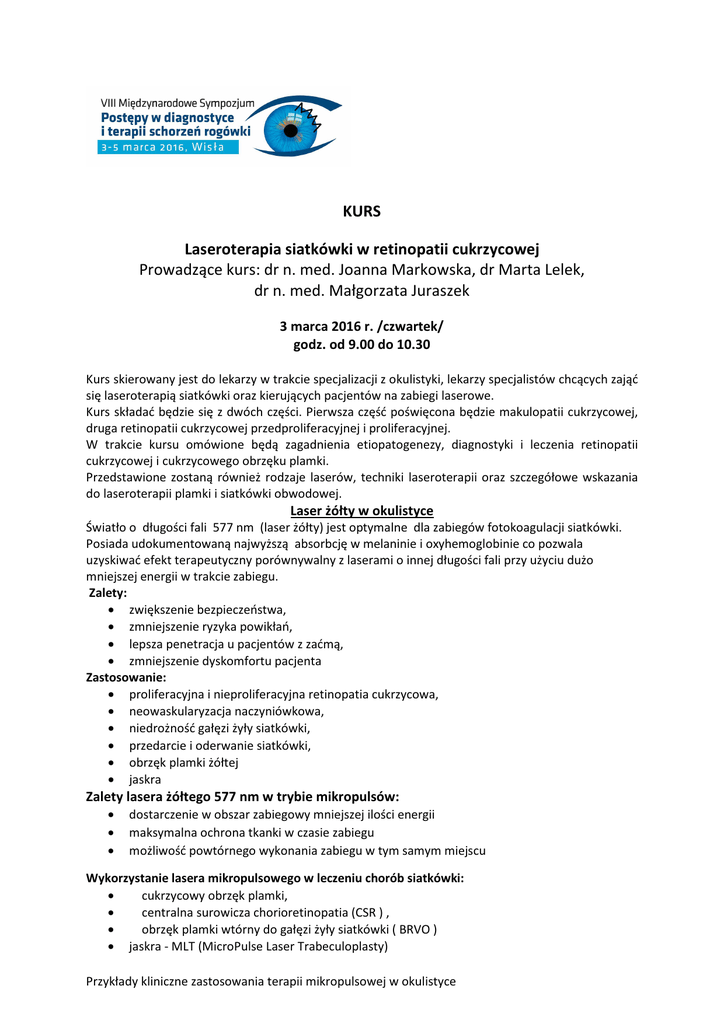 KURS Laseroterapia siatkówki w retinopatii cukrzycowej Prowadzące kurs: dr n. med. Joanna Markowska, dr Marta Lelek, dr n. med. Małgorzata Juraszek 3 marca 2016 r. /czwartek/ godz. od 9.00 do 10.30 Kurs skierowany jest do lekarzy w trakcie specjalizacji z okulistyki, lekarzy specjalistów chcących zająć się laseroterapią siatkówki oraz kierujących pacjentów na zabiegi laserowe. Kurs składać będzie się z dwóch części. Pierwsza część poświęcona będzie makulopatii cukrzycowej, druga retinopatii cukrzycowej przedproliferacyjnej i proliferacyjnej. W trakcie kursu omówione będą zagadnienia etiopatogenezy, diagnostyki i leczenia retinopatii cukrzycowej i cukrzycowego obrzęku plamki. Przedstawione zostaną również rodzaje laserów, techniki laseroterapii oraz szczegółowe wskazania do laseroterapii plamki i siatkówki obwodowej. Laser żółty w okulistyce Światło o długości fali 577 nm (laser żółty) jest optymalne dla zabiegów fotokoagulacji siatkówki. Posiada udokumentowaną najwyższą absorbcję w melaninie i oxyhemoglobinie co pozwala uzyskiwać efekt terapeutyczny porównywalny z laserami o innej długości fali przy użyciu dużo mniejszej energii w trakcie zabiegu. Zalety: • zwiększenie bezpieczeństwa, • zmniejszenie ryzyka powikłań, • lepsza penetracja u pacjentów z zaćmą, • zmniejszenie dyskomfortu pacjenta Zastosowanie: • proliferacyjna i nieproliferacyjna retinopatia cukrzycowa, • neowaskularyzacja naczyniówkowa, • niedrożność gałęzi żyły siatkówki, • przedarcie i oderwanie siatkówki, • obrzęk plamki żółtej • jaskra Zalety lasera żółtego 577 nm w trybie mikropulsów: • • • dostarczenie w obszar zabiegowy mniejszej ilości energii maksymalna ochrona tkanki w czasie zabiegu możliwość powtórnego wykonania zabiegu w tym samym miejscu Wykorzystanie lasera mikropulsowego w leczeniu chorób siatkówki: • cukrzycowy obrzęk plamki, • centralna surowicza chorioretinopatia (CSR ) , • obrzęk plamki wtórny do gałęzi żyły siatkówki ( BRVO ) • jaskra - MLT (MicroPulse Laser Trabeculoplasty) Przykłady kliniczne zastosowania terapii mikropulsowej w okulistyce