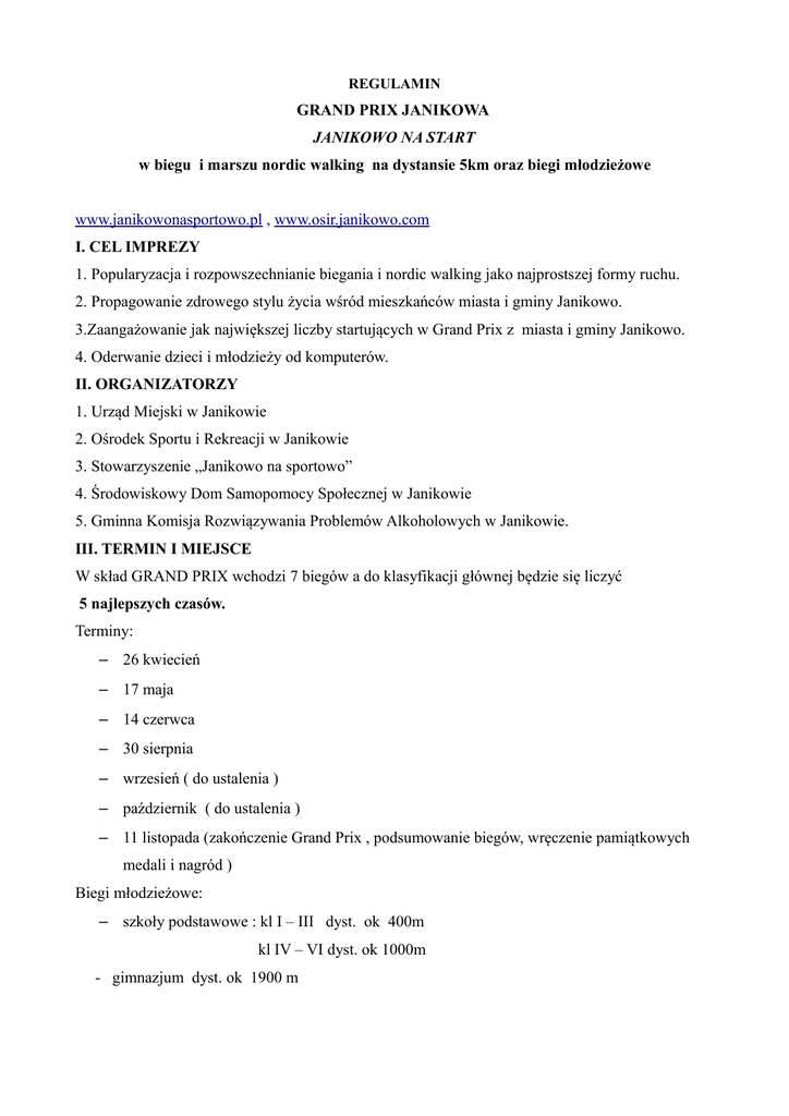 REGULAMIN GRAND PRIX JANIKOWA JANIKOWO NA START w biegu i marszu nordic walking na dystansie 5km oraz biegi młodzieżowe www.janikowonasportowo.pl , www.osir.janikowo.com I. CEL IMPREZY 1. Popularyzacja i rozpowszechnianie biegania i nordic walking jako najprostszej formy ruchu. 2. Propagowanie zdrowego stylu życia wśród mieszkańców miasta i gminy Janikowo. 3.Zaangażowanie jak największej liczby startujących w Grand Prix z miasta i gminy Janikowo. 4. Oderwanie dzieci i młodzieży od komputerów. II. ORGANIZATORZY 1. Urząd Miejski w Janikowie 2. Ośrodek Sportu i Rekreacji w Janikowie 3. Stowarzyszenie „Janikowo na sportowo” 4. Środowiskowy Dom Samopomocy Społecznej w Janikowie 5. Gminna Komisja Rozwiązywania Problemów Alkoholowych w Janikowie. III. TERMIN I MIEJSCE W skład GRAND PRIX wchodzi 7 biegów a do klasyfikacji głównej będzie się liczyć 5 najlepszych czasów. Terminy: – 26 kwiecień – 17 maja – 14 czerwca – 30 sierpnia – wrzesień ( do ustalenia ) – październik ( do ustalenia ) – 11 listopada (zakończenie Grand Prix , podsumowanie biegów, wręczenie pamiątkowych medali i nagród ) Biegi młodzieżowe: – szkoły podstawowe : kl I – III dyst. ok 400m kl IV – VI dyst. ok 1000m - gimnazjum dyst. ok 1900 m 2. Start i meta biegu Stadion Miejski w Janikowie ul. Główna 40 3. Dystans: bieg i nordic walking - 5 km po ulicach miasta 4. Biegi młodzieżowe na terenie OSiR ( ścieżka do biegania ) IV. WARUNKI UCZESTNICTWA 1. W GP prawo startu mają mieszkańcy Gminy i Miasta Janikowo 2. Wszyscy zawodnicy startujący w Grand Prix i biegach młodzieżowych muszą być zweryfikowani w Biurze Zawodów przed zawodami. 3. Podczas weryfikacji zawodnicy muszą posiadać dowód osobisty lub inny dokument ze zdjęciem umożliwiający identyfikację. 4.Warunkiem dopuszczenia zawodnika do biegu będzie złożenie podpisu pod oświadczeniem o zdolności do udziału w biegu. Tym samym zgłaszający uznaje, że zapoznał się z regulaminem i zobowiązuje się do jego przestrzegania, wyraża zgodę na przetwarzanie swoich danych osobowych oraz wizerunku dla potrzeb biegu lub zgoda podpisana u nieletnich przez opiekuna prawnego. V. ZGŁOSZENIA 1. Zgłoszenia przyjmowane za pośrednictwem strony www. janikowonasportowo.pl lub wypełniając kwestionariusz zgłoszeniowy. ( kasa pływalni WODNIK) 2. Za osobę zgłoszoną uważa się zawodnika, który wypełnił i przesłał formularz zgłoszeniowy, dokonał wpłaty ( osoby dorosłe ) oraz ma nadany numer startowy. VI. KLASYFIKACJE I POMIAR CZASU Klasyfikacja GRAND PRIX JANIKOWA JANIKOWO NA START w biegu i marszu nordic walking następujących kategoriach: 1. bieg : kobiet i mężczyzn (open) 2. marsz : kobiet i mężczyzn (open) 3. Kazdy z zawodników otrzyma numer startowy oraz chip do elektronicznego pomiaru czasu. Nadany numer startowy i chip obowiązuje przez wszystkie biegi z cyklu G P Janikowa 4. Za zgubiony lub zniszczony chip startujący ponosi opłatę 10 zł VII. NAGRODY 1. Każdy zawodnik który ukończy 5 biegów z 7 otrzyma pamiątkowy medal 2. W biegach młodzieżowych ukończenie 5-ciu z 7 biegów upoważnia do odbioru medalu i nagrody rzeczowej. VIII. OPŁATY 1. Wysokość wpisowego – 20 zł ( dorośli za 7 biegów GP Janikowa ) 2. Biegi młodzieżowe są bezpłatne. 3. Opłatę należy uiścić w kasie pływalni WODNIK IX. PROGRAM MINUTOWY godz. 15.45 – 16.30 weryfikacja zawodników w biurze zawodów. godz. 16.30 - biegi młodzieżowe godz. 17.00 – start biegu i marszu N W na 5 km. X. POSTANOWIENIA KOŃCOWE SPRAWY ORGANIZACYJNE 1. Szatnie, natryski i toalety będą udostępnione w Hali Widowiskowo-Sportowej w Janikowie 3. Start i meta droga dojazdowa do Stadionu Miejskiego, biegi młodzieżowe – ścieżka do biegania 8. Zabezpieczenie medyczne na mecie. 9. Organizator nie ubezpiecza uczestników od następstw nieszczęśliwych wypadków, każdy startujący powinien ubezpieczyć się dodatkowo. 11. Nieprawidłowe wypełnienie zgłoszenia przez uczestnika zwalnia organizatora z wszelkich następstw. POSTANOWIENIA KOŃCOWE 1. Bieg odbędzie się bez względu na pogodę. 2. Odebranie numeru startowego jest równoznaczne z akceptacją całego regulaminu. 3. Interpretacja niniejszego regulaminu należy do organizatora. 4. W przypadku pytań prosimy o kontakt: [email protected] , telefonicznie OSiR Janikowo Grzegorz Płuciennik 52-3514459 lub 797 727 1