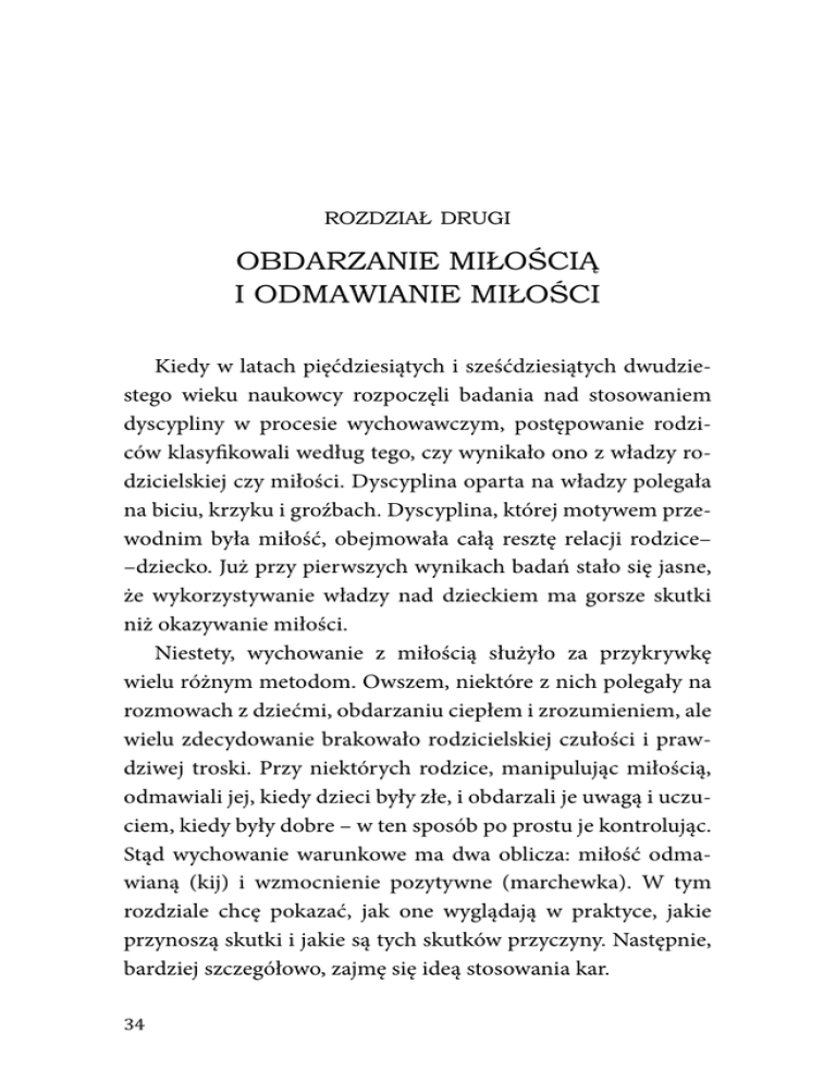 rozdział drugi OBDARZANIE MIŁOŚCIĄ I ODMAWIANIE MIŁOŚCI Kiedy w latach pięćdziesiątych i sześćdziesiątych dwudziestego wieku naukowcy rozpoczęli badania nad stosowaniem dyscypliny w procesie wychowawczym, postępowanie rodziców klasyfikowali według tego, czy wynikało ono z władzy rodzicielskiej czy miłości. Dyscyplina oparta na władzy polegała na biciu, krzyku i groźbach. Dyscyplina, której motywem przewodnim była miłość, obejmowała całą resztę relacji rodzice– –dziecko. Już przy pierwszych wynikach badań stało się jasne, że wykorzystywanie władzy nad dzieckiem ma gorsze skutki niż okazywanie miłości. Niestety, wychowanie z miłością służyło za przykrywkę wielu różnym metodom. Owszem, niektóre z nich polegały na rozmowach z dziećmi, obdarzaniu ciepłem i zrozumieniem, ale wielu zdecydowanie brakowało rodzicielskiej czułości i prawdziwej troski. Przy niektórych rodzice, manipulując miłością, odmawiali jej, kiedy dzieci były złe, i obdarzali je uwagą i uczuciem, kiedy były dobre – w ten sposób po prostu je kontrolując. Stąd wychowanie warunkowe ma dwa oblicza: miłość odmawianą (kij) i wzmocnienie pozytywne (marchewka). W tym rozdziale chcę pokazać, jak one wyglądają w praktyce, jakie przynoszą skutki i jakie są tych skutków przyczyny. Następnie, bardziej szczegółowo, zajmę się ideą stosowania kar. 34 Manipulowanie miłością Miłości można odmawiać dziecku na wiele sposobów i z mniejszym lub większym natężeniem. Czasami w reakcji na niewłaściwe zachowanie rodzice stają się chłodniejsi w swoich uczuciach, nawet nie w pełni zdając sobie z tego sprawę. Czasami jednak deklarują wprost: „Nie kocham cię, kiedy postępujesz w ten sposób” albo „Kiedy robisz takie rzeczy, wolę nie być przy tobie”. Niektórzy rodzice, odmawiając swojej miłości, po prostu przestają reagować, czyli dają dziecku do zrozumienia, że się je ignoruje. Mogą nawet nie powiedzieć tego na głos, ale przesłanie jest całkiem jasne: „Jeżeli robisz coś, co mi się nie podoba, nie będę zwracać na ciebie uwagi. Będę udawać, że ciebie tu nie ma. Jeżeli chcesz, bym cię znów zauważyła, to mnie słuchaj”. Jeszcze inni separują się od dziecka fizycznie. Są na to dwa sposoby: albo odchodzą, zostawiając dziecko na ulicy, łkające lub wołające w przerażeniu: „Mamusiu, wracaj, proszę!”, albo zamykają je w pokoju czy innym miejscu. Taką metodę należałoby słusznie nazwać przymusową izolacją. Ale to określenie zapewne wprawiłoby wielu rodziców w zakłopotanie, stąd zwyczajowo używa się bardziej niewinnego terminu, pozwalającego przymykać oczy na to, o co naprawdę chodzi. Preferowany eufemizm to odosobnienie czasowe (time-out). W rzeczywistości ta bardzo popularna technika dyscyplinująca jest swoistą wersją miłości odmawianej, przynajmniej w sytuacji, kiedy dziecko jest odosabniane wbrew własnej woli. Nie ma nic złego w zaproponowaniu rozzłoszczonemu dziecku, by udało się do swojego pokoju. Nie będzie to dla niego wygnaniem czy karą, jeżeli samo zdecyduje się na spędzenie chwili 35 w samotności, a przy tym będzie miało wybór miejsca i czasu trwania takiego odosobnienia. Może to nawet okazać się pomocne dla obu skonfliktowanych stron. Jednak odosobnienie czasowe (time-out) to nic innego jak więzienna izolatka. Kluczem do zrozumienia tej metody jest pochodzenie samego terminu. Odosobnienie czasowe jest równoznaczne z ,,przerwą we wzmacnianiu pozytywnym’’ – praktyką, która rozwinęła się prawie pół wieku temu podczas laboratoryjnych doświadczeń na zwierzętach. Burrus F. Skinner i jego wierni uczniowie, mozoląc się nad przyuczeniem gołębi do stukania dziobem w określone klawisze w reakcji na migające światła, opracowywali różne harmonogramy, według których podawano zwierzętom pokarm w nagrodę za dostosowanie się do wymogów eksperymentatorów. Czasami próbowali także karać ptaki, pozbawiając je pokarmu lub pozostawiając w ciemnościach. Podobnym doświadczeniom poddawano również inne zwierzęta. Na podstawie tych eksperymentów współpracownik Skinnera opublikował w 1958 roku artykuł pod tytułem Kontrolowanie zachowania szympansów i gołębi poprzez przerwy we wzmacnianiu pozytywnym. W kilka lat później w tych samych pismach poświęconych psychologii doświadczalnej zaczęły ukazywać się artykuły o tytułach w rodzaju Długość czasowego odosobnienia a tłumienie dewiacyjnego zachowania u dzieci. W tym konkretnym badaniu dzieci poddawane czasowemu odosobnieniu opisywano jako „upośledzone, zinstytucjonalizowane podmioty”. Ale już wkrótce zaczęto ordynować tę metodę bezkrytycznie i nawet psycholodzy zajmujący się dyscypliną, czyli ci, których powinna przerażać idea traktowania dzieci jak zwierząt, z entuzjazmem doradzali rodzicom stosowanie przerw na odosobnienie 36 czasowe dziecka, kiedy tylko zrobi coś złego. Nie trzeba było długo czekać, by stały się one „najpowszechniej polecaną metodą dyscyplinującą w profesjonalnej literaturze poświęconej dzieciom, które nie przeszły jeszcze okresu dojrzewania”20. Mówimy zatem o technice, którą zaczęto stosować jako sposób k o n t r o l o w a n i a z a c h o w a n i a z w i e r z ą t ! Każde z tych trzech słów stawia przed nami kłopotliwe pytania. Z drugim, oczywiście, już się zetknęliśmy, pytając, czy wychowując dziecko, powinniśmy skupiać się wyłącznie na jego zachowaniu. Odosobnienie czasowe, jak wszystkie kary i nagrody, jest rozwiązaniem powierzchownym. Służy wyłącznie temu, by pewien mechanizm funkcjonował – lub nie funkcjonował – w określony sposób. Trzecie słowo – ,,zwierzęta’’ – przypomina nam, że behawioryści, którzy wymyślili przerwę we wzmocnieniu pozytywnym, byli przekonani, iż ludzie nie różnią się zasadniczo od zwierząt. Wprawdzie przejawiają bardziej s