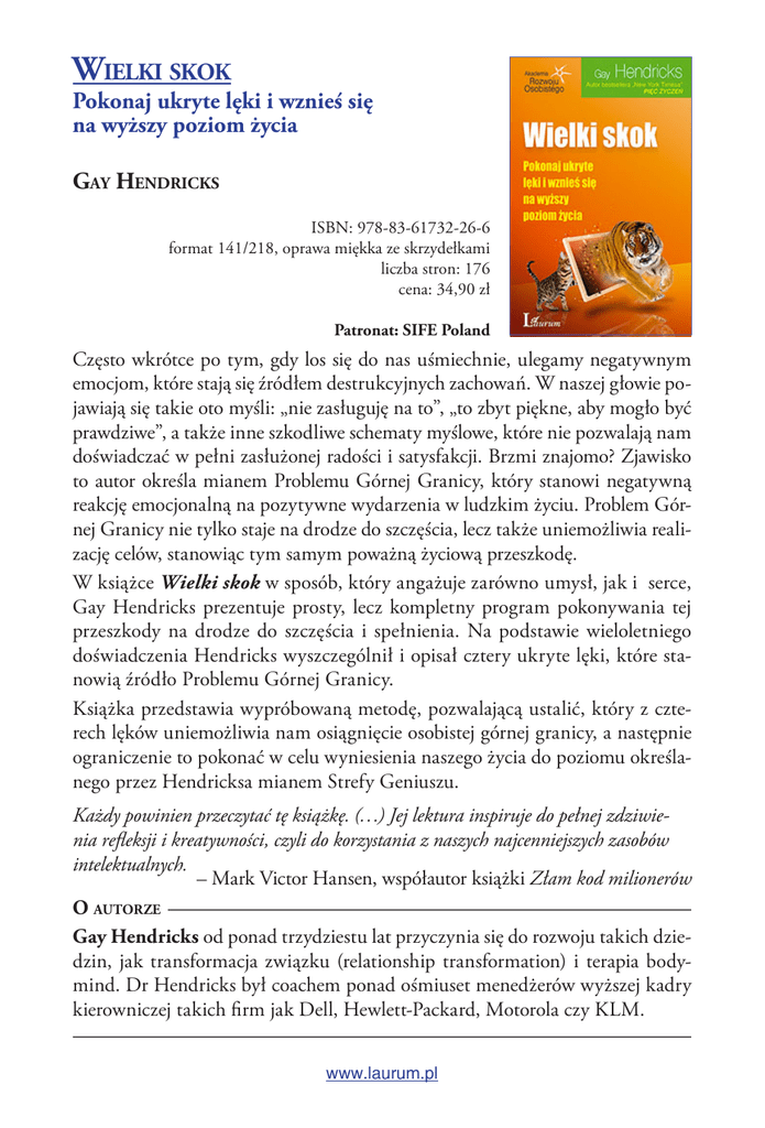 Wielki skok Pokonaj ukryte lęki i wznieś się na wyższy poziom życia Gay Hendricks ISBN: 978-83-61732-26-6 format 141/218, oprawa miękka ze skrzydełkami liczba stron: 176 cena: 34,90 zł Patronat: SIFE Poland Często wkrótce po tym, gdy los się do nas uśmiechnie, ulegamy negatywnym emocjom, które stają się źródłem destrukcyjnych zachowań. W naszej głowie pojawiają się takie oto myśli: „nie zasługuję na to”, „to zbyt piękne, aby mogło być prawdziwe”, a także inne szkodliwe schematy myślowe, które nie pozwalają nam doświadczać w pełni zasłużonej radości i satysfakcji. Brzmi znajomo? Zjawisko to autor określa mianem Problemu Górnej Granicy, który stanowi negatywną reakcję emocjonalną na pozytywne wydarzenia w ludzkim życiu. Problem Górnej Granicy nie tylko staje na drodze do szczęścia, lecz także uniemożliwia realizację celów, stanowiąc tym samym poważną życiową przeszkodę. W książce Wielki skok w sposób, który angażuje zarówno umysł, jak i serce, Gay Hendricks prezentuje prosty, lecz kompletny program pokonywania tej przeszkody na drodze do szczęścia i spełnienia. Na podstawie wieloletniego doświadczenia Hendricks wyszczególnił i opisał cztery ukryte lęki, które stanowią źródło Problemu Górnej Granicy. Książka przedstawia wypróbowaną metodę, pozwalającą ustalić, który z czterech lęków uniemożliwia nam osiągnięcie osobistej górnej granicy, a następnie ograniczenie to pokonać w celu wyniesienia naszego życia do poziomu określanego przez Hendricksa mianem Strefy Geniuszu. Każdy powinien przeczytać tę książkę. (…) Jej lektura inspiruje do pełnej zdziwienia refleksji i kreatywności, czyli do korzystania z naszych najcenniejszych zasobów intelektualnych. – Mark Victor Hansen, współautor książki Złam kod milionerów O autorze Gay Hendricks od ponad trzydziestu lat przyczynia się do rozwoju takich dziedzin, jak transformacja związku (relationship transformation) i terapia bodymind. Dr Hendricks był coachem ponad ośmiuset menedżerów wyższej kadry kierowniczej takich firm jak Dell, Hewlett-Packard, Motorola czy KLM. www.laurum.pl Wielki skok SPIS TREŚCI Wstęp . . . . . . . . . . . . . . . . . . . . . . . . . . . . . . . . . . . . . . . . . . . . . . . . . . . . . . . . . . . . . . . . . . . . . . 7 Usuń ostatnią przeszkodę na drodze do pełnego sukcesu finansowego, zawodowego i uczuciowego Rozdział 1. Przygotowania do Wielkiego Skoku . . . . . . . . . . . . . . . . . . . . . 13 Jedyny problem i jak go rozwiązać Rozdział 2. Wielki Skok . . . . . . . . . . . . . . . . . . . . . . . . . . . . . . . . . . . . . . . . . . . . . . . . . 35 Jak zlikwidować podłoże problemu Rozdział 3. Przejdźmy do konkretów . . . . . . . . . . . . . . . . . . . . . . . . . . . . . . . . . 55 Jak namierzyć Problem Górnej Granicy w codziennym życiu Rozdział 4. Budowanie nowego domu w Strefie Geniuszu . . . . . . . . . 95 Jak uczynić każdą chwilę ekspresją własnej genialności? Rozdział 5. Życie w Strefie Geniuszu . . . . . . . . . . . . . . . . . . . . . . . . . . . . . . . . 119 Wykorzystywanie Mantry Prawdziwego Sukcesu w celu zwiększenia miłości, dostatku i kreatywności Rozdział 6. Życie w Czasie Einsteina . . . . . . . . . . . . . . . . . . . . . . . . . . . . . . . . 131 Stwarzanie czasu dla pełnej ekspresji twojego geniuszu Rozdział 7. Rozwiązywanie problemów w związkach . . . . . . . . . . . . . 153 Przekraczanie Górnych Granic w miłości i zrozumieniu Zakończenie . . . . . . . . . . . . . . . . . . . . . . . . . . . . . . . . . . . . . . . . . . . . . . . . . . . . . . . . . . . . 163 Dodatek. Małe skoczki i Wielkie Skoki . . . . . . . . . . . . . . . . . . . . . . . . . . . . . 167 Moje początki w biznesie Podziękowania . . . . . . . . . . . . . . . . . . . . . . . . . . . . . . . . . . . . . . . . . . . . . . . . . . . . . . . . . 176 www.laurum.pl Wielki skok ROZDZIAŁ 1 PRZYGOTOWANIA DO WIELKIEGO SKOKU JEDYNY PROBLEM I JAK GO ROZWIĄZAĆ OD CZEGO ZACZĄĆ Jeśli chcesz, aby twoja podróż do Strefy Geniuszu przebiegała gładko i sprawnie, to poświęć proszę kilka chwil i odpowiedz na następujące cztery pytania. Zacznij od najbardziej fundamentalnego: Czy chcę zwiększyć ilość czasu, w którym czuję się dobrze? Gdy posługuję się sformułowaniem „czuć się dobrze”, to mam na myśli naturalne, dobre samopoczucie niezależne od czynników zewnętrznych, takich jak na przykład to, co właśnie zjadłeś lub to, czym się zajmujesz. Ważne, aby zacząć od gotowości na taki stan, ponieważ nie ma sensu doskonalić innych aspektów życia kosztem dobrego samopoczucia. Chciałbym, abyś codziennie spędzał coraz więcej czasu, ciesząc się naturalnym, głębokim uczuciem dobrostanu ogarniającym twój umysł i ciało. Chciałbym, abyś zaczął do tego dążyć, oczywiście, jeśli tylko masz na to ochotę. Jeśli godzisz się wydłużać czas, w którym dobrze się czujesz, to rozszerzmy nasze pytanie na zewnętrzne aspekty twojego życia: Czy jestem gotów zwiększyć ilość czasu, w którym wszystko w moim życiu dobrze się układa? Mam tu na myśli pracę, relacje z ludźmi, twórcze przedsięwzięcia i wszystkie inne aspekty życia, które mają dla ciebie znaczenie. Życzę ci www.laurum.pl Wielki skok 14 Wielki Skok – jeśli tylko sam sobie tego życzysz – aby pozytywne i spokojne okresy w twoim życiu coraz bardziej się wydłużały. Jeśli odpowiedziałeś pozytywnie na powyższe pytania, to rozważ możliwość posunięcia się o skok dalej i nie ograniczaj się wyłącznie do wydłużania czasu: Czy jestem gotów dobrze się czuć i cieszyć się pozytywnym obrotem spraw w moim życiu przez cały czas? Być może zastanawiasz się nad tym, kto nie odpowie pozytywnie na tak postawione pytanie. Cóż, przede wszystkim dla wielu z nas idea odczuwania wszystkich tych pozytywnych emocji zdaje się nierealna. Zwykle 
