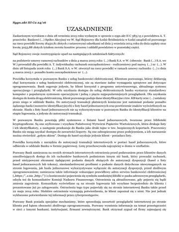 Sygn.akt III Ca 24/16 UZASADNIENIE Zaskarżonym wyrokiem z dnia 28 września 2015 roku wydanym w sprawie o sygn.akt II C 383/15 z powództwa A. T. przeciwko Bankowi (...) Spółce Akcyjnej we W. Sąd Rejonowy dla Łodzi-Śródmieścia w Łodzi zasądził od pozwanego na rzecz powódki kwotę 18450,81 złotych z ustawowymi odsetkami od dnia 5 września 2014 roku do dnia zapłaty oraz kwotę 3053,88 złotych tytułem zwrotu kosztów procesu i oddalił powództwo w pozostałej części. Sąd Rejonowy swoje rozstrzygnięcie oparł na następujących ustaleniach faktycznych: na podstawie umowy ramowej rachunków z dnia 4 marca 2003 roku (...) Bank S.A. w W. (obecnie: Bank (...) S.A. we W.) prowadził dla powódki A. T. indywidualny rachunek oszczędnościowo - rozliczeniowy pod nazwą (...) nr (...). W dniu 28 listopada 2006 roku (...) Bank S.A. w W. otworzył na rzecz powódki w ramach umowy rachunku (...) z dnia 4 marca 2003 r. ponadto konto oszczędnościowe nr (...). Powódka korzystała w pozwanym Banku z usług bankowości elektronicznej. Klientom pozwanego, którzy deklarują chęć korzystania z usług bankowości elektronicznej, nie są stawiane żadne wymagania sprzętowe ani dotyczące oprogramowania. Bank sugeruje jedynie, by klient korzystał z programu antywirusowego, aktualnego systemu operacyjnego i przeglądarki. W celu uzyskania dostępu do usług elektronicznych banku wystarczy standardowy komputer z popularnym systemem operacyjnym i jedną z pięciu najpopularniejszych przeglądarek. Dla uzyskania dostępu do konta drogą elektroniczną, klient pozwanego podaje dane identyfikacyjne z tzw. KB karty oraz (...) ustalony przez niego w oddziale Banku. Do autoryzacji transakcji płatniczych konieczne jest natomiast podanie ponadto żądanego hasła (numerów identyfikacyjnych) z listy haseł jednorazowych oraz powtórzenie znaków wyświetlonych na ekranie. Hasła z listy haseł jednorazowych nie są wykorzystywane w pozwanym Banku do identyfikacji klientów na etapie logowania, a jedynie do autoryzacji transakcji. W pozwanym Banku powstają pliki systemowe z listami haseł jednorazowych, tworzone przez biblioteki kryptograficzne. Są one szyfrowane i wysyłane Państwowej Wytwórni Papierów Wartościowych, która drukuje listy i ich identyfikatory, a następnie przekazuje do Banku jako druki tajne w tzw. bezpiecznych kopertach. Pracownicy Banku nie mogą uzyskać dostępu do zawartości koperty. Są one zabezpieczone przez podejrzeniem, a ich naruszenie można stwierdzić „gołym okiem”. Dostęp do haseł uzyskuje jedynie klient - posiadacz listy. Powódka korzystała z narzędzia do autoryzacji transakcji internetowych w postaci haseł jednorazowych, które odbierała w oddziale Banku w formie papierowej. Listę przechowywała najczęściej w domu w szufladzie. Pozwany Bank zamieszcza na swoich stronach internetowych ostrzeżenia przed podawaniem przez klientów danych umożliwiających dostęp do ich rachunków bankowych podmiotom innym niż bank, który prowadzi rachunek, przed nietypowymi ekranami żądającymi podania danych służących do autoryzacji dyspozycji (haseł z listy haseł jednorazowych lub tokena), niestandardowymi prośbami o podanie danych dotychczas niewymaganych na stronie logowania, jak hasła jednorazowe wykorzystywane wyłącznie do autoryzacji dyspozycji, przed złośliwym oprogramowaniem; zamieszcza także informacje wskazujące prawidłowy adres serwisu bankowości elektronicznej („https:/”, a nie „http:/”) i o konieczności pojawienia się symbolu zamkniętej kłódki w pasku adresowym przeglądarki, odsyła też do komunikatów Komisji Nadzoru Finansowego. Ostrzeżenia są aktualizowane, gdy pojawia się bądź zmienia zagrożenie. Komunikaty wyświetlane są na stronie logowania lub wysyłane bezpośrednio do klienta i prezentowane już po zalogowaniu. Ostrzeżenia tego typu pojawiały się na stronie internetowej Banku także przed 22 maja 2014 roku. Niektóre ostrzeżenia wymagają potwierdzenia, że klient zapoznał się z nimi. Nie jest jednak wykluczone potwierdzenie tej informacji przez cyberprzestępców. Pozwany Bank posiada specjalne mechanizmy, które sprawdzają zawartość przeglądarki internetowej po stronie klienta pod kątem obecności złośliwego oprogramowania. Pozwany wymienia informacje na temat przestępczości w sieci z innymi bankami, instytucjami, firmami zewnętrznymi. Bank otrzymał sygnał od firmy zajmującej się bezpieczeństwem w cyberprzestrzeni, że w dniach 22 -23 maja 2014 roku pojawiła się nowa konfiguracja złośliwego oprogramowania. W dniu 22 maja 2014 roku powódka dziewięciokrotnie, a w dniu 23 maja 2014 roku - jednokrotnie, bezskutecznie próbowała logować się, by uzyskać dostęp do swoich rachunków w pozwanym Banku za pośrednictwem Internetu. W dniu 23 maja 2014 r. o godzinie 12:05:41 w serwisie powódki pozwany wyświetlił nowy komunikat bezpieczeństwa dotyczący zagrożenia w sieci. Gdy powódka logowała się do konta w dniu 23 maja 2014 r. nie widziała żadnych ostrzeżeń. Na stronie, która wyświetlała się po wpisaniu adresu strony internetowej Banku, powódka podawała login i hasło (dane z KB Karty i (...)), lecz strona zawieszała się, a po pewnym czasie ukazywała się informacja, że nie można uzyskać połączenia z Bankiem. Na żądanie wyświetlone na stronie internetowej powódka przynajmniej dwukrotnie podała też hasło z listy haseł jednorazowych, będącej w jej posiadaniu, jednak w dniach 22 i 23 maja 2014 roku nie uzyskała dostępu do rachunków i nie dokonywała na nich żadnych operacji. W dniu 22 maja 2014 roku o godzinie 10:43:50 rachunek oszczędnościowy powódki nr (...) został obciążony na rzecz posiadacza rachunku o numerze (...) 0000 0001 2340 (...), posługującego się nazwiskiem V. A., kwotą 9.800 zł. W dniu 23 maja 2014 r. o godzinie 12:09:00 rachunek oszczędnościowy powódki nr (...) został obciążony na rzecz posiadacza rach