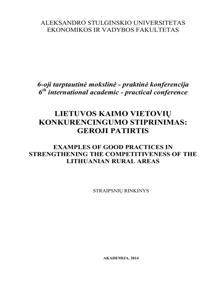 ALEKSANDRO STULGINSKIO UNIVERSITETAS EKONOMIKOS IR VADYBOS FAKULTETAS 6-oji tarptautinė mokslinė - praktinė konferencija 6th international academic - practical conference LIETUVOS KAIMO VIETOVIŲ KONKURENCINGUMO STIPRINIMAS: GEROJI PATIRTIS EXAMPLES OF GOOD PRACTICES IN STRENGTHENING THE COMPETITIVENESS OF THE LITHUANIAN RURAL AREAS STRAIPSNIŲ RINKINYS AKADEMIJA, 2014 ISSN 2029-1663 ISSN 2351-6909 (Online) Konferencijos organizacinis komitetas: Pirmininkė: Asist. Renata Lukė (Aleksandro Stulginskio universitetas) Nariai: Lekt. Alvydas Aleksandravičius (Aleksandro Stulginskio universitetas) Lekt. Rasa Merkienė (Aleksandro Stulginskio universitetas) Dokt. Rasa Pakeltienė (Aleksandro Stulginskio universitetas) Doc. dr. Gintarė Vaznonienė (Aleksandro Stulginskio universitetas) Konferencijos mokslinis komitetas: Pirmininkė: Prof. dr. Vilma Atkočiūnienė (Aleksandro Stulginskio Universitetas) Nariai: Lekt. Oana Raluca Glavan (Aleksandro Stulginskio Universitetas) Lekt. dr. Ilona Kiaušienė (Aleksandro Stulginskio Universitetas) Doc. dr. Stasė Navasaitienė (Aleksandro Stulginskio Universitetas) Doc. dr. Jan Žukovskis (Aleksandro Stulginskio Universitetas) Doc. dr. Artur Jacek Kożuch (Krokuvos žemės ūkio universitetas) Doc. dr. Janusz Sasak (Krokuvos Jogailos universitetas) Doc. dr. Beata Domanska-Szaruga (Sedlcos Gamtos ir humanitarinių mokslų universitetas) Doc. dr. Krystyna Kurowska (Varmijos ir Mozūrijos universitetas) Doc. dr. Wioletta Sylvia Wereda (Varšuvos Karo technologijos universitetas) Prof. habil.dr. Piotr Senkus (Poznanės Gyvybės mokslų universitetas Prof. habil. dr. Renata Marks-Bielska (Varmijos ir Mozūrijos universitetas) Konferencijos praktinis komitetas: Pirmininkas: Jonas Samoška (Tauragės rajono, Mažonų seniūnija) Nariai: Guoda Burokienė (Lietuvos kaimo bendruomenių sąjunga) Rimantas Čiūtas (Kaimo regioninės plėtros centras, Aleksandro Stulginskio universitetas) Petras Geštautas (Lietuvos savivaldybių seniūnų asociacija) Klavdija Stepanova (VVG tinklas) Straipsniai recenzuoti mokslinio ir praktinio komiteto recenzentų. Spausdinta iš autorių pateiktų straipsnių originalų. Dėkingi Lietuvos mokslo tarybai už paramą, sutarties Nr. MIP-004/2013. Gerbiamos visos ES kalbos. © Aleksandro Stulginskio universitetas, 2014 PRATARMĖ „Praktika nelaukia, kol mes sukursime instrumentarijų ją išanalizuoti, įvertinti, pertvarkyti. Mūsų uždavinys – sukurti idealizuotą ateities modelį ir praktiką pasukti į jo vėžes. Tuo išvengtume išbandymų kelyje aklų paieškų ir neišvengiamų klaidų. Žmogui ir visuomenei tai per didelė prabanga. Bet ir čia slypi kiti povandeniniai rifai – lengva paskęsti dogmatizmo baloje. Tokių pavyzdžių istorija pateikė daugiau negu reikia...“ /Mečislovas Treinys „Tautos ir jos žemės jungtis“, 2011, p.253 / Mokslinių praktinių konferencijų organizavimo Aleksandro Stulginskio universitete patirtis parodė, kad gerosios praktikos pavyzdžių sklaida, mokslininkų ir praktikų diskusijos yra vieni iš efektyvių būdų, padedantys rasti geriausius Lietuvos kaimo vietovių vystymo bei jų konkurencingumo stiprinimo sprendimus. Kaimo plėtros veikėjų gebėjimai kartu veikti ir sistemingai spręsti kaimo ekonomines, socialines, kultūrines ir aplinkosaugines problemas, surasti savojo kaimo vietą bendroje teritorinėje sąrangoje, parodyti savosios kaimo vietovės reikšmę ir gyvybingumą regiono, šalies, ES, pasaulio kontekste suformuoja konkurencingą vietovę – patrauklią gyventi, dirbti ir investuoti. Konferencijos tikslas – skleisti mokslinių tyrimų rezultatus ir kaimo socialinės infrastruktūros vystymosi valdymo gerąją patirtį skatinant partnerystę ir bendradarbiavimo ryšius tarp seniūnijos ir kaimo bendruomenės, tobulinant seniūnijos, savivaldybės, regiono vidaus administravimą, kaimo vietovių gyventojus įtraukiant į socialinės infrastruktūros paslaugų organizavimą ir teikimą, ugdant kaimo gyventojų pilietiškumą, tautiškumą ir verslumą, kuriant palankias galimybes kaimo ekonomikai vystyti. 2014 m. konferencija prasiplėtė iki dviejų dienų tarptautinės mokslinės praktinės konferencijos. Konferencijoje kaimo bendruomenių lyderiai, jaunimas – būsimi kaimo plėtros administratoriai, Lietuvos ir užsienio mokslininkai pristato kaimo socialinės infrastruktūros projektų gerąją patirtį. Vyrauja kaimo socialinės infrastruktūros atnaujinimo temos: viešųjų erdvių (pvz., sporto aikštynų, aikščių, vietos produktų pardavimo vietų) kaime kūrimas ir tradicinio kraštovaizdžio išsaugojimas; viešųjų pastatų atnaujinimas ir novatoriškas pritaikymas kaimo bendruomenės laisvalaikio, sporto ir kultūrinės veiklos poreikiams bei viešosioms paslaugoms teikti; poilsio zonų ir turizmo viešosios infrastruktūros (dviračių bei pėsčiųjų takai, paplūdimiai, prieplaukos, poilsio ir sustojimo aikštelės) vystymas; informacinių technologijų ir vietos išteklių panaudojimas teikiant kaimo socialinės infrastruktūros paslaugas. jaunimo laisvalaikio užimtumo ir savanoriško užsiėmimo organizavimas. Konferencijos dalyviai diskutuos ir ieškos atsakymų į klausimą: kas plėtoja kaimo socialinę infrastruktūrą, ar darni bendruomenė yra kaimo socialinės infrastruktūros vystymą suponuojantis veiksnys, kaip novatoriškai valdyti kaimo socialinę infrastruktūrą, kokie pokyčių valdymo metodai padeda pasiekti naują kokybę, kaip stiprinti kaimo vietovių konkurencingumą, kaip kurti patrauklią gyventi ir ilsėtis, dirbti ir investuoti kaimo vietovę. Priimdami kaimo vietovių pokyčių valdymo sprendimus vadovaukimės pagrindiniu konferencijos credo: kaimo socialinės infrastruktūra – gerovės pagrindas. prof. dr. Vilma Atkočiūnienė Verslo ir kaimo plėtros vadybos institutas, Ekonomikos ir vadybos fakultetas TURINYS PRATARMĖ ..............................................................................