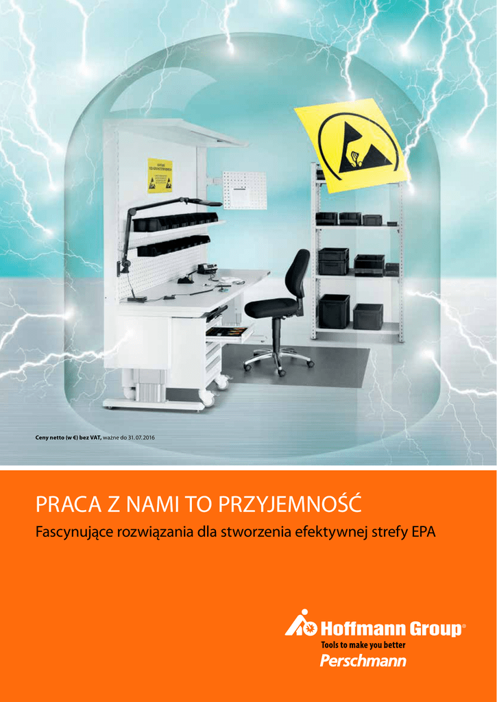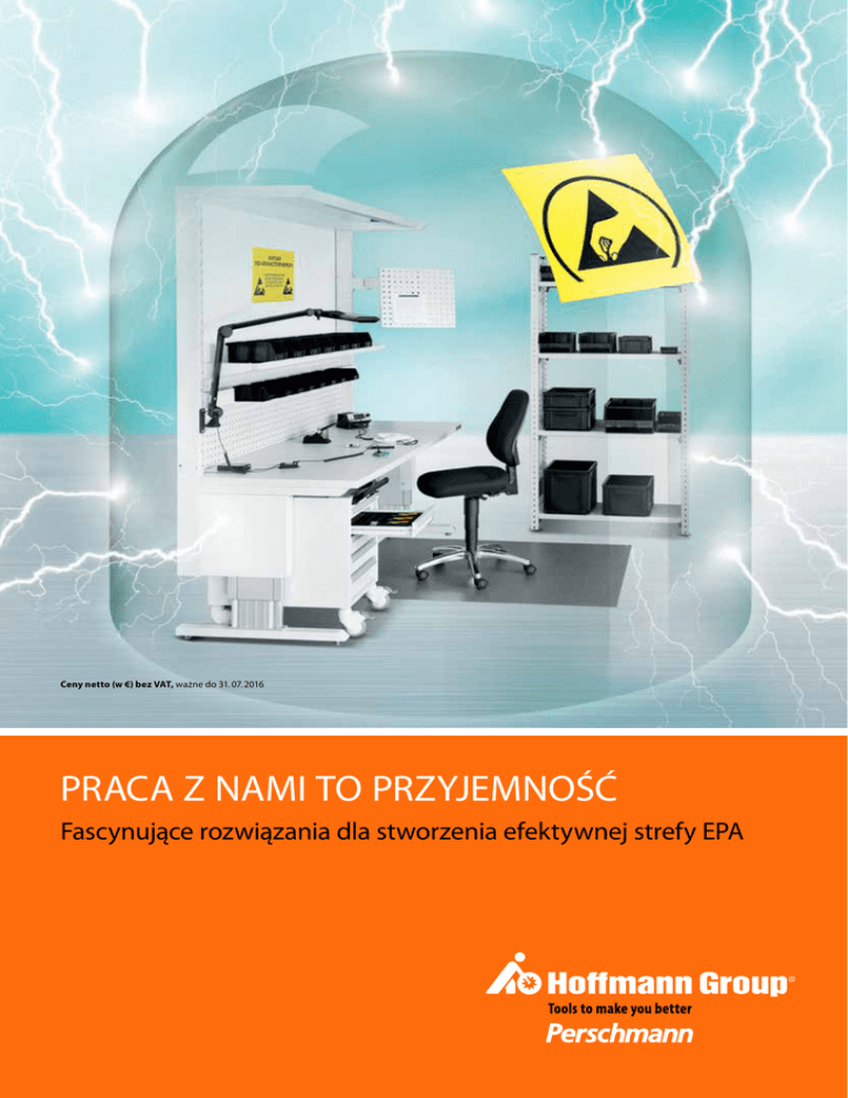 Ceny netto (w €) bez VAT, ważne do 31. 07. 2016 PRACA Z NAMI TO przyjemność Fascynujące rozwiązania dla stworzenia efektywnej strefy EPA Wyposażenie warsztatów: poradnik ESD www.hoffmann-group.com CO TO WŁAŚCIWIE JEST ESD? Jako ESD (ang. Elektrostatic Discharge) określa się wyładowanie elektrostatyczne. Wskutek dużych różnic potencjałów powstaje iskra albo przebicie, które wytwarza na urządzeniach elektronicznych duże impulsy napięciowe. Każdy z nas spotkał się z ESD. Najbardziej znanym objawem jest uczucie porażenia elektrycznego. Wiele wyładowań elektrostatycznych mieści się jednak poniżej progu odczuwalności człowieka, które mimo to mogą być szkodliwe dla elementów elektronicznych. Człowiek odczuwa wyładowanie wynoszące min. ok. 3 000 V. Natomiast już 30 V wystarcza, aby zniszczyć element półprzewodnikowy. Znak symbolizujący zagrożenie dla części przez ESD (wyładowania elektrostatyczne). ESD = Electrostatic Discharge Wyładowanie elektrostatyczne powstające pomiędzy naładowanymi ciałami wskutek bezpośredniego kontaktu lub przebicia. ESDS = Electrostatic Discharge Sensitive Devices Urządzenia, które mogą zostać uszkodzone przez elektrostatyczne rozładowania przy obróbce albo transporcie. EPA = Electrostatic Protected Area Obszar pracy wyposażony w środki ochrony przed ESD, w którym można używać urządzenia czułe na wyładowania elektrostatyczne bez obawy o ich uszkodzenie. 2 Symbol komponentów chroniących przed ESD. Spis treści Stanowiska robocze �������������������������������8 Wyposażenie stanowisk roboczych ���� 10 Stoły warsztatowe �������������������������������� 15 Wyposażenie stołów warsztatowych������������������������������������������ 16 Szafki narzędziowe ������������������������������ 17 Szafy systemowe ���������������������������������� 19 Wyposażenie ������������������������������������������ 20 Regały�������������������������������������������������������� 22 Maty podłogowe������������������������������������ 23 eForm���������������������������������������������������������� 26 Krzesła warsztatowe obrotowe/taborety������������������������������ 27 Uziemianie personelu ������������������������ 28 Moduły uziemiające ���������������������������� 29 Oznakowania������������������������������������������ 31 Stanowiska do testowania / omomierze�������������������� 32 Mikroskopy �������������������������������������������� 33 Narzędzia wkrętakowe ���������������������� 34 Szczypce �������������������������������������������������� 36 Pęsety �������������������������������������������������������� 43 Wyposażenie warsztatów ���������������� 44 3 Wyposażenie warsztatów: poradnik ESD JAK POWSTAJe ESD? Ładunki elektrostatyczne powstają przy pocieraniu o siebie albo rozdzielaniu różnych materiałów. Przykłady powstawania ładunków przy rozdzielaniu: ̑̑chodzenie po podłodze z wykładziną z tworzywa sztucznego, ̑̑pocieranie o odzież syntetyczną, ̑̑przesuwanie pojemników plastikowych, www.hoffmann-group.com KIEDY ESD jest NIEBEZPIECZNE? Zagrożenie dla ludzi normalnie nie występuje. Jednak w zakładach przemysłu elektronicznego wyładowania elektrostatyczne mogą być niebezpieczne. Niekontrolowane wyładowania elektrostatyczne mogą spowodować całkowite uszkodzenie oraz wady ukryte podzespołów elektronicznych (elementy półprzewodnikowe), a w konsekwencji wysokie koszty z powodu: ̑̑rozwijanie taśm klejących, ̑̑przemieszczanie się przenośników taśmowych. ̑̑ awarii, ̑̑reklamacji, Następuje przejście ładunków na ciała o ładunku niższym. Może przy tym dojść nawet do powstania widocznych iskier. Można to zaobserwować przy dotknięciu uziemionego przedmiotu, np. grzejnika. Powstawaniu ładunków elektrostatycznych sprzyja niska wilgotność powietrza, dlatego powinna ona mieścić się w zakresie od 40% do 60%. Ładunki o takim samym znaku odpychają się. Jeżeli człowiek jest naładowany elektrostatycznie, wówczas dosłownie „włosy stają mu dęba”. 4 ̑̑napraw i wymiany, ̑̑utraty dobrej opini, ̑̑utraty klientów. Elementy elektroniczne wolno chwytać tylko posiadając osobiste wyposażenie ochronne ESD. CZTERY ZŁOTE ZASADY 1. Zawsze należy wychodzić z założenia, że wszystkie części aktywne są czułe na wyładowania elektrostatyczne. 2. Części elektronicznych należy dotykać tylko w strefach zabezpieczonych przed ESD (EPA) i tylko wtedy, gdy są właściwie uziemione. 3. Części czułe na wyładowania elektrostatyczne należy magazynować i transportować w poj