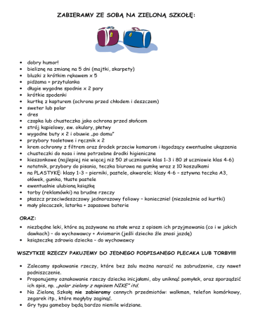 ZABIERAMY ZE SOBĄ NA ZIELONĄ SZKOŁĘ: • • • • • • • • • • • • • • • • • • • • • • dobry humor! bieliznę na zmianę na 5 dni (majtki, skarpety) bluzki z krótkim rękawem x 5 pidŜama + przytulanka długie wygodne spodnie x 2 pary krótkie spodenki kurtkę z kapturem (ochrona przed chłodem i deszczem) sweter lub polar dres czapka lub chusteczka jako ochrona przed słońcem strój kąpielowy, ew. okulary, płetwy wygodne buty x 2 i obuwie „po domu” przybory toaletowe i ręcznik x 2 krem ochronny z filtrem oraz środek przeciw komarom i łagodzący ewentualne ukąszenia chusteczki do nosa i inne potrzebne środki higieniczne kieszonkowe (najlepiej nie więcej niŜ 50 zł uczniowie klas 1-3 i 80 zł uczniowie klas 4-6) notatnik, przybory do pisania, teczka biurowa na gumkę wraz z 10 koszulkami na PLASTYKĘ: klasy 1-3 – pierniki, pastele, akwarele; klasy 4-6 – sztywna teczka A3, ołówek, gumka, tłuste pastele ewentualnie ulubioną ksiąŜkę torby (reklamówki) na brudne rzeczy płaszcz przeciwdeszczowy jednorazowy foliowy – koniecznie! (niezaleŜnie od kurtki) mały plecaczek, latarka + zapasowe baterie ORAZ: • • niezbędne leki, które są zaŜywane na stałe wraz z opisem ich przyjmowania (co i w jakich dawkach) – do wychowawcy + Aviomarin (jeśli dziecko źle znosi jazdę) ksiąŜeczkę zdrowia dziecka – do wychowawcy WSZYTKIE RZECZY PAKUJEMY DO JEDNEGO PODPISANEGO PLECAKA LUB TORBY!!!! • • • • Zalecamy spakowanie rzeczy, które bez Ŝalu moŜna narazić na zabrudzenie, czy nawet podniszczenie. Proponujemy oznakowanie rzeczy dziecka inicjałami, aby uniknąć pomyłek, oraz sporządzić ich spis, np. „polar zielony z napisem NIKE” itd. Na Zieloną Szkołę nie zabieramy cennych przedmiotów: walkman, telefon komórkowy, zegarek itp., które mogłyby zaginąć. Gry typu gameboy będą bardzo niemile widziane.