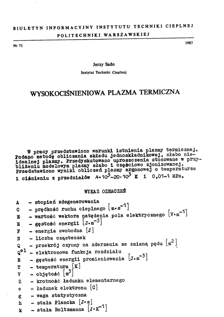 W pracy przedstawiono warunki i s t n i e n i a plazmy termicznej«,
