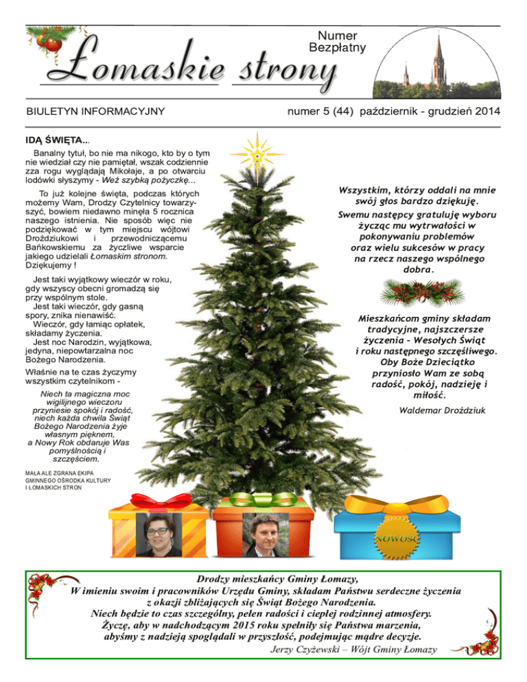 Łomaskie strony Numer Bezpłatny BIULETYN INFORMACYJNY numer 5 (44) październik - grudzień 201 4 IDĄ ŚWIĘTA.. . Banalny tytuł, bo nie ma nikogo, kto by o tym nie wiedział czy nie pamiętał, wszak codziennie zza rogu wyglądają Mikołaje, a po otwarciu lodówki słyszymy - Weź szybką pożyczkę... To już kolejne święta, podczas których możemy Wam, Drodzy Czytelnicy towarzyszyć, bowiem niedawno minęła 5 rocznica naszego istnienia. Nie sposób więc nie podziękować w tym miejscu wójtowi Droździukowi i przewodniczącemu Bańkowskiemu za życzliwe wsparcie jakiego udzielali Łomaskim stronom. Dziękujemy ! Jest taki wyjątkowy wieczór w roku, gdy wszyscy obecni gromadzą się przy wspólnym stole. Jest taki wieczór, gdy gasną spory, znika nienawiść. Wieczór, gdy łamiąc opłatek, składamy życzenia. Jest noc Narodzin, wyjątkowa, jedyna, niepowtarzalna noc Bożego Narodzenia. Właśnie na te czas życzymy wszystkim czytelnikom Niech ta magiczna moc wigilijnego wieczoru przyniesie spokój i radość, niech każda chwila Świąt Bożego Narodzenia żyje własnym pięknem, a Nowy Rok obdaruje Was pomyślnością i szczęściem. Wszystkim, którzy oddali na mnie swój głos bardzo dziękuję. Swemu następcy gratuluję wyboru życząc mu wytrwałości w pokonywaniu problemów oraz wielu sukcesów w pracy na rzecz naszego wspólnego dobra. Mieszkańcom gminy składam tradycyjne, najszczersze życzenia - Wesołych Świąt i roku następnego szczęśliwego. Oby Boże Dzieciątko przyniosło Wam ze sobą radość, pokój, nadzieję i miłość. Waldemar Droździuk MAŁA ALE ZGRANA EKI PA GMI NNEGO OŚRODKA KULTURY I ŁOMASKI CH STRON Drodzy mieszkańcy Gminy Łomazy, Wimieniu swoim i pracowników Urzędu Gminy, składam Państwu serdeczne życzenia z okazji zbliżających się Świąt Bożego Narodzenia. Niech będzie to czas szczególny, pełen radości i ciepłej rodzinnej atmosfery. Życzę, aby w nadchodzącym 2015 roku spełniły się Państwa marzenia, abyśmy z nadzieją spoglądali w przyszłość, podejmując mądre decyzje. Jerzy Czyżewski – Wójt Gminy Łomazy str 2 X - XII 201 4 INFO R MA CJE Łomaskiestrony URZĄD GMINY W ŁOMAZACH NOWE WŁADZ E GMI NY Wójt - JERZY CZYŻEWSKI Wiceprzewodniczący Rady Gminy Przewodnicząca Rady Gminy - ANDRZEJ WIŃSKI - MAŁGORZATA DERLUKIEWICZ Jerzy Czyżewski - związany jest z gminą Łomazy od blisko 30 lat, wywodzi się bowiem z Jusaków-Zarzeki. Tam dorastał na gospodarstwie rolnym i, jak mówi, nieobca była mu ciężka praca, ale te doświadczenia nauczyły go pokory i tego, że w życiu na wszystko trzeba sobie zapracować. Ukończył Wydział Prawa i Administracji na Uniwersytecie Kardynała St. Wyszyńskiego w Warszawie oraz studia podyplomowe w Akademii Rozwoju Regionalnego na Uniwersytecie Warszawskim, kończąc je pracą pt. "Szanse i zagrożenia rozwoju Polski Wschodniej". Brał udział w licznych kursach, szkoleniach oraz Szanowni mieszkańcy gminy Łomazy, Pragnę serdecznie podziękować tym wszystkim, którzy wzięli udział w wyborach i przyczynili się do tak wysokiej frekwencji zarówno w pierwszej jak i drugiej turze. Chciałbym zauważyć, że efektem minionej kampanii wyborczej oprócz zmian w składzie rady gminy oraz na stanowisku wójta gminy Łomazy jest wyraźnie zauważalna, zwiększona aktywność społeczna. Poznałem w tym czasie wiele wartościowych osób, które już aktywnie działają na rzecz naszej gminy lub są otwarte na działanie w naszej lokalnej społeczności. konferencjach m. in. z tematyki pozyskiwania funduszy unijnych, zamówień publicznych oraz ekonomicznego zarządzania. W trakcie studiów podjął pracę w jednostce samorządu terytorialnego w Dzielnicy Bemowo m. st. Warszawy, gdzie przez ponad 3 lata nabierał doświadczenia w administracji samorządowej. Administrował nieruchomościami publicznymi, biorąc udział w przetargach publicznych i współorganizował imprezy masowe. Dzięki temu poznał od podstaw realia działania jednostek samorządowych. Małgorzata Derlukiewicz - 35 lat, matka 4 córek, mieszka w miejscowości Jusaki-Zarzeka, gdzie wraz z mężem prowadzi gospodarstwo rolne. Od blisko 20 lat udziela się też jako wokalistka w grupach muzycznych. Obecnie współpracuje z Agencją Muzyczną z Włodawy. Pasjonuje się dekoratorstwem i rękodziełem, wystawiając swoje prace na licznych kiermaszach. Na pierwszym miejscu stawia rodzinę, lecz przyjętą funkcję traktuje z odpowiedzialnością i zaangażowaniem. Do rady kandydowała z listy KWW Aktywna Gmina w okręgu nr 10. Serdecznie gratuluję radnym, którzy w tej kadencji uzyskali mandat. Przed nami cztery lata wytężonej pracy, którą powinniśmy wykonywać zgodnie z zasadą: słuchać ludzi i zmieniać na lepsze nasze najbliższe otoczenie dla dobra mieszkańców. Chciałbym również podziękować ustępującemu wójtowi. 23 lata potwierdzają, że cieszył się zaufaniem mieszkańców Naszej gminy. Wielu włodarzy życzyłoby sobie tak długiego urzędowania. Dziękuję w imieniu swoim oraz mieszkańców! Pragnę podkreślić, że przychodzę z intencjami współpracy. Deklaruję otwartość na wszelkie nowe pomysły, które mogą przyczynić się do poprawienia poziomu życia w naszej gminie, jak i zmiany wizerunku. Swoją pracą i zaangażowaniem będę starał się udowodnić, że dokonali Państwo właściwego wyboru. Jestem do Państwa dyspozycji. Z poważaniem Jerzy Czyżewski Wójt Gminy Łomazy przyjmuje interesantów w Urzędzie Gminy w każdy: wtorek w godz. 8.00 - 1 0.00 czwartek w godz. 1 0.00 -1 2.00 W sprawach b. pilnych - w godzinach urzędowania lub po wcześniejszym ustaleniu terminu w sekretariacie Urzędu Gminy bądź telefonicznie pod numerem tel. 83 341 70 03 Przewodnicząca Rady Gminy pełni dyżur w Urzędzie Gminy w każdy: wtorek i piątek w godz. 9.00 -11 .00 Łomaskiestrony INFO R MA CJE X - XII 201 4 str 3 Radości przy świątecznym stole i ciepła w najbliższy