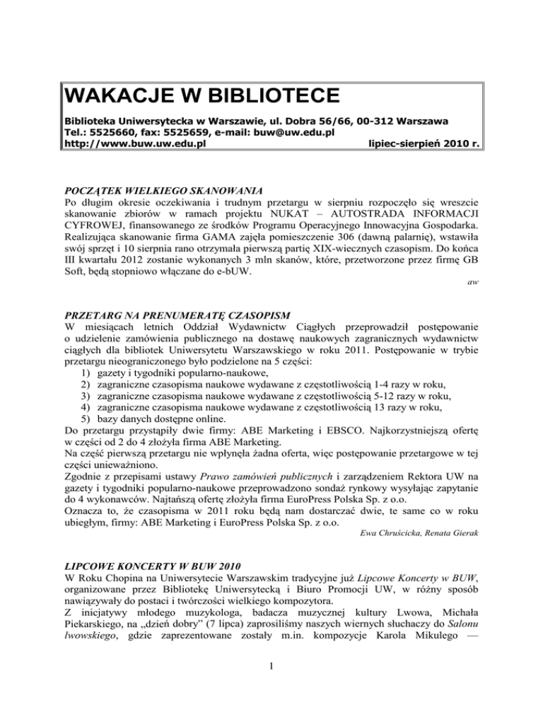 WAKACJE W BIBLIOTECE Biblioteka Uniwersytecka w Warszawie, ul. Dobra 56/66, 00-312 Warszawa Tel.: 5525660, fax: 5525659, e-mail: [email protected] http://www.buw.uw.edu.pl lipiec-sierpień 2010 r. POCZĄTEK WIELKIEGO SKANOWANIA Po długim okresie oczekiwania i trudnym przetargu w sierpniu rozpoczęło się wreszcie skanowanie zbiorów w ramach projektu NUKAT – AUTOSTRADA INFORMACJI CYFROWEJ, finansowanego ze środków Programu Operacyjnego Innowacyjna Gospodarka. Realizująca skanowanie firma GAMA zajęła pomieszczenie 306 (dawną palarnię), wstawiła swój sprzęt i 10 sierpnia rano otrzymała pierwszą partię XIX-wiecznych czasopism. Do końca III kwartału 2012 zostanie wykonanych 3 mln skanów, które, przetworzone przez firmę GB Soft, będą stopniowo włączane do e-bUW. aw PRZETARG NA PRENUMERATĘ CZASOPISM W miesiącach letnich Oddział Wydawnictw Ciągłych przeprowadził postępowanie o udzielenie zamówienia publicznego na dostawę naukowych zagranicznych wydawnictw ciągłych dla bibliotek Uniwersytetu Warszawskiego w roku 2011. Postępowanie w trybie przetargu nieograniczonego było podzielone na 5 części: 1) gazety i tygodniki popularno-naukowe, 2) zagraniczne czasopisma naukowe wydawane z częstotliwością 1-4 razy w roku, 3) zagraniczne czasopisma naukowe wydawane z częstotliwością 5-12 razy w roku, 4) zagraniczne czasopisma naukowe wydawane z częstotliwością 13 razy w roku, 5) bazy danych dostępne online. Do przetargu przystąpiły dwie firmy: ABE Marketing i EBSCO. Najkorzystniejszą ofertę w części od 2 do 4 złoŜyła firma ABE Marketing. Na część pierwszą przetargu nie wpłynęła Ŝadna oferta, więc postępowanie przetargowe w tej części uniewaŜniono. Zgodnie z przepisami ustawy Prawo zamówień publicznych i zarządzeniem Rektora UW na gazety i tygodniki popularno-naukowe przeprowadzono sondaŜ rynkowy wysyłając zapytanie do 4 wykonawców. Najtańszą ofertę złoŜyła firma EuroPress Polska Sp. z o.o. Oznacza to, Ŝe czasopisma w 2011 roku będą nam dostarczać dwie, te same co w roku ubiegłym, firmy: ABE Marketing i EuroPress Polska Sp. z o.o. Ewa Chruścicka, Renata Gierak LIPCOWE KONCERTY W BUW 2010 W Roku Chopina na Uniwersytecie Warszawskim tradycyjne juŜ Lipcowe Koncerty w BUW, organizowane przez Bibliotekę Uniwersytecką i Biuro Promocji UW, w róŜny sposób nawiązywały do postaci i twórczości wielkiego kompozytora. Z inicjatywy młodego muzykologa, badacza muzycznej kultury Lwowa, Michała Piekarskiego, na „dzień dobry” (7 lipca) zaprosiliśmy naszych wiernych słuchaczy do Salonu lwowskiego, gdzie zaprezentowane zostały m.in. kompozycje Karola Mikulego — 1 monumentalna ballada op. 21 na fortepian czy scherzino i polonez na niezwyczajny skład trojga skrzypiec. Karol Mikuli – Ormianin z pochodzenia, głęboko związany z polską kulturą i Lwowem – w latach 1844–47 w ParyŜu pobierał lekcje u samego Fryderyka Chopina. Wykonano takŜe pieśni i utwory fortepianowe uczniów Mikulego, kompozytorów lwowskich: Stanisława Niewiadomskiego i Mieczysława Sołtysa. Na podkreślenie zasługuje fakt, iŜ ta mało znana muzyka wzbudziła zainteresowanie młodych wykonawców: pianistki Gabrieli Machowskiej, śpiewaczki Katarzyny Kalisz i znakomitego tria skrzypcowego: Anny Orlik, Marty Zalewskiej i Anny Betley. Lwowskie klimaty przybliŜał takŜe napisany z ogromnym ciepłem tekst o Lwowie Martina Pollacka (fragm. ksiąŜki Po Galicji) czytany z równą sympatią przez Andrzeja Ferenca. Kolejną wizytę złoŜyliśmy w ParyŜu. Tym razem (14 lipca) znakomite Lutosławski Piano Duo – Bartłomiej Wąsik i Emilia Sitarz – w swojej mistrzowskiej interpretacji w koncercie Salon paryski zaprezentowało – oryginalne i w opracowaniach – kompozycje Chopina i jego przyjaciół: Schumanna, Mendelssohna, Liszta. Fragmenty eseju Ryszarda Przybylskiego Cień jaskółki, opisujące paryskie Ŝycie muzyczne, przybliŜające sylwetki kompozytorów działających w ParyŜu w pierwszej połowie XIX wieku, podkreślające wyróŜniającą się na tym tle elegancką i subtelną postać Chopina, przeczytał Leszek Teleszyński. Na zakończenie lipcowego cyklu (21 lipca) z monograficznym koncertem wystąpił Artur Dutkiewicz, wykonując swój cykl Mazurków jazzowych. W ten sposób artysta nawiązał do chopinowskiej rocznicy. Mazurek, forma ukształtowana przez Chopina, tak mu bliska, inspiruje nadal wielu kompozytorów, takŜe tych, którzy na co dzień obracają się w sferze muzyki rodem z innego muzycznego świata. Mazurek to forma liryczna – warstwę słowną wypełniła więc poezja. Urywki z Kwiatów polskich Juliana Tuwima, te o polnych róŜach, bzie warszawskim i rezedzie, pełne tęsknoty i nostalgii, uczuć nieobcych Tuwimowi i Chopinowi – przeczytał Piotr Machalica. …o czym współorganizatorzy i pomysłodawcy cyklu z przyjemnością relacjonują i zapraszają juŜ na kolejne Lipcowe koncerty w BUW 2011 do gościnnej Biblioteki Uniwersyteckiej w Warszawie. Iwona Januszkiewicz-Rębowska, Piotr Bocian O ODKRYWANIU POTĘGI MOśLIWOŚCI... W czasie tegorocznych wakacji Dyrekcja Biblioteki Uniwersyteckiej po raz kolejny postanowiła zainwestować w rozwój swoich pracowników. W dniach 7-8 lipca oraz 26-27 sierpnia odbyło się szkolenie dla pracowników, którego tematem była „Osobista skuteczność w relacjach zawodowych”. Warsztaty prowadził, znany juŜ nam z wcześniejszych szkoleń, Marcin Markowski z firmy m2 Potęga MoŜliwości. Zarówno w lipcowej, jak i sierpniowej turze dwudniowego szkolenia brało udział po 12 pracowników Oddziału Udostępniania i Informacji Naukowej. Były to osoby pracujące w WypoŜyczalni, Czytelni Czasopism BieŜących i Mikroform, Czytelni Ogólnej oraz Sekcji Informacji i Dydaktyki. Tematy poruszane na szkoleniu były bardzo róŜne, tak jak róŜny jest nasz kontakt z czytelnikiem. Najlepiej ujął to Marek Michalski w swojej opinii nt. szkolenia pisząc, Ŝe pracę 