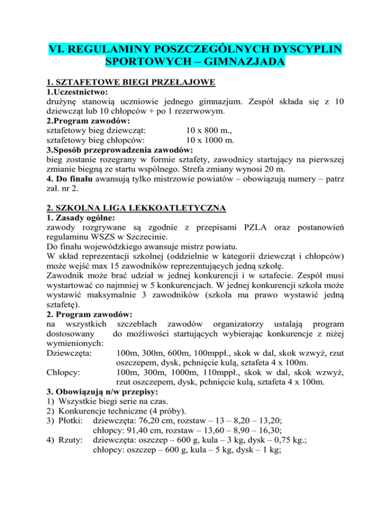 VI. REGULAMINY POSZCZEGÓLNYCH DYSCYPLIN SPORTOWYCH – GIMNAZJADA 1. SZTAFETOWE BIEGI PRZEŁAJOWE 1.Uczestnictwo: drużynę stanowią uczniowie jednego gimnazjum. Zespół składa się z 10 dziewcząt lub 10 chłopców + po 1 rezerwowym. 2.Program zawodów: sztafetowy bieg dziewcząt: 10 x 800 m., sztafetowy bieg chłopców: 10 x 1000 m. 3.Sposób przeprowadzenia zawodów: bieg zostanie rozegrany w formie sztafety, zawodnicy startujący na pierwszej zmianie biegną ze startu wspólnego. Strefa zmiany wynosi 20 m. 4. Do finału awansują tylko mistrzowie powiatów – obowiązują numery – patrz zał. nr 2. 2. SZKOLNA LIGA LEKKOATLETYCZNA 1. Zasady ogólne: zawody rozgrywane są zgodnie z przepisami PZLA oraz postanowień regulaminu WSZS w Szczecinie. Do finału wojewódzkiego awansuje mistrz powiatu. W skład reprezentacji szkolnej (oddzielnie w kategorii dziewcząt i chłopców) może wejść max 15 zawodników reprezentujących jedną szkołę. Zawodnik może brać udział w jednej konkurencji i w sztafecie. Zespół musi wystartować co najmniej w 5 konkurencjach. W jednej konkurencji szkoła może wystawić maksymalnie 3 zawodników (szkoła ma prawo wystawić jedną sztafetę). 2. Program zawodów: na wszystkich szczeblach zawodów organizatorzy ustalają program dostosowany do możliwości startujących wybierając konkurencje z niżej wymienionych: Dziewczęta: 100m, 300m, 600m, 100mppł., skok w dal, skok wzwyż, rzut oszczepem, dysk, pchnięcie kulą, sztafeta 4 x 100m. Chłopcy: 100m, 300m, 1000m, 110mppł., skok w dal, skok wzwyż, rzut oszczepem, dysk, pchnięcie kulą, sztafeta 4 x 100m. 3. Obowiązują n/w przepisy: 1) Wszystkie biegi serie na czas. 2) Konkurencje techniczne (4 próby). 3) Płotki: dziewczęta: 76,20 cm, rozstaw – 13 – 8,20 – 13,20; chłopcy: 91,40 cm, rozstaw – 13,60 – 8,90 – 16,30; 4) Rzuty: dziewczęta: oszczep – 600 g, kula – 3 kg, dysk – 0,75 kg.; chłopcy: oszczep – 600 g, kula – 5 kg, dysk – 1 kg; 5) Młodzik i młodziczka rocznik 1998 i 1999. 4. Punktacja: osiągnięte w bezpośredniej rywalizacji wyniki przelicza się na punkty – wyłącznie wg kategorii młodzików. Na wynik drużyny składa się maksymalnie 12, a minimalnie 5 najlepszych rezultatów. 5. Obowiązuje komunikat – zgłoszenie – patrz zał. nr 3. 3.INDYWIDUALNE ZAWODY LEKKOATLETYCZNE 1. Uczestnictwo: startują uczniowie gimnazjów. 2. Konkurencje: Dziewczęta: 100mppł. (rozstaw płotków dla młodziczki), 100m, 300m, 600m, 1000m, skok w dal, skok wzwyż, kula - 3 kg., rzut oszczepem – 600 g., dysk (0,75 kg). Chłopcy: 110mppł. (rozstaw płotków dla młodzika), 100m, 300m, 1000m, 2000m, skok w dal, skok wzwyż, kula - 5 kg., rzut oszczepem – 600 g., dysk (1,0 kg). W skoku wzwyż w finale obowiązuje pierwsza wysokość dla dziewcząt – 130 cm, dla chłopców – 145 cm. 3. W każdym etapie zawodów zawodniczka/zawodnik ma prawo startu w dwóch konkurencjach oprócz biegających 600m, 1000m i 2000m – dla nich start w jednej konkurencji. 4. Obowiązuje zgłoszenie w/g wzoru – patrz zał. nr 4 – jest to warunek uczestnictwa. 5. Zawody wojewódzkie - do finałów awansują mistrzowie powiatów + 4 osoby w każdej konkurencji z najlepszymi wynikami ze wszystkich zawodów powiatowych. 6. W wyjątkowych sytuacjach WSZS ma prawo kwalifikować do finału osoby, które w wyniku zdarzeń losowych nie mogły uczestniczyć w eliminacjach lub nie uzyskały awansu. Warunkiem jest pisemny wniosek z wiarygodnym uzasadnieniem złożony przez szkołę minimum 7 dni przed terminem imprezy finałowej, a dotyczyć może wyłącznie członków kadry wojewódzkiej – co potwierdzi ZZLA. 7. Do zawodów wojewódzkich obowiązuje komunikat – zgłoszenie do zawodów na podstawie przeprowadzonych mistrzostw powiatów – patrz zał. nr 4. Podajemy obowiązkowo wyniki 4 najlepszych z każdej konkurencji. Termin zgłoszenia – minimum 10 dni przed finałem (decyduje data stempla pocztowego). Zgłoszenia niepełne lub po terminie nie będą uwzględnione. 4. TENIS STOŁOWY – drużynowy „MINI SUPER LIGA”. 1.Uczestnictwo: zawody rozgrywane są zgodnie z przepisami PZTS. W zawodach biorą udział drużyny dziewcząt i chłopców. Drużynę stanowią uczniowie jednego gimnazjum. Zespół liczy 2 dziewczynki lub 2 chłopców. Do gry podwójnej można zgłosić dodatkowo trzecią osobę, która w następnym meczu może być zawodnikiem podstawowym. 2.Sposób przeprowadzenia zawodów: kolejność gier jest następująca: I RZUT A–X B–Y II RZUT Gra podwójna III RZUT A–Y B–X Mecz rozgrywany jest do 3 wygranych punktów. 3. Punktacja: system wyłonienia mistrza uzależniony jest od liczby uczestniczących drużyn. 4. Do finału wojewódzkiego awansują po dwa najlepsze zespoły z 4 imprez regionalnych. 5. W poszczególnych etapach zawodów rozstawianie mistrzów gmin (na zawodach powiatowych), w regionie jeśli system pucharowy to losowanie, a w Finałach Wojewódzkich rozstawianie mistrzów regionów i do nich dolosowywanie pozostałych zespołów. 6. W finale wyłanianie miejsc I–IV i V–VIII. System zawodów „Do dwóch przegranych – z prawej I i II z lewej III i pozostałe miejsca”. W zawodach powiatowych i regionalnych system dowolny: pucharowy, każdy z każdym, do 2 przegranych – o czym decyduje organizator imprezy. 5. KOSZYKÓWKA 1. Uczestnictwo: drużynę stanowią uczniowie jednego gimnazjum – 12 zawodników. 2. Przepisy gry: zawody rozgrywane są zgodnie z przepisami PZKosz – oprócz patrz pkt. 5. Jeżeli zespół rozgrywa dwa spotkania jednego dnia to czas gry 4 x 7,5 min. Zawody nie mogą się rozpocząć jeżeli zespół nie liczy minimum 8 graczy. W razie remisu zarządza się 5 minutowe dogrywki. Piłka dla dziewcząt nr 6, dla chłopców nr 7. 3. Punktacja w systemie zawodów liga lub „każdy z każdym”: a) za wygrane spotkanie 2 pkt., za przegrane 1 pkt. b) w przypadku równej ilości punktów decyduje : - lepszy stosunek kos