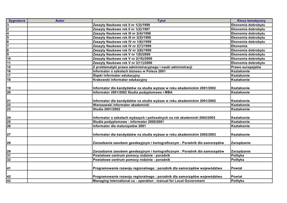 Tytuł Zeszyty Naukowe rok II nr 1(3)/1998 Zeszyty Naukowe rok II nr 1(2)/1997 Zeszyty Naukowe rok III nr 2(4)/1998 Zeszyty Naukowe rok III nr 3(5)/1998 Zeszyty Naukowe rok IV nr 1(6)/1999 Zeszyty Naukowe rok IV nr 2(7)/1999 Zeszyty Naukowe rok IV nr 3(8)/1999 Zeszyty Naukowe rok V nr 1(9)/2000 Zeszyty Naukowe rok V nr 2(10)/2000 Zeszyty Naukowe rok V nr 3(11)/2000 Z problematyki prawa administracyjnego i nauki administracji Informator o szkołach biznesu w Polsce 2001 Śląski informator edukacyjny Krakowski informator edukacyjny Klucz tematyczny Ekonomia dobrobytu Ekonomia dobrobytu Ekonomia dobrobytu Ekonomia dobrobytu Ekonomia dobrobytu Ekonomia Ekonomia dobrobytu Ekonomia dobrobytu Ekonomia dobrobytu Ekonomia dobrobytu Prawo europejskie Kształcenie Kształcenie Kształcenie 19 20 Informator dla kandydatów na studia wyższe w roku akademickim 2001/2002 Informator 2001/2002 Studia podyplomowe i MBA Kształcenie Kształcenie 21 22 23 Informator dla kandydatów na studia wyższe w roku akademickim 2001/2002 Warszawski informator akademicki Studia 2001/2002 Kształcenie Kształcenie Kształcenie 24 25 26 Informator o szkołach wyższych i policealnych na rok akademicki 2002/2003 Studia podyplomowe : informator 2000/2001 Informator dla maturzystów 2001 Kształcenie Kształcenie Kształcenie 27 Informator dla kandydatów na studia wyższe w roku akademickim 2002/2003 Kształcenie 28 Zarzadzanie zasobem geodezyjnym i kartograficznym : Poradnik dla samorządów Zarządzanie 29 31 32 Zarzadzanie zasobem geodezyjnym i kartograficznym : Poradnik dla samorządów Powiatowe centrum pomocy rodzinie : poradnik Powiatowe centrum pomocy rodzinie : poradnik Zarządzanie Polityka Polityka 41 Programowanie rozwoju regionalnego : poradnik dla samorządów województwa Powiat 42 43 Programowanie rozwoju regionalnego : poradnik dla samorządów województwa Managing International co - operation : manual for Local Government Powiat Polityka Sygnatura 3 2 4 5 6 7 8 9 10 11 15 16 17 18 Autor 44 52 56 Managing International co - operation : manual for Local Government Fundaments of corporate finance Money, banking and the economy Polityka Ekonomia dobrobytu Ekonomia dobrobytu 66 75 The Dc gardner Guide to International Capital Markets : dc gardner group PLC Accession negotiations : Poland on the road to the european union Ekonomia dobrobytu Unia Europejska 84 Podręczny słownik niemiecko-polski polsko-niemiecki 55 000 haseł i zwrotów Przebieg negocjacji o członkostwo Rzeczypospolitej Polskiej w Unii Europejskiej : Stan na 1 września 200 roku Tempus część I raport z realizacji programu tempus phare Tempus część II projekty wspólpracy międzyuczelnianej w polskich szkołach wyższych Almanach banków polskich Forum Zeszyt 1 Forum Zeszyt 1 Forum Zeszyt 1 Polityka społeczna i zatrudnienie Marketing : wybrane zagadnienia Encyklopedia gospodarki materiałowej Prace z zakresu handlu zagranicznego Prace z zakresu zarządzania Stopnie awansu zawodowego nauczyciela : dokumenty, komentarze, plan rozwoju zawodowego wzory pism Awans zawodowy nauczycieli : poradnik Wprowadzenie do ekonometrii w przykładach i zadaniach Wprowadzenie do ekonometrii w przykładach i zadaniach Wprowadzenie do ekonometrii w przykładach i zadaniach Międzynarodowe Standardy Rachunkowości Międzynarodowe Standardy Rachunkowości Międzynarodowe Standardy Rachunkowości Międzynarodowe Standardy Rachunkowości Międzynarodowe Standardy Rachunkowości Międzynarodowe Standardy Rachunkowości Międzynarodowe Standardy Rachunkowości Międzynarodowe Standardy Rachunkowości Międzynarodowe Standardy Rachunkowości Międzynarodowe Standardy Rachunkowości Słowniki 87 88 89 93 97 98 99 100 114 122 845 846 147 148 150 151 152 157 158 159 160 161 162 163 164 165 166 Unia Europejska Unia Europejska Unia Europejska Bankowość Unia Europejska Unia Europejska Unia Europejska Unia Europejska Marketing Gospodarka Handel Zarządzanie Oświata Oświata Ekonometria Ekonometria Ekonometria Rachunkowość Rachunkowość Rachunkowość Rachunkowość Rachunkowość Rachunkowość Rachunkowość Rachunkowość Rachunkowość Rachunkowość 167 208 212 213 219 224 225 226 227 228 229 230 252 262 263 267 Rewizja sprawozdań finansowych a rozwój podmiotów gospodarczych : referaty o komunikaty na II Doroczną Konferencję Audytingu Jachranka k. Warszawy, 22-24 listopada 2001 Finanse, banki i ubezpieczenia w Polsce u progu XXI wieku : tom II Bankowość materiały konferencyjne Poznań, 14-17 września 2000 roku Marketing : wybrane zagadnienia Statystyka matematyczna w zastosowaniach Banki w Polsce : Wyzwania i tendencje rozwojowe Finanse i bankowość a wejście Polski do Unii Europejskiej : cześć I Bankowość Rynki Finansowe Finanse i bankowość a wejście Polski do Unii Europejskiej : część II Finanse publiczne Finanse Przedsiębiorstw Finanse i bankowość - przekształcenia systemowe. Cz. 1 Finanse publiczne. System bankowy Finanse i bankowość - przekształcenia systemowe. Cz. 2 Rynek finansowy. Finanse przedsiębiorstw. Finanse ubezpieczeń Finanse i bankowość - dźwignie wzrostu gospodarczego. Cz. 1 Finanse publiczne. Bankowość i ubezpieczenia Finanse i bankowość - dźwignie wzrostu gospodarczego. Cz. 2 Rynki finansowe. Finanse przedsiębiorstw Współczesny bank Miedzynarodowe prawo handlowe Prawo cywilne : zbiór przepisów podstawowych Prawo gospodarcze Rzeczypospolitej Informator dla maturzystów 2002/2003 274 360 375 379 392 Studia z zakresu zarzadzania publicznego : materiały seminarium naukowego Ekonomia Polityka Świadomość Społeczna : materiały z konferencji naukowej poświeconej pamieci Profesora Jerzego Indraszkiewicza Samorząd terytorialny Atlas geograficzny dla szkół średnich Current Issues in the American Economy Argumenta Oeconomica Cracoviensia 396 397 489 Nowoczesne metody organizacji zarządzania; materiały z konferencji naukowj zorganizowanej z okazji Jubileuszu 70-lecia prof. dra hab. Jerzego Trzcien