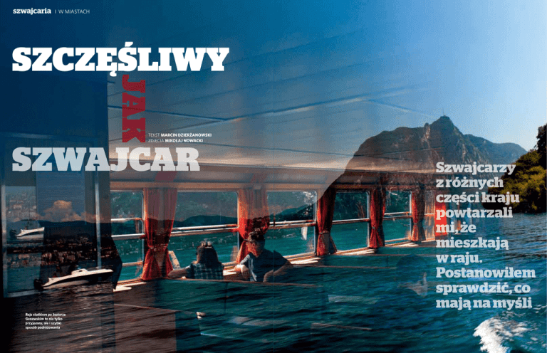szwajcaria ❘ w miastach jak szczęśliwy TEKST marcin dzierżanowski zdjęcia mikołaj nowacki szwajcar 62 National Geographic Traveler archiwum archiwum Rejs statkiem po Jeziorze Genewskim to nie tylko przyjemny, ale i szybki sposób podróżowania Szwajcarzy z różnych części kraju powtarzali mi, że mieszkają w raju. Postanowiłem sprawdzić, co mają na myśli szwajcaria ❘ w miastach Szwajcarski kanton Ticino od zawsze kojarzył się z rajem – tłumaczy mi Pa- tricia Carminati, moja przewodniczka po regionie. Chcesz? Pokażę ci inną utopię, nie mniej ciekawą – zachęca, prowadząc mnie do znajdującego się na tym samym wzgórzu Sanktuarium Sztuki Elisarion. Stworzył je pochodzący z Tallina malarz i poeta Elisar von Kupffer oraz jego życiowy partner filozof Eduard von Mayer. Założyli oni mistyczno-artystyczny ruch religijny o nazwie Klarismus („Jasność”), który skupiał głównie gejów i lesbijki. Może nie byłoby w tym nic nadzwyczajnego, gdyby nie fakt, że grupa działała w latach 20. ubiegłego wieku, w czasach kiedy niemal w całej Europie za kontakty homoseksualne wsadzało się ludzi do więzień. Niedawno namalowane przez Elisara freski przeniesiono z jego willi nad pobliskim jeziorem Maggiore na Monte Verità. Wyglądają dziwnie – coś w rodzaju mieszanki kościelnej polichromii i gejowskiego soft porno. – Mogło to powstać tylko w Szwajcarii – opowiada Patricia. W okolicach niewielkiego wzgórza pod Asconą żyło się spokojnie aż do 1900 r. Podobnie jak w innych wsiach i miastach włoskojęzycznego kantonu Ticino, ludzie byli tu może nie najbogatsi, ale porządni i w miarę szczęśliwi. W niedzielę chodzili do kościoła, by podziękować Najświętszej Panience za tegoroczne zbiory orzechów i wina, a po mszy ze swych glinianych boccalino (rodzaj tradycyjnych kubeczków do wina) popijali domowej roboty merlota zmieszanego z lemoniadą gassosa. I w przeciwieństwie do sąsiadów z niemieckojęzycznych kantonów Szwajcarii niezbyt przejmowali się dniem jutrzejszym. Kiedy na początku XX w. wzgórze pod Asconą zakupił Henry Oedenkoven, 25-letni syn holenderskich bogaczy, nic nie zwiastowało, że młodzieniec wywoła tu aż taki zamęt. Ot, kolejny bogaty świr, który bredzi coś o odkryciu „najbardziej energetycznego miejsca na ziemi”. Gdy jednak Henry ściągnął do swej posiadłości bogatych znajomych z Europy i ogłosił powstanie komuny o nazwie „Monte Verità”, wybuchł skandal. Do tego doszły plotki, że mieszkańcy chodzą bez ubrań, nie jedzą mięsa, w dodatku sypiają ze sobą w dowolnych konfiguracjach. Nazwano ich balabiott, czyli „nadzy tancerze”. – Opowieści sąsiadów wcale nie były pozbawione podstaw – mówi mi Lorenzo Sonognini, dyrektor kulturalno-rekreacyj64 National Geographic Traveler nego ośrodka Monte Verità, które mieści się dziś w tym miejscu. – Bez cienia przesady można powiedzieć, że to właśnie tutaj znajduje się kolebka światowego nudyzmu, wegetarianizmu, a nawet ruchu hipisowskiego i New Age. Ameryka miała swoje dzieci kwiaty, my ponad pół wieku wcześniej mieliśmy „nagich tancerzy – uśmiecha się Sonognini. I pokazuje mi zachowane pamiątki po prekursorach szalonej wolności: fragmenty sprzętów do ćwiczeń gimnastycznych, prysznice pod gołym niebem, domki, w których mieszkali członkowie dziwnej sekty, wreszcie jedyną w Europie plantację herbaty. Wkrótce sława Wzgórza Prawdy przekroczyła granicę Ascony, a nawet kantonu Ticino. Do „słonecznego sanatorium” zaczęli przyjeżdżać znani buntownicy początku wieku, m.in. pisarz Hermann Hesse, psychoanalityk Carl Jung czy dadaista Hugo Ball. – A pierwotnie zgorszeni mieszkańcy okolic zwietrzyli w całym zamieszaniu interes. Niedaleko osady zbudowali hotel, którego główną atrakcją była możliwość podglądania z okien nudystów. – Taki pierwszy w Europie peep-show – śmieje się Sonognini. Dziś na wzgórzu znajduje się hotel w stylu Bauhaus i muzeum, w którym można zobaczyć stare zdjęcia komuny. – W naszym dialekcie do teraz istnieje też słowo balabiott. Matki nazywają tak nastoletnie dzieci, które nie chcą się uczyć ani pracować – dodaje dyrektor, częstując mnie merlotem zmieszanym gasossą. Na szczęście ulubiony drink mieszkańców Ticino nie zmienił się od czasu Henry’ego. jeszcze w XVIII w. nazywała się Calprino i była małą wioską rybacką. Kiedy dwa wieki temu zaczęli tu przyjeżdżać turyści z Anglii i Szkocji, miejsce nazwali Paradiso. Sto lat temu władze kantonu zatwierdziły nową nazwę jako oficjalną. Jak się pani żyje w najszczęśliwszym kraju Europy? – pytam z kolei Corrine Seiler, emery- towaną historyk sztuki w Bernie. To miasto jest nieformalną stolicą Szwajcarii. Formalnej nie ma, tu jest tylko siedziba władz konfederacji. Mimo to 130-tysięczne miasto ma kameralny charakter. – Mówi pan o Szwajcarii? Cóż, nasza niemieckojęzyczna część jest zdecydowanie najszczęśliwsza! – z dumą zachwala swój region. – Moim zdaniem właśnie Berno jest kwintesencją szwajcarskości – dodaje. Corrine, mimo zaawansowanego wieku, może się pochwalić świetną formą. Dlatego proponuje, że pokaże mi miasto z perspektywy hulajnogi. To nowy sposób promocji Berna wspierany przez lokalne władze. Pojazdy można wypożyczyć m.in. na W Europie wielu nadal twierdzi, że głównym dworcu kolejowym. Dziwię się, że podróżowanie na tym dziwnym sprzęcie idzie jesteście europejską oazą szczęścia. Zgadzasz się? – pytam. mi tak łatwo. Może to urok tutejszej starówki wpisanej w 1983 r. – Dla mnie raj to Szwajcaria włoskojęzyczna. To prawda, na listę światowego dziedzictwa UNESCO? W jej sercu wznosi żyjemy biedniej niż w innych częściach kraju. Ale jesteśmy naj- się późnogotycka katedra św. Wincentego z najwyższą kościelbardziej radośni! Wiesz, że mamy tu w roku 15 dni wolnych od ną wieżą w