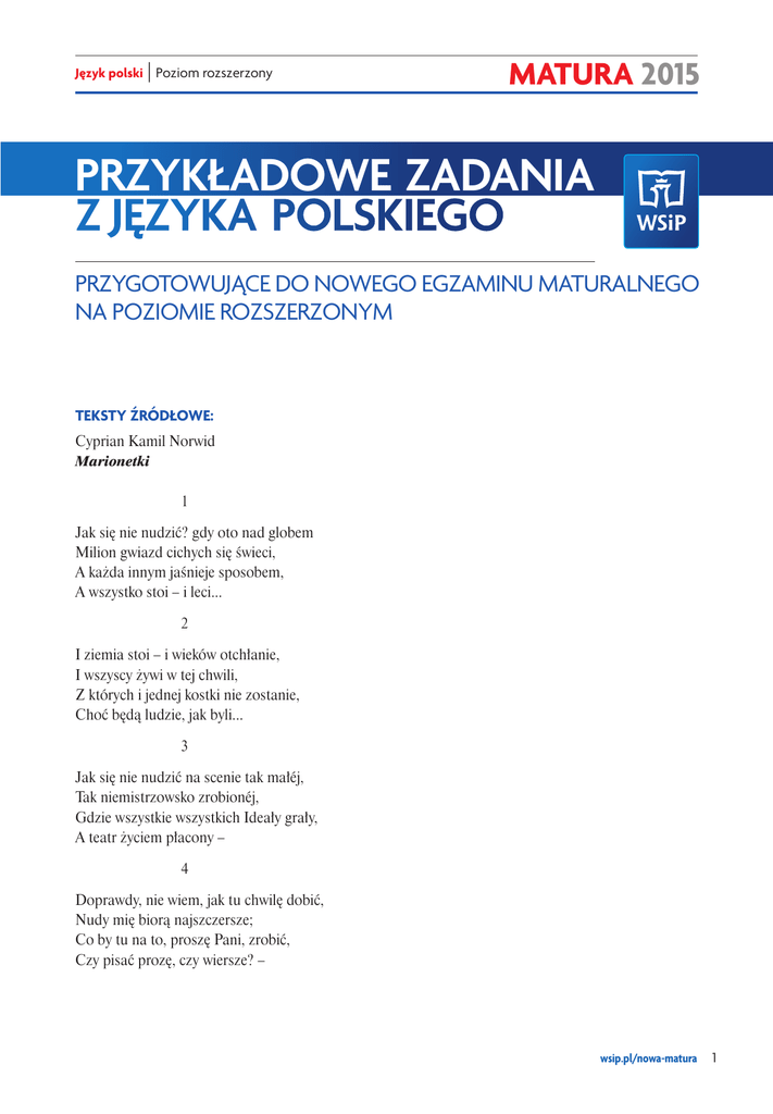 Język polski | Poziom rozszerzony MATURA 2015 Przykładowe zadania z języka polskiego przygotowujące do NOWEGO egzaminu maturalnego na poziomie rozszerzonym TekstY źródłowE: Cyprian Kamil Norwid Marionetki 1 Jak się nie nudzić? gdy oto nad globem Milion gwiazd cichych się świeci, A każda innym jaśnieje sposobem, A wszystko stoi – i leci... 2 I ziemia stoi – i wieków otchłanie, I wszyscy żywi w tej chwili, Z których i jednej kostki nie zostanie, Choć będą ludzie, jak byli... 3 Jak się nie nudzić na scenie tak małéj, Tak niemistrzowsko zrobionéj, Gdzie wszystkie wszystkich Ideały grały, A teatr życiem płacony – 4 Doprawdy, nie wiem, jak tu chwilę dobić, Nudy mię biorą najszczersze; Co by tu na to, proszę Pani, zrobić, Czy pisać prozę, czy wiersze? – wsip.pl/nowa-matura 1 Język polski | Poziom rozszerzony MATURA 2015 5 Czy nic nie pisać... tylko w słońca blasku Siąść czytać romans ciekawy: Co pisał Potop na ziarneczkach piasku, Pewno dla ludzkiej zabawy (!) – 6 Lub jeszcze lepiej – znam dzielniejszy sposób Przeciw tej nudzie przeklętéj: Zapomnieć l u d z i, a bywać u o s ó b, – Krawat mieć ślicznie zapięty!... C.K. Norwid, Pisma wierszem i prozą, PIW, Warszawa 1970. Jan Kochanowski O żywocie ludzkim Fraszki to wszytko, cokolwiek myślemy, Fraszki to wszytko, cokolwiek czyniemy; Nie masz na świecie żadnej pewnej rzeczy, Próżno tu człowiek ma co mieć na pieczy. Zacność, uroda, moc, pieniądze, sława, Wszystko to minie jako polna trawa; Naśmiawszy się nam i naszym porządkom, Wemkną nas w mieszek, jako czynią łątkom1. J. Kochanowski, Dzieła polskie, PIW, Warszawa 1989. 1 łątka – lalka, kukiełka, marionetka. Zadanie 1. Porównaj sposoby funkcjonowania motywu teatru świata w wierszu Marionetki oraz we fraszce O żywocie ludzkim. _____________________________________________________________________________________ _____________________________________________________________________________________ _____________________________________________________________________________________ _____________________________________________________________________________________ wsip.pl/nowa-matura 2 Język polski | Poziom rozszerzony MATURA 2015 _____________________________________________________________________________________ _____________________________________________________________________________________ _____________________________________________________________________________________ _____________________________________________________________________________________ _____________________________________________________________________________________ _____________________________________________________________________________________ _____________________________________________________________________________________ _____________________________________________________________________________________ _____________________________________________________________________________________ _____________________________________________________________________________________ Zadanie 2. Napisz wstęp do rozprawki, w której porównasz funkcjonowanie motywu teatru świata w wierszu Marionetki i we fraszce O żywocie ludzkim. We wstępie uwzględnij zasadę zestawienia tekstów i ich wstępne rozpoznanie. _____________________________________________________________________________________ _____________________________________________________________________________________ _____________________________________________________________________________________ _____________________________________________________________________________________ _____________________________________________________________________________________ _____________________________________________________________________________________ _____________________________________________________________________________________ _____________________________________________________________________________________ _____________________________________________________________________________________ wsip.pl/nowa-matura 3 Język polski | Poziom rozszerzony MATURA 2015 _____________________________________________________________________________________ _____________________________________________________________________________________ _____________________________________________________________________________________ _____________________________________________________________________________________ Zadanie 3. Podaj po trzy przykłady, którymi posłużysz się w swojej interpretacji, odwołując się do tekstów literackich omawianych powyżej. Marionetki C.K. Norwida I __________________________________________________________________________________ II ___________________________________________________________________________________ III __________________________________________________________________________________ O żywocie ludzkim J. Kochanowskiego I __________________________________________________________________________________ II ___________________________________________________________________________________ III __________________________________________________________________________________ wsip.pl/nowa-matura 4