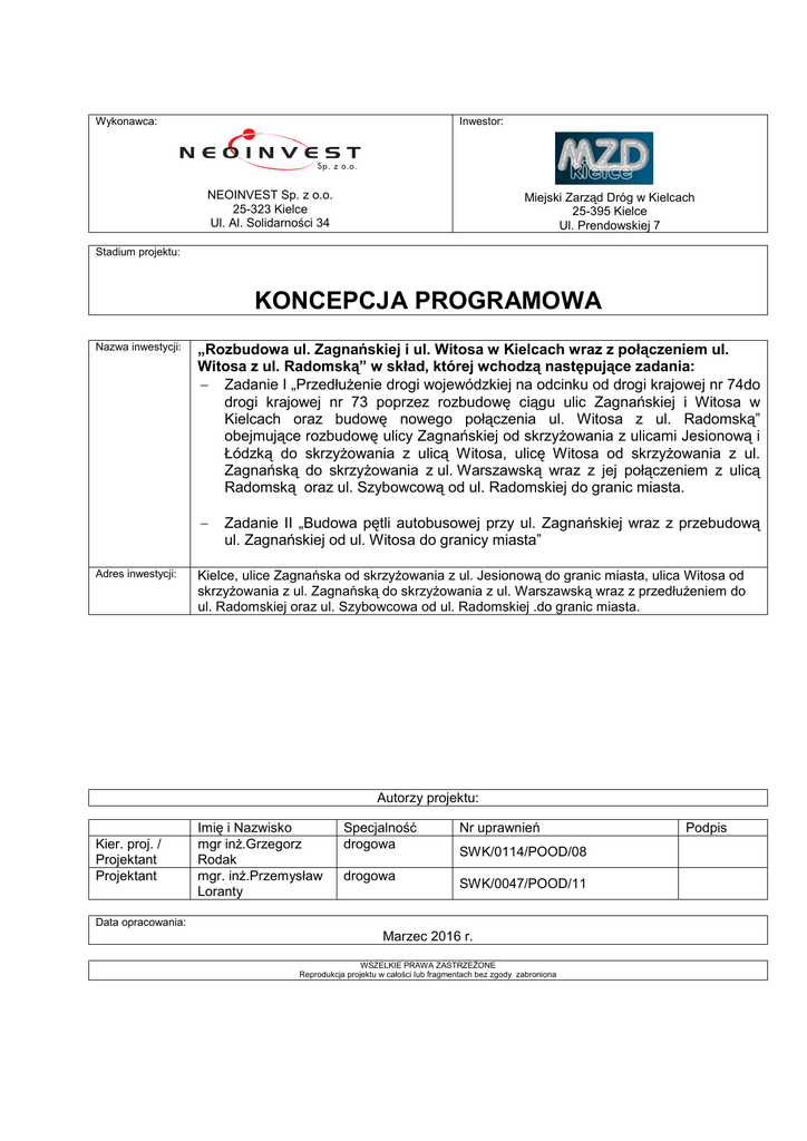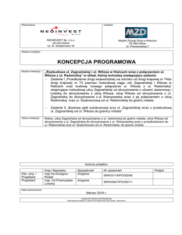 Wykonawca: Inwestor: NEOINVEST Sp. z o.o. 25-323 Kielce Ul. Al. Solidarności 34 Miejski Zarząd Dróg w Kielcach 25-395 Kielce Ul. Prendowskiej 7 Stadium projektu: KONCEPCJA PROGRAMOWA Nazwa inwestycji: „Rozbudowa ul. Zagnańskiej i ul. Witosa w Kielcach wraz z połączeniem ul. Witosa z ul. Radomską” w skład, której wchodzą następujące zadania: − Zadanie I „Przedłużenie drogi wojewódzkiej na odcinku od drogi krajowej nr 74do drogi krajowej nr 73 poprzez rozbudowę ciągu ulic Zagnańskiej i Witosa w Kielcach oraz budowę nowego połączenia ul. Witosa z ul. Radomską” obejmujące rozbudowę ulicy Zagnańskiej od skrzyżowania z ulicami Jesionową i Łódzką do skrzyżowania z ulicą Witosa, ulicę Witosa od skrzyżowania z ul. Zagnańską do skrzyżowania z ul. Warszawską wraz z jej połączeniem z ulicą Radomską oraz ul. Szybowcową od ul. Radomskiej do granic miasta. − Adres inwestycji: Zadanie II „Budowa pętli autobusowej przy ul. Zagnańskiej wraz z przebudową ul. Zagnańskiej od ul. Witosa do granicy miasta” Kielce, ulice Zagnańska od skrzyżowania z ul. Jesionową do granic miasta, ulica Witosa od skrzyżowania z ul. Zagnańską do skrzyżowania z ul. Warszawską wraz z przedłużeniem do ul. Radomskiej oraz ul. Szybowcowa od ul. Radomskiej .do granic miasta. Autorzy projektu: Kier. proj. / Projektant Projektant Imię i Nazwisko mgr inż.Grzegorz Rodak mgr. inż.Przemysław Loranty Specjalność drogowa drogowa Nr uprawnień SWK/0114/POOD/08 SWK/0047/POOD/11 Data opracowania: Marzec 2016 r. WSZELKIE PRAWA ZASTRZEŻONE Reprodukcja projektu w całości lub fragmentach bez zgody zabroniona Podpis 1 CZĘŚĆ OPISOWA 1.1 Przedmiot opracowania Przedmiotem opracowania jest wykonanie koncepcji programowej dla inwestycji pn.: „Rozbudowa ul. Zagnańskiej i ul. Witosa w Kielcach wraz z połączeniem ul. Witosa z ul. Radomską” w skład której wchodzą następujące zadania: − Zadanie I „Przedłużenie drogi wojewódzkiej na odcinku od drogi krajowej nr 74do drogi krajowej nr 73 poprzez rozbudowę ciągu ulic Zagnańskiej i Witosa w Kielcach oraz budowę nowego połączenia ul. Witosa z ul. Radomską” obejmujące rozbudowę ulicy Zagnańskiej od skrzyżowania z ulicami Jesionową i Łódzką do skrzyżowania z ulicą Witosa, ulicę Witosa od skrzyżowania z ul. Zagnańską do skrzyżowania z ul. Warszawską wraz z jej połączeniem z ulicą Radomską oraz ul. Szybowcową od ul. Radomskiej do granic miasta. − Zadanie II „Budowa pętli autobusowej przy ul. Zagnańskiej wraz z przebudową ul. Zagnańskiej od ul. Witosa do granicy miasta” Przedmiotową inwestycję drogową należy dowiązać do wykonanych wcześniej na zlecenie MZD, SZDW i GDDKiA koncepcji: − skrzyżowania ulic Zagnańskiej i Witosa wykonanej w ramach inwestycji pn.: „Przygotowanie terenów inwestycyjnych poprzez budowę przedłużenia ul. Olszewskiego w Kielcach w kierunku skrzyżowania ulic: Zagnańskiej i Witosa”. − przedłużenia ulicy Witosa do ulicy Radomskiej obejmującej min. skrzyżowania ulic Warszawska – Witosa oraz Radomska – Szybowcowa wykonanej w ramach inwestycji pn.: „Przebudowa i rozbudowa ul. Radomskiej w Kielcach w ciągu drogi krajowej nr 73 na odcinku od granicy miasta do węzła Krasickiego” − skrzyżowania ulic Zagnańska – Jesionowa – Łódzka wykonanej w ramach inwestycji pn.: „Rozbudowa drogi krajowej Nr 74 do parametrów drogi dwujezdniowej, klasy ekspresowej na odcinku: Przejście przez Kielce (Kielce S7 węzeł Kostomłoty – DK 73 węzeł Kielce)” − DW 745 w ramach inwestycji „Rozbudowa DW 745 w miejscowości Masłów wraz z rozbudową istniejącej infrastruktury drogowej” 1.2 Lokalizacja, cel i zakładany efekt inwestycji Przedmiotowa inwestycja jest zlokalizowana w północnej części miasta Kielce. Obejmuje swym zakresem ul. Zagnańską od ul. Jesionowej do granic miasta, w całości ulicę Witosa, odcinek łączący ul. Witosa z ul. Radomską po nowym przebiegu oraz ul. Szybowcową (DW 745). Nawierzchnie dróg charakteryzują się złym stanem technicznym. Wykazują szereg ubytków, kolein, zapadnięć oraz spękań podłużnych, poprzecznych i siatkowych. Celem niniejszej inwestycji jest: - zwiększenie przepustowości istniejących dróg przy jednoczesnym zapewnieniu komfortowego dojazdu do zlokalizowanych przy tych drogach przedsiębiorstw, instytucji, firm - zapewnienie alternatywnego połączenia dwóch dróg krajowych Nr 73 i 74, - poprawa bezpieczeństwa ruchu kołowego, pieszego, rowerowego, - poprawa obsługi komunikacyjnej miasta, - zwiększenie komfortu jazdy, - usprawnienie transportu miejskiego poprzez budowę zatok autobusowych, - umożliwienie aktywacji gospodarczej, - skrócenie czasu podróży, - dostosowanie nośności jezdni do wymagań obowiązujących przepisów. 1.3 Istniejące zagospodarowanie terenu 1.3.1 Ulica Zagnańska − jezdnia, chodniki, ścieżki rowerowe Na odcinku około 400 m. na północ od skrzyżowania z ul. Jesionową i Łódzką ulica ma przekrój dwujezdniowy. Na dalszej części ulicy przekrój jedno jezdniowy szerokości około 7,0 m. Po zachodniej stronie ulicy, bezpośrednio przy jezdni jest zlokalizowany chodnik. Na odcinku od skrzyżowania z ul. Piaski Małe do granic miasta chodnik jest oddzielony od jezdni zieleńcem. Brak ścieżek rowerowych. Ścieżka rowerowa biegnie jedynie wzdłuż ulicy Jesionowej i Łódzkiej z przejazdami rowerowymi przez skrzyżowanie Jesionowej z Zagnańską. − skrzyżowanie Jesionowa – Zagnańska - Łódzka Obecnie skrzyżowanie funkcjonuje jako skrzyżowanie z wyspą centralną sterowane sygnalizacją świetlną. W godzinach szczytu warunki ruchu na skrzyżowaniu są złe. Tworzą się zatory na wszystkich wlotach skrzyżowania, szczególnie na kierunku Jesionowa – Łódzka. − skrzyżowanie Zagnańska – droga dojazdowa do Obi i Merkury Market. Skrzyżowanie skanalizowane sterowane sygnalizacją świetlną. − skrzyżowanie Za