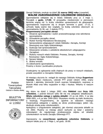 Zarząd Oddziału zwołuje na dzień 21 marca 2002 roku (czwartek) WALNE ZGROMADZENIE CZŁONKÓW ODDZIAŁU. Zgromadzenie odbędzie się w lokalu Oddziału przy ul. 3 maja 1. Początek o godz. 17:00. W przypadku nieobecności w pierwszym terminie więcej niż ½ liczby członków uprawnionych do głosowania, zgromadzenie rozpocznie się w drugim terminie o godz. 17:15, a uchwały będą ważne bez względu na liczbę członków obecnych za zgromadzeniu (§ 38, ust. 2 statutu PTT). Proponowany porządek obrad: 1. Otwarcie zgromadzenia i wybór przewodniczącego oraz sekretarza zgromadzenia. 2. Uchwalenie porządku obrad. 3. Wybór Komisji Mandatowo-Skrutacyjnej. 4. Sprawozdania ustępujących władz Oddziału: Zarządu, Komisji Rewizyjnej oraz Sądu Koleżeńskiego. 5. Dyskusja nad sprawozdaniami. 6. Głosowanie wniosku o udzielenie absolutorium ustępującemu Zarządowi. 7. Wybory nowych władz Oddziału: Prezesa, Zarządu, Komisji Rewizyjnej i Sądu Koleżeńskiego. 8. Sprawy bieżące. 9. Wolne wnioski. 10. Zakończenie zgromadzenia. Prosimy o liczne i punktualne przybycie. Oczekujemy na zgłoszenia osób chętnych do pracy w nowych władzach, przede wszystkim w Zarządzie Oddziału. Polskie Towarzystwo Tatrzańskie Oddział w Bielsku-Białej BIULETYN INFORMACYJNY nr 1/2002 W miesiącu styczniu br. wstąpił do naszego Oddziału Kolega Eugeniusz Temlak, lekarz medycyny, członek PTT przed rokiem 1950, znany taternik i alpinista, kierownik trzech wypraw himalajskich, wyprawy w Wysoki Atlas oraz kilku wyjazdów w Alpy i Kaukaz. Witamy w naszym gronie! Wg stanu na dzień 1 lutego 2002 roku Oddział nasz liczy 101 członków, z pośród których tylko 68 nie ma zaległości składkowych. Wielu członków zalega z opłatą składki: 23 za rok 2001, 4 za lata 2000-2001, a 6 za lata 1999-2001! Wysyłane monity są mało skuteczne, a kosztują. Przypominamy, że zgodnie ze statutem naszego Towarzystwa zaleganie z opłatą za okres przekraczający jeden rok, skutkuje utratą praw członkowskich. Apelujemy o uregulowanie zaległości, jak również uiszczenie składki za rok 2002. Musimy co miesiąc płacić rachunki za lokal i jesteśmy zobowiązani do regularnego przekazywania odpisu od składek członkowskich na konto Zarządu Głównego PTT. Zapraszamy na czwartkowe spotkania członków Oddziału w naszym lokalu przy ul. 3 Maja 1, od godz. 18:00. Ponawiamy apel o pozyskiwanie nowych członków Polskiego Towarzystwa Tatrzańskiego, zwyczajnych oraz wspierających (którymi mogą być zarówno osoby fizyczne, jak i prawne). Deklaracje członkowskie, pisma przewodnie do członków wspierających oraz informacje o wysokości wpisowego i składki członkowskiej można uzyskać w lokalu Oddziału. Jubileusz 75-lecia powstania PTT w naszym mieście jest dobrą okazją do ilościowego i jakościowego zwiększenia grona członków naszego Oddziału, jak również pozyskania sponsorów – członków wspierających działalność Towarzystwa. Staraniem naszego Oddziału ukaże się z okazji 75-lecia Polskiego Towarzystwa Tatrzańskiego oraz 50-lecia taternictwa w Bielsku-Białej okolicznościowa kartka pocztowa i koperta, a dzień 21 marca 2002 roku będzie w bielsko-bialskim Urzędzie Pocztowym pierwszym dniem stosowania okolicznościowego datownika. Nasze starania były długotrwałe, ale przyniosły w końcu efekt. Zachęcamy do zakupu! Uruchomienie produkcji miniaturowej odznaki PTT, nadającej się do noszenia w klapie marynarki lub bluzki, było jednym z postulatów poprzedniego Zjazdu PTT. Obecnie zapadła decyzja uruchomienia produkcji takiej odznaki. Odznaka będzie wykonana ze srebra, na oryginalnym, przedwojennym tłoczniku, obrabiana ręcznie (ze względu na małe jej rozmiary) i stąd dość droga: przy zamówieniu 200 sztuk cena wyniesie około 35 zł za sztukę. Zarząd Oddziału przyjmuje zamówienia oraz wpłaty. Przypominamy również o możliwości zakupu okolicznościowej, bardzo ładnej odznaki „75 lat PTT w Bielsku-Białej” (cena 15 zł). Zarząd Główny zadecydował, że w kadencji 2002-2004 nasi członkowie: ¾ Jan Weigel, wiceprezes ZG, nadal będzie przewodniczącym Komisji Przewodnickiej, a także będzie się zajmował sprawami statutowymi i regulaminowymi, ¾ Janusz Badura, członek ZG, będzie uczestniczył w pracach zespołu d.s. finansów, a także prowadził będzie sprawy reklam w „Pamiętniku PTT’. Oddziały PTT zapraszają na swoje imprezy: ¾ Oddział w Sosnowcu na Zimowe Wejście na Babią Górę (1-3 marca 2002), ¾ Oddział w Łodzi na Zimowe Spotkanie PTT na Polanie Chochołowskiej (14-17 marca 2002), ¾ Oddział „Carpatia” w Mielcu na III Wielkopiątkową Drogę do Krzyża na szczyt Mogielnicy (28-29 marca 2002), ¾ Oddział im. Chałubińskiego w Radomiu na VI etap rajdu „Sięganie po Koronę Gór Polski” (28.04. - 03.05.2002, Beskid Wyspowy, Gorce i Pieniny), ¾ Oddział „BESKID” w Nowym Sączu na Huculszczyznę (26.04. - 05.05.2002), na Krym (11-28 lipca 2002) oraz w Rumuńskie Karpaty Południowe: Paring, Kapacyny, Lotru, Kozia ((01 – 16 września 2002), a także w Alpy Włoskie i Francuskie (w tym wejście na Mont Blanc), ¾ Koło w Tarnobrzegu w Karpaty Wschodnie – Gorgany (29.05. – 02.06.2002), ¾ Oddział w Chrzanowie na organizowane co dwa tygodnie wycieczki w różne grupy górskie w Polsce oraz w Czechach i na Słowacji. Szczegółowe informacje: we czwartki lokalu Oddziału lub telefonicznie (Jan Weigel 033/822-80-01). Program wycieczek naszego Oddziału, planowanych w roku 2002, podamy w miesiącu marcu. 2 DNI GÓR 2002 podjął się zorganizować Oddział w Żywcu, we współpracy z naszym Oddziałem. Prosimy członków naszego Oddziału o deklaracje współpracy i pomocy, jak również propozycje do programu tej imprezy. W ubiegłym roku utraciliśmy gablotkę informacyjną naszego Oddziału umieszczoną przy ul. Przechód. Przyczyną była wygórowana opłata wymagana przez Wspólnotę Mieszkaniową gospodarującą bud