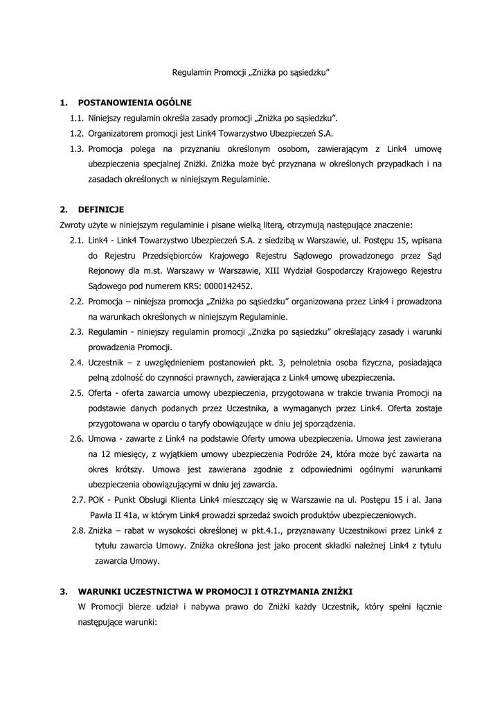 Regulamin Promocji „Zniżka po sąsiedzku” 1. POSTANOWIENIA OGÓLNE 1.1. Niniejszy regulamin określa zasady promocji „Zniżka po sąsiedzku”. 1.2. Organizatorem promocji jest Link4 Towarzystwo Ubezpieczeń S.A. 1.3. Promocja polega na przyznaniu określonym osobom, zawierającym z Link4 umowę ubezpieczenia specjalnej Zniżki. Zniżka może być przyznana w określonych przypadkach i na zasadach określonych w niniejszym Regulaminie. 2. DEFINICJE Zwroty użyte w niniejszym regulaminie i pisane wielką literą, otrzymują następujące znaczenie: 2.1. Link4 - Link4 Towarzystwo Ubezpieczeń S.A. z siedzibą w Warszawie, ul. Postępu 15, wpisana do Rejestru Przedsiębiorców Krajowego Rejestru Sądowego prowadzonego przez Sąd Rejonowy dla m.st. Warszawy w Warszawie, XIII Wydział Gospodarczy Krajowego Rejestru Sądowego pod numerem KRS: 0000142452. 2.2. Promocja – niniejsza promocja „Zniżka po sąsiedzku” organizowana przez Link4 i prowadzona na warunkach określonych w niniejszym Regulaminie. 2.3. Regulamin - niniejszy regulamin promocji „Zniżka po sąsiedzku” określający zasady i warunki prowadzenia Promocji. 2.4. Uczestnik – z uwzględnieniem postanowień pkt. 3, pełnoletnia osoba fizyczna, posiadająca pełną zdolność do czynności prawnych, zawierająca z Link4 umowę ubezpieczenia. 2.5. Oferta - oferta zawarcia umowy ubezpieczenia, przygotowana w trakcie trwania Promocji na podstawie danych podanych przez Uczestnika, a wymaganych przez Link4. Oferta zostaje przygotowana w oparciu o taryfy obowiązujące w dniu jej sporządzenia. 2.6. Umowa - zawarte z Link4 na podstawie Oferty umowa ubezpieczenia. Umowa jest zawierana na 12 miesięcy, z wyjątkiem umowy ubezpieczenia Podróże 24, która może być zawarta na okres krótszy. Umowa jest zawierana zgodnie z odpowiednimi ogólnymi warunkami ubezpieczenia obowiązującymi w dniu jej zawarcia. 2.7. POK - Punkt Obsługi Klienta Link4 mieszczący się w Warszawie na ul. Postępu 15 i al. Jana Pawła II 41a, w którym Link4 prowadzi sprzedaż swoich produktów ubezpieczeniowych. 2.8. Zniżka – rabat w wysokości określonej w pkt.4.1., przyznawany Uczestnikowi przez Link4 z tytułu zawarcia Umowy. Zniżka określona jest jako procent składki należnej Link4 z tytułu zawarcia Umowy. 3. WARUNKI UCZESTNICTWA W PROMOCJI I OTRZYMANIA ZNIŻKI W Promocji bierze udział i nabywa prawo do Zniżki każdy Uczestnik, który spełni łącznie następujące warunki: 3.1. Otrzyma zapach samochodowy lub inny gadżet reklamowy zawierający informację o Promocji oraz stanowiący podstawę do wzięcia w niej udziału. 3.2. w okresie trwania Promocji otrzyma za pośrednictwem POK Ofertę, a następnie złoży oświadczenie woli o zawarciu Umowy. Oświadczenie o zawarciu Umowy musi być złożone wobec uprawnionego pracownika POK. 3.3. na dzień zawarcia Umowy nie posiada innej, obowiązującej umowy ubezpieczenia zawartej z Link4, w której jest ubezpieczającym, przy czym powyższe zastrzeżenie nie ma zastosowania, gdy Umowa dotyczy innego przedmiotu ubezpieczenia niż obowiązująca równolegle umowa ubezpieczenia zawarta z Link4 3.4. w terminie wskazanym w Umowie opłaci całą należną Link4 składkę lub jej pierwszą ratę, stosownie do ustaleń poczynionych w trakcie zawierania Umowy. 3.5. Podczas zawierania Umowy okaże pracownikowi POK zapach lub inny gadżet reklamowy uprawniający do wzięcia udziału w Promocji. 4. ZNIŻKA 4.1. Uczestnik, poprzez udział w Promocji, jest uprawniony do nabycia, na zasadach określonych w niniejszym Regulaminie, prawa do jednorazowej Zniżki w wysokości: 4.1.1. 5% składki - w przypadku, gdy Uczestnik zawiera z Link4 umowę ubezpieczenia Podróże 24; 4.1.2. 10% składki - w przypadku, gdy Uczestnik zawiera z Link4 umowę ubezpieczenia Dom; 4.1.3. 15% składki – w przypadku, gdy Uczestnik zawiera z Link4 umowę ubezpieczenia odpowiedzialności cywilnej posiadaczy pojazdów mechanicznych (OC) lub łącznie umowę ubezpieczenia OC i auto casco; 4.2. Procent Zniżki wskazany powyżej liczony jest od wartości rocznej składki należnej do zapłaty z tytułu zawarcia danej Umowy. Przy obliczaniu wysokości Zniżki brana jest pod uwagę składka do zapłaty, po wcześniejszym uwzględnieniu wszystkich parametrów wpływających na jej wysokość, takich jak np. zniżki za bezszkodową jazdę, forma płatności, ilość rat itp. Na wysokość składki, od której liczona jest Zniżka nie ma wpływu wysokość składki za inne umowy ubezpieczenia zawierane przez Uczestnika łącznie z Umową, z której zawarciem związana jest Zniżka. 4.3. Uczestnik nabywa prawo do Zniżki z chwilą zawarcia Umowy, o ile spełnia wszystkie warunki wzięcia udziału w Promocji. 4.4. Procent Zniżki, określony w pkt. 4.1 powyżej, odejmowany jest od składki rocznej należnej z tytułu Umowy, a jeżeli składka płatna ma być w ratach, Zniżka rozkładana jest proporcjonalnie na każdą ratę obniżając wysokość odpowiednio każdej raty. 4.5. Link4 nie wypłaca kwoty Zniżki w gotówce ani w żadnej innej formie niż wskazana w pkt. 4.4 powyżej. 5. POSTĘPOWANIE REKLAMACYJNE 5.1. Wszelkie reklamacje dotyczące Promocji, należy zgłaszać w formie pisemnej - listem zwykłym lub poleconym, pocztą kurierską lub osobiście na adres: Link4 Towarzystwo Ubezpieczeń S.A., ul. Postępu 15, 02-676 Warszawa z dopiskiem „Reklamacja – Promocja Zniżka po sąsiedzku”. 5.2. Reklamacje powinny być zgłoszone w ciągu 30 dni od dnia wystąpienia zdarzenia będącego podstawą reklamacji lub od dnia, w którym Uczestnik dowiedział się o zajściu takiego zdarzenia. Reklamacja powinna zawierać imię, nazwisko, dokładny adres reklamującego, jak również opis i powód reklamacji. 5.3. Reklamacje będą rozpatrywane przez Link4 w terminie do 14 dni od daty ich otrzymania. O decyzji Link4 reklamujący zostanie powiadomiony pisemnie, listem zwykłym lub telefonicznie, przy czym informacja telefoniczna dopu