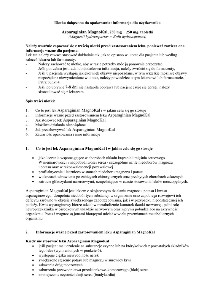 Ulotka dołączona do opakowania: informacja dla użytkownika Asparaginian MagnoKal, 250 mg + 250 mg, tabletki (Magnesii hydroaspartas + Kalii hydroaspartas) Należy uważnie zapoznać się z treścią ulotki przed zastosowaniem leku, ponieważ zawiera ona informacje ważne dla pacjenta. Lek ten należy zawsze stosować dokładnie tak, jak to opisano w ulotce dla pacjenta lub według zaleceń lekarza lub farmaceuty. Należy zachować tę ulotkę, aby w razie potrzeby móc ją ponownie przeczytać. Jeśli potrzebna jest rada lub dodatkowa informacja, należy zwrócić się do farmaceuty, Jeśli u pacjenta wystąpią jakiekolwiek objawy niepożądane, w tym wszelkie możliwe objawy niepożądane niewymienione w ulotce, należy powiedzieć o tym lekarzowi lub farmaceucie. Patrz punkt 4. Jeśli po upływie 7-8 dni nie nastąpiła poprawa lub pacjent czuje się gorzej, należy skonsultować się z lekarzem. Spis treści ulotki: 1. 2. 3. 4. 5. 6. Co to jest lek Asparaginian MagnoKal i w jakim celu się go stosuje Informacje ważne przed zastosowaniem leku Asparaginian MagnoKal Jak stosować lek Asparaginian MagnoKal Możliwe działania niepożądane Jak przechowywać lek Asparaginian MagnoKal Zawartość opakowania i inne informacje 1. Co to jest lek Asparaginian MagnoKal i w jakim celu się go stosuje jako leczenie wspomagające w chorobach układu krążenia i mięśnia sercowego. W niemiarowości i nadpobudliwości serca - szczególnie na tle niedoborów magnezu i potasu oraz w rekonwalescencji pozawałowej profilaktycznie i leczniczo w stanach niedoboru magnezu i potasu w okresach zdrowienia po zabiegach chirurgicznych oraz przebytych chorobach zakaźnych zatrucie glikozydami nasercowymi, uzupełniająco w czasie stosowania leków moczopędnych. Asparaginian MagnoKal jest lekiem o skojarzonym działaniu magnezu, potasu i kwasu asparaginowego. Uzupełnia niedobór tych substancji w organizmie oraz zapobiega rozwojowi ich deficytu zarówno w okresie zwiększonego zapotrzebowania, jak i w przypadku niedostatecznej ich podaży. Kwas asparaginowy bierze udział w metabolizmie komórek tkanki nerwowej, pełni rolę neuroprzekaźnika w ośrodkowym układzie nerwowym oraz wpływa pobudzająco na aktywność organizmu. Potas i magnez są jonami biorącymi udział w wielu przemianach metabolicznych organizmu. 2. Informacje ważne przed zastosowaniem leku Asparaginian MagnoKal Kiedy nie stosować leku Asparaginian MagnoKal jeśli pacjent ma uczulenie na substancje czynne lub na którykolwiek z pozostałych składników tego leku (wymienionych w punkcie 6). występuje ciężka niewydolność nerek zwiększone stężenie potasu lub magnezu w surowicy krwi zakażenia dróg moczowych zaburzenia przewodnictwa przedsionkowo-komorowego (blok) serca zmniejszenie częstości akcji serca (bradykardia) myasthenia gratis - choroba charakteryzująca się osłabieniem i zmęczeniem mięśni znaczne niedociśnienie tętnicze krwi. Ostrzeżenia i środki ostrożności Przed rozpoczęciem stosowania leku Asparaginian MagnoKal należy omówić to z lekarzem lub farmaceutą. Leku nie należy stosować w ostrym odwodnieniu, rozległym zniszczeniu tkanek (np. oparzenia dużych powierzchni ciała). Leku Asparaginian MagnoKal nie należy stosować w czasie antybiotykoterapii i z innymi lekami zawierającymi potas. Ostrożnie stosować w razie choroby wrzodowej żołądka. Podczas stosowania leku należy monitorować stężenie potasu i magnezu w surowicy, przeprowadzić kontrolne badanie EKG oraz kontrolować czynność nerek. Lek nie zawiera cukru. Lek Asparaginian MagnoKal a inne leki Należy powiedzieć lekarzowi lub farmaceucie o wszystkich lekach stosowanych przez pacjenta obecnie lub ostatnio, a także o lekach, które pacjent planuje przyjmować. Równoczesne stosowanie magnezu i antybiotyków z grupy tetracyklin oraz nitrofurantoiny osłabia ich wchłanianie, aby uniknąć interakcji zaleca się stosować dwugodzinną przerwę pomiędzy podaniem leków. Podawanie doustnych leków przeciwcukrzycowych pochodnych sulfonylomocznika z lekami zawierającymi magnez może spowodować zmniejszenie stężenia glukozy we krwi większe, niż oczekiwane. Sole potasu mogą osłabiać działanie glikozydów naparstnicy i powodować zaburzenia rytmu serca. Równoczesne stosowanie soli potasu i leków moczopędnych oszczędzających potas, inhibitorów ACE - enzymu przekształcającego angiotensynę I do angiotensyny II (np. enalaprylu, peryndoprylu) lub leków przeciwzapalnych i przeciwbólowych (np. indometacyny) może wystąpić za duże stężenie potasu (hiperkaliemia). Asparaginian MagnoKal z jedzeniem i piciem Pokarm nie wpływa na stopień wchłaniania potasu wodoroasparaginianu półwodnego i magnezu wodoroasparaginianu czterowodnego. Stosowanie leku Asparaginian MagnoKal u pacjentów z niewydolnością nerek U osób z niewydolnością nerek, przyjmujących inne preparaty potasu lub leki moczopędne oszczędzające potas należy liczyć się z koniecznością modyfikacji dawkowania zaleconą przez lekarza. Ciąża i karmienie piersią Ciąża Przed zastosowaniem każdego leku należy poradzić się lekarza lub farmaceuty. Karmienie piersią Przed zastosowaniem każdego leku należy poradzić się lekarza lub farmaceuty. Prowadzenie pojazdów i obsługiwanie maszyn Lek nie ma wpływu na zdolność prowadzenia pojazdów i obsługiwanie maszyn. 3. Jak stosować lek Asparaginian MagnoKal Ten lek należy zawsze stosować zgodnie z zaleceniami lekarza. W razie wątpliwości należy zwrócić się do lekarza lub farmaceuty. Lek stosuje się doustnie od 2 do 6 tabletek na dobę w dwóch dawkach podzielonych, po posiłkach. 2 Zastosowanie większej niż zalecana dawki leku Asparaginian MagnoKal Nie zgłoszono dotychczas żadnego przypadku przedawkowania leku. Pominięcie zastosowania leku Asparaginian MagnoKal Nie należy stosować dawki podwójnej w celu uzupełnienia pominiętej dawki. Przerwanie stosowania leku Asparaginian Magn