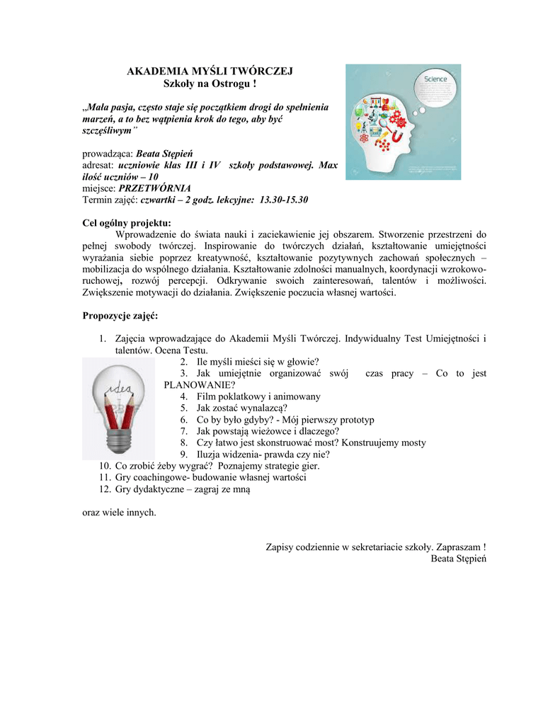 AKADEMIA MYŚLI TWÓRCZEJ Szkoły na Ostrogu ! „Mała pasja, często staje się początkiem drogi do spełnienia marzeń, a to bez wątpienia krok do tego, aby być szczęśliwym” prowadząca: Beata Stępień adresat: uczniowie klas III i IV szkoły podstawowej. Max ilość uczniów – 10 miejsce: PRZETWÓRNIA Termin zajęć: czwartki – 2 godz. lekcyjne: 13.30-15.30 Cel ogólny projektu: Wprowadzenie do świata nauki i zaciekawienie jej obszarem. Stworzenie przestrzeni do pełnej swobody twórczej. Inspirowanie do twórczych działań, kształtowanie umiejętności wyrażania siebie poprzez kreatywność, kształtowanie pozytywnych zachowań społecznych – mobilizacja do wspólnego działania. Kształtowanie zdolności manualnych, koordynacji wzrokoworuchowej, rozwój percepcji. Odkrywanie swoich zainteresowań, talentów i możliwości. Zwiększenie motywacji do działania. Zwiększenie poczucia własnej wartości. Propozycje zajęć: 1. Zajęcia wprowadzające do Akademii Myśli Twórczej. Indywidualny Test Umiejętności i talentów. Ocena Testu. 2. Ile myśli mieści się w głowie? 3. Jak umiejętnie organizować swój czas pracy – Co to jest PLANOWANIE? 4. Film poklatkowy i animowany 5. Jak zostać wynalazcą? 6. Co by było gdyby? - Mój pierwszy prototyp 7. Jak powstają wieżowce i dlaczego? 8. Czy łatwo jest skonstruować most? Konstruujemy mosty 9. Iluzja widzenia- prawda czy nie? 10. Co zrobić żeby wygrać? Poznajemy strategie gier. 11. Gry coachingowe- budowanie własnej wartości 12. Gry dydaktyczne – zagraj ze mną oraz wiele innych. Zapisy codziennie w sekretariacie szkoły. Zapraszam ! Beata Stępień