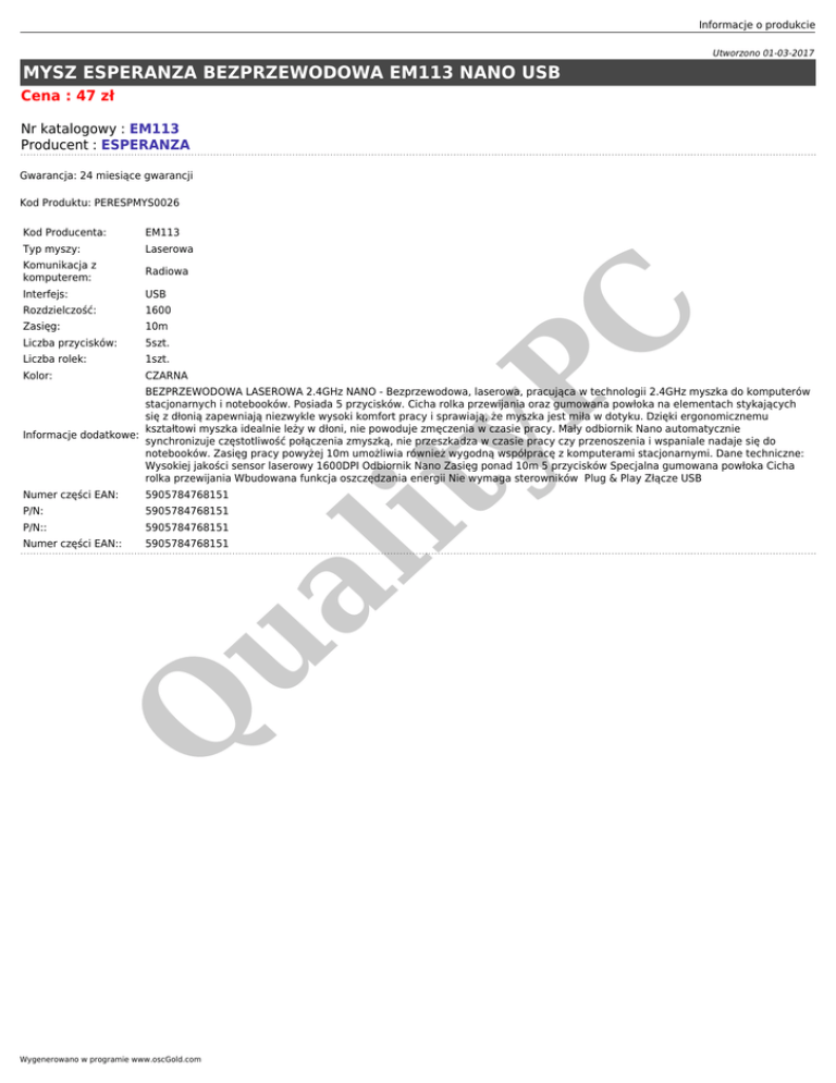 Informacje o produkcie Utworzono 01-03-2017 MYSZ ESPERANZA BEZPRZEWODOWA EM113 NANO USB Cena : 47 zł Nr katalogowy : EM113 Producent : ESPERANZA Gwarancja: 24 miesiące gwarancji EM113 Typ myszy: Laserowa Komunikacja z komputerem: Radiowa Interfejs: USB Rozdzielczość: 1600 Zasięg: 10m Liczba przycisków: 5szt. Liczba rolek: 1szt. Kolor: CZARNA yP Kod Producenta: C Kod Produktu: PERESPMYS0026 Numer części EAN: P/N: ua lit BEZPRZEWODOWA LASEROWA 2.4GHz NANO - Bezprzewodowa, laserowa, pracująca w technologii 2.4GHz myszka do komputerów stacjonarnych i notebooków. Posiada 5 przycisków. Cicha rolka przewijania oraz gumowana powłoka na elementach stykających się z dłonią zapewniają niezwykle wysoki komfort pracy i sprawiają, że myszka jest miła w dotyku. Dzięki ergonomicznemu kształtowi myszka idealnie leży w dłoni, nie powoduje zmęczenia w czasie pracy. Mały odbiornik Nano automatycznie Informacje dodatkowe: synchronizuje częstotliwość połączenia zmyszką, nie przeszkadza w czasie pracy czy przenoszenia i wspaniale nadaje się do notebooków. Zasięg pracy powyżej 10m umożliwia również wygodną współpracę z komputerami stacjonarnymi. Dane techniczne: Wysokiej jakości sensor laserowy 1600DPI Odbiornik Nano Zasięg ponad 10m 5 przycisków Specjalna gumowana powłoka Cicha rolka przewijania Wbudowana funkcja oszczędzania energii Nie wymaga sterowników Plug & Play Złącze USB 5905784768151 5905784768151 P/N:: 5905784768151 5905784768151 Q Numer części EAN:: Wygenerowano w programie www.oscGold.com