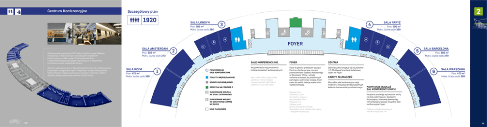 Centrum Konferencyjne 2 Szczegółowy plan 1920 SALA LONDYN Pow. 506 m2 Maks. liczba osób 360 B SALA AMSTERDAM Pow. 305 m Maks. liczba osób 240 2 Zlokalizowane na poziomie P02 Centrum Konferencyjne Stadionu Narodowego w Warszawie jest największym kompleksem konferencyjnym w Warszawie. Doskonała lokalizacja i najnowocześniejsze wyposażenie sprawiają, że to najbardziej prestiżowe miejsce spotkań dla Biznesu. Centrum wyposażone jest w dziesięć przestronnych sal konferencyjnych połączonych z wygodnym foyer i integralnych z salą kinową, galerią i Biznes Klubem. Całość usytuowano na jednym poziomie, na który dogodny dostęp zapewniają ruchome schody i windy. SALA RZYM Pow. 470 m2 Maks. liczba osób 360 1 2 3 4 A FOYER C 1 POSZCZEGÓLNE SALE KONFERENCYJNE TOALETY (MĘSKIE/DAMSKIE) FOYER SZATNIA Wszystkie sale mają możliwość instalacji urządzęń audiowizualnych. Foyer to główna przestrzeń łącząca Centrum Konferencyjne z innymi powierzchniami Stadionu Narodowego w Warszawie. Windy i schody ruchome prowadzą do podziemnych parkingów, szatni oraz recepcji. Foyer może też pełnić funkcję powierzchni wystawienniczej. Główna szatnia znajduje się na poziomie (–2). Możliwość aranżacji dodatkowej szatni we Foyer. RECEPCJA NA POZIOMIE 0 SUGEROWANE MIEJSCA NA STOŁY CATERINGOWE Długość: 66 m Szerokość: 13,5 m Szerokość z wnękami przy schodach: 30 m Wysokość: 3 m Podłoga: granit Ściany: pomalowane na biało Wyznaczone strefy na stoły cateringowe z dostępem do przyłączy SUGEROWANE MIEJSCE NA DODATKOWĄ SZATNIĘ WE FOYER SALE TŁUMACZEŃ 26 Pow. 506 m2 Maks. liczba osób 360 B C SALE KONFERENCYJNE Sale Londyn i Paryż mogą zostać podzielone na trzy mniejsze o powierzchni 181, 169 i 156 m² i pojemności 120 osób każda. SCHODY RUCHOME/WINDY 6/7 A SALA PARYŻ SALA BARCELONA Pow. 305 m2 Maks. liczba osób 240 6 KABINY TŁUMACZEŃ Wszystkie sale konferencyjne mają możliwość instalacji dźwiękoszczelnych kabin do tłumaczenia symultanicznego. 5 SALA WARSZAWA Pow. 470 m2 Maks. liczba osób 360 KORYTARZE WZDŁUŻ SAL KONFERENCYJNYCH Korytarze posiadają wyznaczone strefy na stoły cateringowe z dostępem do przyłączy i stanowią główny ciąg komunikacyjny, łączący wszystkie sale konferencyjne i foyer. Podłoga: wykładzina dywanowa Szerokość korytarza: 5 m 45