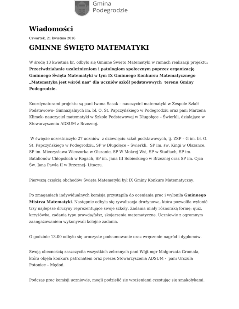 Wiadomości Czwartek, 21 kwietnia 2016 GMINNE ŚWIĘTO MATEMATYKI W środę 13 kwietnia br. odbyło się Gminne Święto Matematyki w ramach realizacji projektu: Przeciwdziałanie uzależnieniom i patologiom społecznym poprzez organizację Gminnego Święta Matematyki w tym IX Gminnego Konkursu Matematycznego „Matematyka jest wśród nas” dla uczniów szkół podstawowych terenu Gminy Podegrodzie. Koordynatorami projektu są pani Iwona Sasak – nauczyciel matematyki w Zespole Szkół Podstawowo- Gimnazjalnych im. bł. O. St. Papczyńskiego w Podegrodziu oraz pani Marzena Klimek- nauczyciel matematyki w Szkole Podstawowej w Długołęce – Świerkli, działające w Stowarzyszeniu ADSUM z Brzeznej. W święcie uczestniczyło 27 uczniów z dziewięciu szkół podstawowych, tj. ZSP – G im. bł. O. St. Papczyńskiego w Podegrodziu, SP w Długołęce – Świerkli, SP im. św. Kingi w Olszance, SP im. Mieczysława Wieczorka w Olszanie, SP W Mokrej Wsi, SP w Stadłach, SP im. Batalionów Chłopskich w Rogach, SP im. Jana III Sobieskiego w Brzeznej oraz SP im. Ojca Św. Jana Pawła II w Brzeznej- Litaczu. Pierwszą częścią obchodów Święta Matematyki był IX Gminy Konkurs Matematyczny. Po zmaganiach indywidualnych komisja przystąpiła do oceniania prac i wyłoniła Gminnego Mistrza Matematyki. Następnie odbyła się rywalizacja drużynowa, która pozwoliła wyłonić trzy najlepsze drużyny reprezentujące swoje szkoły. Zadania miały różnoraką formę: quiz, krzyżówka, zadania typu prawda/fałsz, skojarzenia matematyczne. Uczniowie z ogromnym zaangażowaniem wykonywali kolejne zadania. O godzinie 13.00 odbyło się uroczyste podsumowanie oraz wręczenie nagród i dyplomów. Swoją obecnością zaszczyciła wszystkich zebranych pani Wójt mgr Małgorzata Gromala, która objęła konkurs patronatem oraz prezes Stowarzyszenia ADSUM - pani Urszula Potoniec – Mędoń. Podczas prac komisji uczniowie, mogli podzielić się wrażeniami częstując się smakołykami. Zwycięzcy etapu indywidualnego: I miejsce Damian Gomółka z SP w Mokrej Wsi, który uzyskał tytuł Gminnego Mistrza Matematyki. II miejsce Tomasz Piekarczyk z ZSP-G im. bł. O. St. Papczyńskiego w Podegrodziu III miejsce Mariola Lech z SP w Mokrej Wsi Zwycięzcy etapu grupowego: I miejsce ZSP-G im. bł. O. St. Papczyńskiego w Podegrodziu II miejsce SP w Rogach III miejsce SP w Stadłach Partnerzy projektu: - Urząd Gminy Podegrodzie, - Małopolskie Centrum Doskonalenia Nauczycieli Ośrodek Doskonalenia nauczycieli w Nowym Sączu. Sponsorzy: Bank Spółdzielczy w Podegrodziu „Pióro” – firma budowlana z Nawojowej Janusz Rusnak -P.P.H.U. INTER STYL Zenon Siwulski – Firma Handlowa "Siwulski" Grzegorz Klag – Dom weselny „Zacisze” Maria i Tadeusz Zygadło -Gospodarstwo Agroturystyczne „Owieczka” Skilledbike – firma produkująca rowery z Olszanki Rolbud – firma budowlana Zofia i Władysław Sychowscy z Gołkowic. Organizatorzy dziękują wszystkim sponsorom za wsparcie. Dzięki czemu zwycięzcy otrzymali wartościowe nagrody, m.in. tablet Samsung Tab E, kalkulatory naukowe Casio, pióra i długopisy Parker oraz Zenith, pendrive 32 GB, gry edukacyjne. Każdy uczestnik otrzymał nagrodę za udział. Opracowały Iwona Sasak i Marzena Klimek