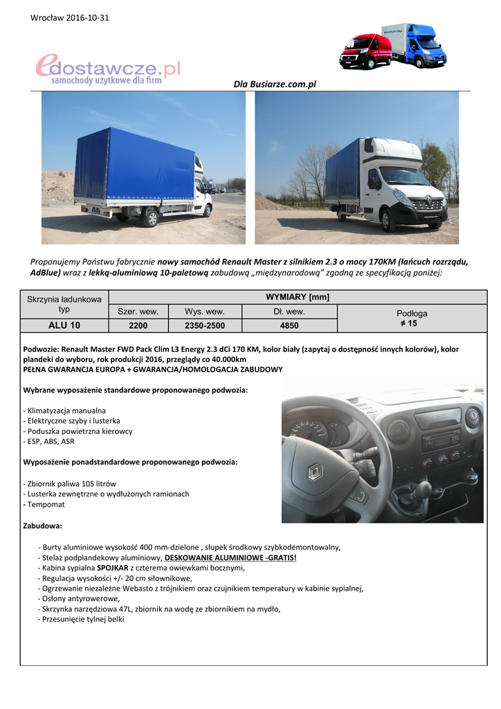 Wrocław 2016-10-31 Dla Busiarze.com.pl Proponujemy Państwu fabrycznie nowy samochód Renault Master z silnikiem 2.3 o mocy 170KM (łańcuch rozrządu, AdBlue) wraz z lekką-aluminiową 10-paletową zabudową „międzynarodową” zgodną ze specyfikacją poniżej: WYMIARY [mm] Skrzynia ładunkowa typ Szer. wew. Wys. wew. Dł. wew. ALU 10 2200 2350-2500 4850 Podłoga ≠ 15 Podwozie: Renault Master FWD Pack Clim L3 Energy 2.3 dCi 170 KM, kolor biały (zapytaj o dostępność innych kolorów), kolor plandeki do wyboru, rok produkcji 2016, przeglądy co 40.000km PEŁNA GWARANCJA EUROPA + GWARANCJA/HOMOLOGACJA ZABUDOWY Wybrane wyposażenie standardowe proponowanego podwozia: - Klimatyzacja manualna - Elektryczne szyby i lusterka - Poduszka powietrzna kierowcy - ESP, ABS, ASR Wyposażenie ponadstandardowe proponowanego podwozia: - Zbiornik paliwa 105 litrów - Lusterka zewnętrzne o wydłużonych ramionach - Tempomat Zabudowa: - Burty aluminiowe wysokość 400 mm-dzielone , słupek środkowy szybkodemontowalny, - Stelaż podplandekowy aluminiowy, DESKOWANIE ALUMINIOWE -GRATIS! - Kabina sypialna SPOJKAR z czterema owiewkami bocznymi, - Regulacja wysokości +/- 20 cm siłownikowe, - Ogrzewanie niezależne Webasto z trójnikiem oraz czujnikiem temperatury w kabinie sypialnej, - Osłony antyrowerowe, - Skrzynka narzędziowa 47L, zbiornik na wodę ze zbiornikiem na mydło, - Przesunięcie tylnej belki Wrocław 2016-10-31 Podsumowanie oferty: Regulacja wyskości +/- 20 cm siłownikowa Kabina sypialna XL + owiewki boczne szerokie Ogrzewanie postojowe WEBASTO z rozprowadzeniem powietrza góra/dół Razem 102 900,00 zł Skrzynka narzędziowa 47 L + zbiornik na wodę z dozownikiem mydła Możliwość doposażenia samochodu w: CB radio, zasłonki kabiny kierowcy, kompozytowy wózek paleciak, pasy ładunkowe, zestaw ADR, belka zabezpieczająca i wiele innych. Możliwość modyfikacji zabudowy: regulacja wysokości skrzyni, firany obustronne, odsuwany dach, winda i inne. Chętnie odpowiemy na Państwa pytania: Michał Miszczyk Kontakt: 533 019 119 Email: [email protected] ul. Opolska 188 52-014 Wrocław Infolinia: 881 414 118 www.edostawcze.pl Zapraszamy także do naszego sklepu z akcesoriami sklep.edostawcze.pl W naszej ofercie: Renault Master, Iveco Daily, Fiat Ducato, Hyundai H350, Ford Transit, Opel Movano, Mercedes Sprinter, Peugeot boxer, Citroen Jumper w zabudowach – Plandeki, Kontenety, Chłodnie, Lawety i więcej... Oferta promocyjna ważna 7 dni z finansowaiem edostawcze.pl Ceny netto.