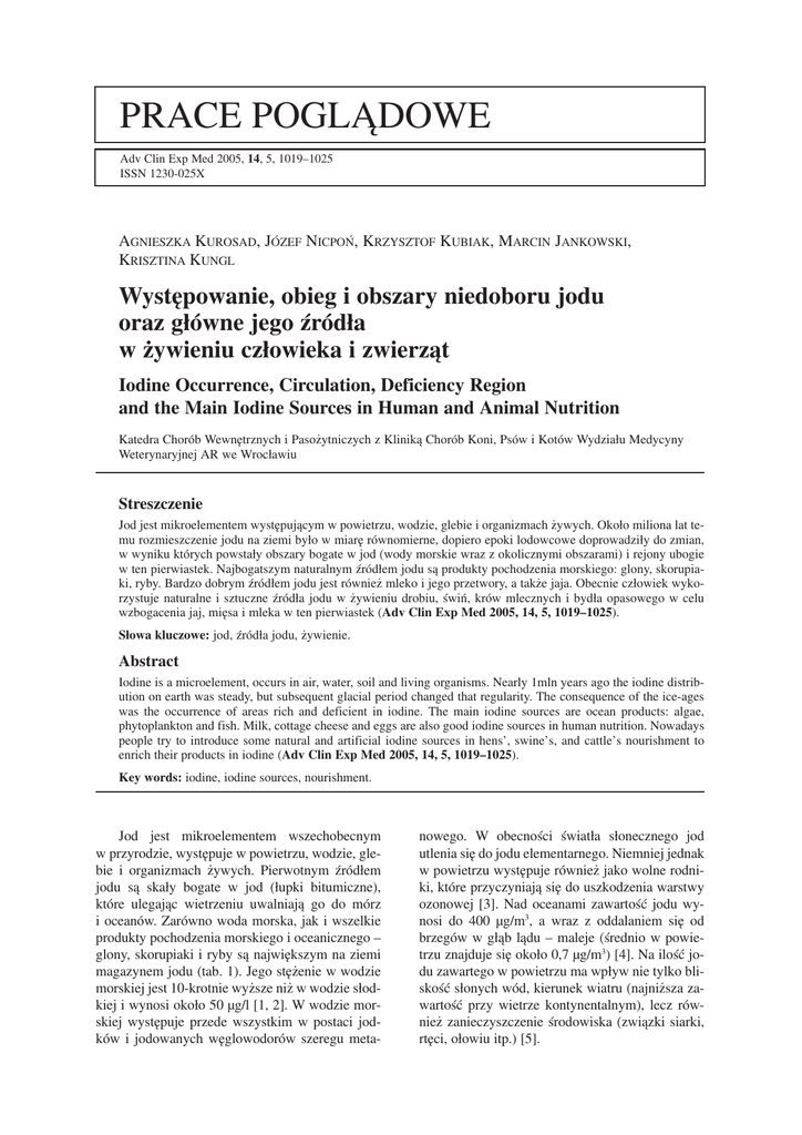 PRACE POGLĄDOWE Adv Clin Exp Med 2005, 14, 5, 1019–1025 ISSN 1230−025X AGNIESZKA KUROSAD, JÓZEF NICPOŃ, KRZYSZTOF KUBIAK, MARCIN JANKOWSKI, KRISZTINA KUNGL Występowanie, obieg i obszary niedoboru jodu oraz główne jego źródła w żywieniu człowieka i zwierząt Iodine Occurrence, Circulation, Deficiency Region and the Main Iodine Sources in Human and Animal Nutrition Katedra Chorób Wewnętrznych i Pasożytniczych z Kliniką Chorób Koni, Psów i Kotów Wydziału Medycyny Weterynaryjnej AR we Wrocławiu Streszczenie Jod jest mikroelementem występującym w powietrzu, wodzie, glebie i organizmach żywych. Około miliona lat te− mu rozmieszczenie jodu na ziemi było w miarę równomierne, dopiero epoki lodowcowe doprowadziły do zmian, w wyniku których powstały obszary bogate w jod (wody morskie wraz z okolicznymi obszarami) i rejony ubogie w ten pierwiastek. Najbogatszym naturalnym źródłem jodu są produkty pochodzenia morskiego: glony, skorupia− ki, ryby. Bardzo dobrym źródłem jodu jest również mleko i jego przetwory, a także jaja. Obecnie człowiek wyko− rzystuje naturalne i sztuczne źródła jodu w żywieniu drobiu, świń, krów mlecznych i bydła opasowego w celu wzbogacenia jaj, mięsa i mleka w ten pierwiastek (Adv Clin Exp Med 2005, 14, 5, 1019–1025). Słowa kluczowe: jod, źródła jodu, żywienie. Abstract Iodine is a microelement, occurs in air, water, soil and living organisms. Nearly 1mln years ago the iodine distrib− ution on earth was steady, but subsequent glacial period changed that regularity. The consequence of the ice−ages was the occurrence of areas rich and deficient in iodine. The main iodine sources are ocean products: algae, phytoplankton and fish. Milk, cottage cheese and eggs are also good iodine sources in human nutrition. Nowadays people try to introduce some natural and artificial iodine sources in hens’, swine’s, and cattle’s nourishment to enrich their products in iodine (Adv Clin Exp Med 2005, 14, 5, 1019–1025). Key words: iodine, iodine sources, nourishment. Jod jest mikroelementem wszechobecnym w przyrodzie, występuje w powietrzu, wodzie, gle− bie i organizmach żywych. Pierwotnym źródłem jodu są skały bogate w jod (łupki bitumiczne), które ulegając wietrzeniu uwalniają go do mórz i oceanów. Zarówno woda morska, jak i wszelkie produkty pochodzenia morskiego i oceanicznego – glony, skorupiaki i ryby są największym na ziemi magazynem jodu (tab. 1). Jego stężenie w wodzie morskiej jest 10−krotnie wyższe niż w wodzie słod− kiej i wynosi około 50 µg/l [1, 2]. W wodzie mor− skiej występuje przede wszystkim w postaci jod− ków i jodowanych węglowodorów szeregu meta− nowego. W obecności światła słonecznego jod utlenia się do jodu elementarnego. Niemniej jednak w powietrzu występuje również jako wolne rodni− ki, które przyczyniają się do uszkodzenia warstwy ozonowej [3]. Nad oceanami zawartość jodu wy− nosi do 400 µg/m3, a wraz z oddalaniem się od brzegów w głąb lądu – maleje (średnio w powie− trzu znajduje się około 0,7 µg/m3) [4]. Na ilość jo− du zawartego w powietrzu ma wpływ nie tylko bli− skość słonych wód, kierunek wiatru (najniższa za− wartość przy wietrze kontynentalnym), lecz rów− nież zanieczyszczenie środowiska (związki siarki, rtęci, ołowiu itp.) [5]. 1020 A. KUROSAD et al. Tabela 1. Średnia zawartość jodu w produktach pochodzących z mórz (µg/60 g produktu) [13] Table 1. Mean iodine content in sea food products (µg/60 g product) [13] Produkt (Product) Waga (Weight) g Zawartość jodu (Iodine content) µg Glony morskie 60 38571,4 Sól jodowana 60 4620 Suszony dorsz 60 70,71 Krewetki 60 25 Jod, jako związek dobrze rozpuszczalny w wodzie, podlega koncentracji w kropelkach mgły oraz kryształach śniegu i powraca na ziemię w postaci opadu atmosferycznego, wzbogacając powierzchniowe warstwy gleby [4, 5]. Warto wspomnieć, że jego zawartość w opadach atmo− sferycznych jest wyższa niż w powietrzu. Latem, wskutek zwiększonego parowania z powierzchni wód, dochodzi do zwiększenia jego stężenia w po− wietrzu i w ten sposób następuje zamknięcie obie− gu jodu w przyrodzie. Zawartość jodu w opadach atmosferycznych i glebie ma wpływ na jego ilość w wodach po− wierzchniowych i gruntowych, skąd jest pobiera− ny przez rośliny. Stężenie w roślinach zależy od ich zdolności absorpcyjnych, zawartości selenu w glebie i stosowania nawozów azotowych. Za− wartość jodu w roślinach lądowych wynosi śre− dnio około 1 mg/kg suchej masy [2, 4]. Kłosówka wełnista (Holcus lanatus), powszechnie występu− jąca na pastwiskach, wykazuje małą zdolność wią− zania jodu z gleby i powietrza, co przy jednoczes− nym niedoborze selenu, mimo prawidłowej zawar− tości jodu w glebie, stwarza zagrożenie wystąpie− nia niedoczynności tarczycy u wypasanego bydła [6]. Jony azotanowe i azotynowe natomiast bloku− ją proces organifikacji jodu i tym samym obniżają wydzielanie hormonów tarczycy [3]. Około miliona lat temu rozmieszczenie jodu na Ziemi było w miarę równomierne, dopiero epo− ki lodowcowe spowodowały zaburzenie równo− wagi. Zmiana ukształtowania powierzchni ziemi doprowadziła do zubożenia niektórych regionów w ten pierwiastek, a wzbogacenia pozostałych [5]. Proces ten był bardzo powolny, trwał kilkadziesiąt tysięcy lat i nadal, z powodu stale zachodzących ruchów tektonicznych, trzęsień ziemi i wybuchów wulkanów zachodzi. Powstawanie obszarów z nie− doborami jodu jest obserwowane w regionach na− wiedzanych przez silne opady (obszary górskie) i powtarzające się powodzie. Sprzyja to wypłuki− waniu jodu z gleby, a im starsza jest warstwa po− wierzchniowa gruntu, tym większy procent jodu jest tracony. Tereny o małej zawartości jodu w powietrzu, glebie i wodzie, na których stwierdza się zwięk− Tabela 2. Średnia zawartość jodu w wybr