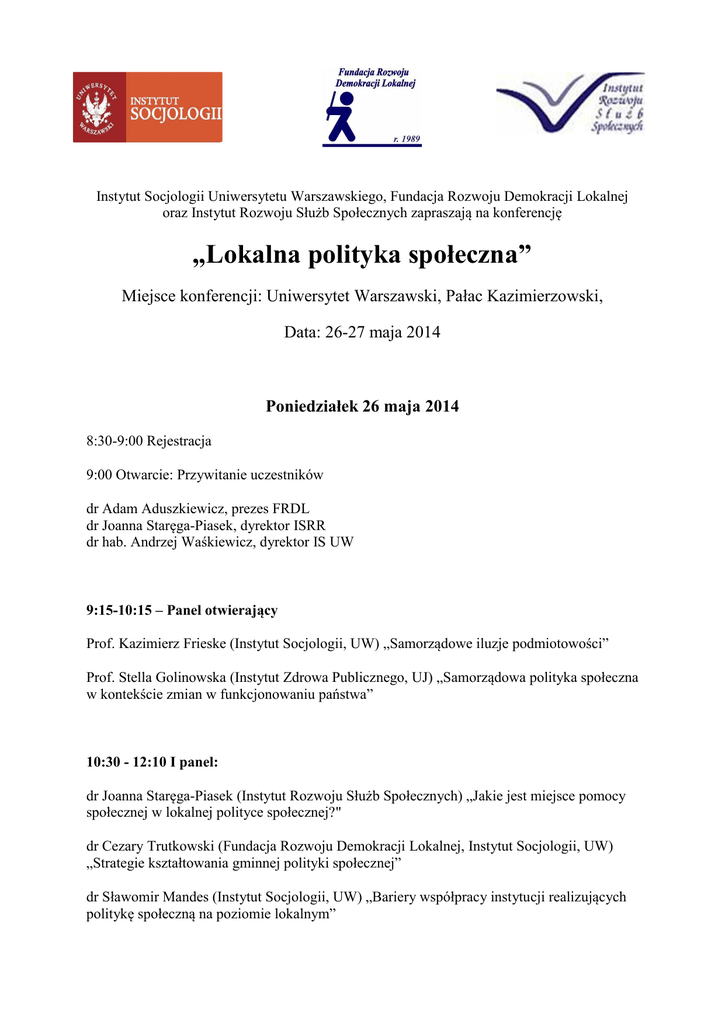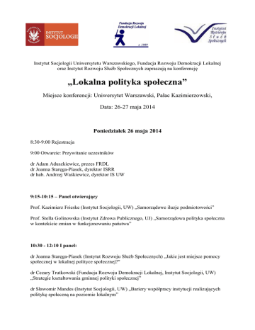 Instytut Socjologii Uniwersytetu Warszawskiego, Fundacja Rozwoju Demokracji Lokalnej oraz Instytut Rozwoju Służb Społecznych zapraszają na konferencję „Lokalna polityka społeczna” Miejsce konferencji: Uniwersytet Warszawski, Pałac Kazimierzowski, Data: 26-27 maja 2014 Poniedziałek 26 maja 2014 8:30-9:00 Rejestracja 9:00 Otwarcie: Przywitanie uczestników dr Adam Aduszkiewicz, prezes FRDL dr Joanna Staręga-Piasek, dyrektor ISRR dr hab. Andrzej Waśkiewicz, dyrektor IS UW 9:15-10:15 – Panel otwierający Prof. Kazimierz Frieske (Instytut Socjologii, UW) „Samorządowe iluzje podmiotowości” Prof. Stella Golinowska (Instytut Zdrowa Publicznego, UJ) „Samorządowa polityka społeczna w kontekście zmian w funkcjonowaniu państwa” 10:30 - 12:10 I panel: dr Joanna Staręga-Piasek (Instytut Rozwoju Służb Społecznych) „Jakie jest miejsce pomocy społecznej w lokalnej polityce społecznej?" dr Cezary Trutkowski (Fundacja Rozwoju Demokracji Lokalnej, Instytut Socjologii, UW) „Strategie kształtowania gminnej polityki społecznej” dr Sławomir Mandes (Instytut Socjologii, UW) „Bariery współpracy instytucji realizujących politykę społeczną na poziomie lokalnym” 12:25 – 14:05 II panel: Lokalna polityka społeczna z perspektywy obywateli Karolina Sztandar-Sztanderska (Instytut Socjologii, UW) „Metody dyscyplinowania bezrobotnych w lokalnej praktyce polityki rynku pracy” dr Maria Theiss (Instytut Polityki Społecznej, UW) „Konstruując obywatela gminy: polityka regulowania dostępu do usług przedszkolnych” dr Marianna Zieleńska (Instytut Socjologii UW) „Lokalny system wsparcia dla osób doświadczających ubóstwa w relacjach klientów ośrodka pomocy społecznej” 14.05 – 14.50 Lunch 14:50-16:30 III panel: Kapitał społeczny Ewa Kowalik „Programy współpracy jednostek samorządu terytorialnego z organizacjami pozarządowymi a jakość usług społecznych” dr Izabela Rybka (Akademia Pedagogiki Specjalnej im. M. Grzegorzewskiej) „Programy Aktywności Lokalnej – niewykorzystana szansa na budowanie obywatelskiej polityki społecznej” Wojciech Goleński (Uniwersytet Ekonomiczny w Katowicach, ROPS Opole) „Kapitał społeczny podmiotów gospodarki społecznej w województwie opolskim” 16:45-18.25 IV panel: Ewaluacja i monitoring dr Agnieszka Skowrońska (Instytut Rozwoju Służb Społecznych) „Rola ewaluacji strategii rozwiązywania problemów społecznych” Magda Szostakowska (Ośrodek Ewaluacji, Polskie Towarzystwo Ewaluacyjne); Katarzyna Wójcikowska (Instytut Socjologii UW, Ośrodek Ewaluacji) „Ewaluacja daje wiedzę, ale nie samorządom lokalnym… – diagnoza i propozycje rozwiązań” Mateusz Trochymiak (ICF GHK Polska) „Dyktat miary. Konstrukt sukcesu pomocy społecznej i jego konsekwencje.” Wtorek 27 maja 2014 9:00 – 10:40 V panel: Wybrane obszary polityki społecznej Klaudia Wolniewicz (Instytut Polityki Społecznej, UW) "Opieka nad dzieckiem w wieku do lat 3 - próba oceny efektywności instrumentów polityki rodzinnej" Ewa Flaga (Uniwersytet im. A. Mickiewicza w Poznaniu) „Rola lokalnego systemu wychowawczego w reintegracji rodzin wychowanków pieczy zastępczej” ks. dr Wojciech Sadłoń (Instytutu Statystyki Kościoła Katolickiego) „Parafia katolicka jako przestrzeń pracy środowiskowej w Polsce” 11:00-12:40 VI panel: Planowanie strategiczne prof. dr hab. Włodzimierz Okrasa (UKSW, GUS), Beata Witek (GUS, UKSW) „Lokalny System Świadczeń a Nierówności Przestrzenne Dobrostanu: Znaczenie relacji międzysektorowych” Leszek Faluszczak (MOPS Sanok) „Od pomagania do kształtowania lokalnej polityki społecznej” Barbara Kucharska (Mazowieckie Centrum Polityki Społecznej) „Dyfuzja w polityce społecznej – rola i możliwości władz samorządowych” 13:00-14:00 VII panel: Polityka regionalna wobec wyzwań demograficznych dr Brygida B. Cupiał (Uniwersytet Zielonogórski) „Programowanie srebrnej gospodarki jako jeden z celów zarządzania strategicznego w regionie.” dr Ewa Sobolewska-Poniedziałek (Uniwersytet Zielonogórski) „Regionalny wymiar srebrnej gospodarki” 14:00-14:30 Podsumowanie konferencji. 14:30-15:15 Lunch