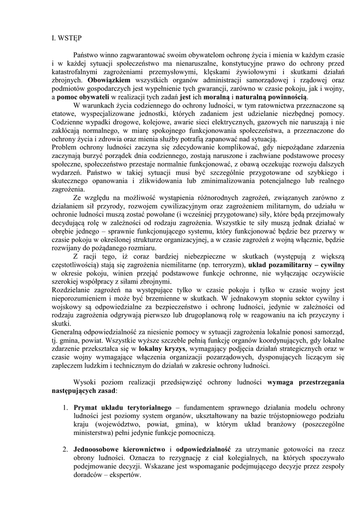 I. WSTĘP Państwo winno zagwarantować swoim obywatelom ochronę życia i mienia w każdym czasie i w każdej sytuacji społeczeństwo ma nienaruszalne, konstytucyjne prawo do ochrony przed katastrofalnymi zagrożeniami przemysłowymi, klęskami żywiołowymi i skutkami działań zbrojnych. Obowiązkiem wszystkich organów administracji samorządowej i rządowej oraz podmiotów gospodarczych jest wypełnienie tych gwarancji, zarówno w czasie pokoju, jak i wojny, a pomoc obywateli w realizacji tych zadań jest ich moralną i naturalną powinnością. W warunkach życia codziennego do ochrony ludności, w tym ratownictwa przeznaczone są etatowe, wyspecjalizowane jednostki, których zadaniem jest udzielanie niezbędnej pomocy. Codzienne wypadki drogowe, kolejowe, awarie sieci elektrycznych, gazowych nie naruszają i nie zakłócają normalnego, w miarę spokojnego funkcjonowania społeczeństwa, a przeznaczone do ochrony życia i zdrowia oraz mienia służby potrafią zapanować nad sytuacją. Problem ochrony ludności zaczyna się zdecydowanie komplikować, gdy niepożądane zdarzenia zaczynają burzyć porządek dnia codziennego, zostają naruszone i zachwiane podstawowe procesy społeczne, społeczeństwo przestaje normalnie funkcjonować, z obawą oczekując rozwoju dalszych wydarzeń. Państwo w takiej sytuacji musi być szczególnie przygotowane od szybkiego i skutecznego opanowania i zlikwidowania lub zminimalizowania potencjalnego lub realnego zagrożenia. Ze względu na możliwość wystąpienia różnorodnych zagrożeń, związanych zarówno z działaniem sił przyrody, rozwojem cywilizacyjnym oraz zagrożeniem militarnym, do udziału w ochronie ludności muszą zostać powołane (i wcześniej przygotowane) siły, które będą przejmowały decydującą rolę w zależności od rodzaju zagrożenia. Wszystkie te siły muszą jednak działać w obrębie jednego – sprawnie funkcjonującego systemu, który funkcjonować będzie bez przerwy w czasie pokoju w określonej strukturze organizacyjnej, a w czasie zagrożeń z wojną włącznie, będzie rozwijany do pożądanego rozmiaru. Z racji tego, iż coraz bardziej niebezpieczne w skutkach (występują z większą częstotliwością) stają się zagrożenia niemilitarne (np. terroryzm), układ pozamilitarny – cywilny w okresie pokoju, winien przejąć podstawowe funkcje ochronne, nie wyłączając oczywiście szerokiej współpracy z siłami zbrojnymi. Rozdzielanie zagrożeń na występujące tylko w czasie pokoju i tylko w czasie wojny jest nieporozumieniem i może być brzemienne w skutkach. W jednakowym stopniu sektor cywilny i wojskowy są odpowiedzialne za bezpieczeństwo i ochronę ludności, jedynie w zależności od rodzaju zagrożenia odgrywają pierwszo lub drugoplanową rolę w reagowaniu na ich przyczyny i skutki. Generalną odpowiedzialność za niesienie pomocy w sytuacji zagrożenia lokalnie ponosi samorząd, tj. gmina, powiat. Wszystkie wyższe szczeble pełnią funkcję organów koordynujących, gdy lokalne zdarzenie przekształca się w lokalny kryzys, wymagający podjęcia działań strategicznych oraz w czasie wojny wymagające włączenia organizacji pozarządowych, dysponujących liczącym się zapleczem ludzkim i technicznym do działań w zakresie ochrony ludności. Wysoki poziom realizacji przedsięwzięć ochrony ludności wymaga przestrzegania następujących zasad: 1. Prymat układu terytorialnego – fundamentem sprawnego działania modelu ochrony ludności jest poziomy system organów, ukształtowany na bazie trójstopniowego podziału kraju (województwo, powiat, gmina), w którym układ branżowy (poszczególne ministerstwa) pełni jedynie funkcje pomocniczą. 2. Jednoosobowe kierownictwo i odpowiedzialność za utrzymanie gotowości na rzecz obrony ludności. Oznacza to rezygnację z ciał kolegialnych, na których spoczywało podejmowanie decyzji. Wskazane jest wspomaganie podejmującego decyzje przez zespoły doradców – ekspertów. 3. Adekwatność charakteru oraz rozmiaru zagrożenia i szczebla administracji publicznej do reagowania na powstałe zagrożenie oznacza to, że wszelkie działania winny być wykonywane przez najniższy szczebel kompetencji dla konkretnej sytuacji, co zapewni proporcjonalność działań do specyfiki i rozmiaru zagrożeń. 4. Powszechność systemu ochrony ludności – oznacza ona objęcie nim wszystkich obywateli z równoczesnym nałożeniem na nich określonych zadań i obowiązków, uzależnionych od sytuacji w jakim funkcjonuje system gotowości. 5. Kierowanie i ponoszenie odpowiedzialności przez jednoosobowe organy sprawujące władzę administracji ogólnej, tj. przez wójta (burmistrza, prezydenta miasta), starostę, jako organy samorządowe sprawujące władzę w gminie i starostwie oraz wojewodę, sprawującego władzę jako przedstawiciel rządu na szczeblu województwa. Podmiot sprawujący władzę na danym terenie ponosi odpowiedzialność za jej sprawowanie oraz za utrzymanie bezpieczeństwa, spokoju czyli przestrzeganie prawa przez organy władzy publicznej, podmioty gospodarcze oraz obywateli. Do zadań w zakresie ochrony ludności należy zaliczyć: 1) planowanie i prace organizacyjne; 2) ostrzeganie i alarmowanie o zagrożeniach; 3) prowadzenie akcji ratowniczych (ludzi, zwierząt, dóbr kultury); 4) ewakuację z obiektów, terenów zagrożonych; 5) przywracanie i utrzymanie porządku oraz bezpieczeństwa w strefach zagrożeń; 6) zapewnienie schronienia i zaopatrzenia dla poszkodowanych; 7) doraźne przywracanie działania służb użyteczności publicznej; 8) likwidacja powstałych skażeń i zakażeń (terenu, obiektów, ludności); Biorąc pod uwagę różnorodność w/w zadań oraz różnorodność podmiotów realizujących te zadania z zakresu niemal wszystkich działów administracji rządowej, administracji samorządowej, gospodarki oraz wielu organizacji pozarządowych, wiodącą rolę w zakresie kierowania pełni Rada Ministrów oraz pr