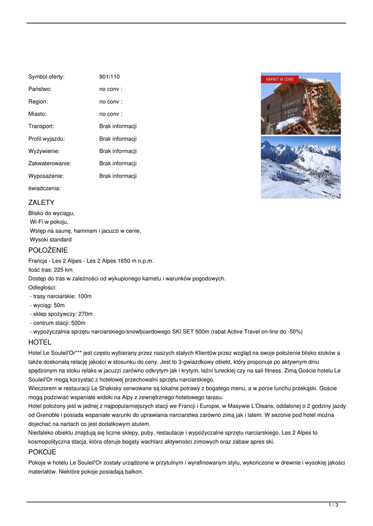 Symbol oferty: 901/110 Państwo: no conv : Region: no conv : Miasto: no conv : Transport: Brak informacji Profil wyjazdu: Brak informacji Wyżywienie: Brak informacji Zakwaterowanie: Brak informacji Wyposażenie: Brak informacji świadczenia: ZALETY Blisko do wyciągu, Wi-Fi w pokoju, Wstęp na saunę, hammam i jacuzzi w cenie, Wysoki standard POŁOŻENIE Francja - Les 2 Alpes - Les 2 Alpes 1650 m n.p.m. Ilość tras: 225 km Dostęp do tras w zależności od wykupionego karnetu i warunków pogodowych. Odległości: - trasy narciarskie: 100m - wyciąg: 50m - sklep spożywczy: 270m - centrum stacji: 500m - wypożyczalnia sprzętu narciarskiego/snowboardowego SKI SET 500m (rabat Active Travel on-line do -50%) HOTEL Hotel Le Souleil'Or*** jest często wybierany przez naszych stałych Klientów przez wzgląd na swoje położenie blisko stoków a także doskonałą relację jakości w stosunku do ceny. Jest to 3-gwiazdkowy obiekt, który proponuje po aktywnym dniu spędzonym na stoku relaks w jacuzzi zarówno odkrytym jak i krytym, łaźni tureckiej czy na sali fitness. Zimą Goście hotelu Le Souleil'Or mogą korzystać z hotelowej przechowalni sprzętu narciarskiego. Wieczorem w restauracji Le Shakisky serwowane są lokalne potrawy z bogatego menu, a w porze lunchu przekąski. Goście mogą podziwiać wspaniałe widoki na Alpy z zewnętrznego hotelowego tarasu. Hotel położony jest w jednej z najpopularniejszych stacji we Francji i Europie, w Masywie L’Oisans, oddalonej o 2 godziny jazdy od Grenoble i posiada wspaniałe warunki do uprawiania narciarstwa zarówno zimą jak i latem. W sezonie pod hotel można dojechać na nartach co jest dodatkowym atutem. Niedaleko obiektu znajdują się liczne sklepy, puby, restautacje i wypożyczalne sprzętu narciarskiego. Les 2 Alpes to kosmopolityczna stacja, która oferuje bogaty wachlarz aktywności zimowych oraz zabaw apres ski. POKOJE Pokoje w hotelu Le Souleil'Or zostały urządzone w przytulnym i wyrafinowanym stylu, wykończone w drewnie i wysokiej jakości materiałów. Niektóre pokoje posiadają balkon. 1/3 Typy pokoi: DBL Standard Południe - pokój 2-osobowy z możliwością 1 dostawki (22 m2), ekspozycja południowa, z widokiem na lodowiec Muzelle. Pokój wyposażony jest w TV, bezprzewodowy internet (WiFi), telefon, sejf, łazienkę z suszarką do włosów, balkon. DBL Standard Wchód - pokój 2-osobowy z możliwością 2 dostawek (22 m2), ekspozycja wschodnia lub zachodnia, z widokiem na miasteczko. Pokój wyposażony jest w TV, bezprzewodowy internet (WiFi), telefon, sejf, łazienkę z suszarką do włosów, balkon. DBL Superior - pokój 2-osobowy (25 m2), ekspozycja południowa, z widokiem na lodowiec Muzelle. Pokój wyposażony jest w TV, bezprzewodowy internet (WiFi), telefon, sejf, łazienkę z suszarką do włosów, taras. WYŻYWIENIE W ofercie śniadania w formie bufetu. KARNET W cenie 6- dniowy karnet Les 2 Alpes Grande Galaxie czyli 225 km tras ! Karnet narciarski obejmuje także bezpłatny wstęp na publiczny, odkryty basen z podgrzewaną wodą w Les 2 Alpes oraz wstęp na lodowisko. 55 km tras zielonych (łatwych) 103 km tras niebieskich (średnio trudnych) 45 km tras czerwonych (trudnych) 22 km tras czarnych (bardzo trudnych) Karnet Les 2 Alpes to również możliwość jazdy w resortach l'Alpe d'Huez, Montgenevre, Puy Saint Vincent, Serre-Chevalier, Sestrieres, Flain (różna ilość dni, dostęp w zależności od warunków pogodowych, z wyłączeniem terminu 3-17.12.2016) CENA Cena zawiera: - zakwaterowanie w wybranym pokoju z pościelą i ręcznikami, - wyżywienie: śniadania, - nielimitowany wstęp do strefy SPA w hotelu, - 6-dniowy karnet narciarski Les 2 Alpes, - obowiązkowe ubezpieczenie KL,NNW, - Wi-Fi w pokoju, - korzystanie z narciarni, - bezpłatny parking publiczny, - opieki pilota lub rezydenta, - Autokar: przejazd autokarem typu LUX przystosowanym do rejsów międzynarodowych, bagaż główny, bagaż podręczny oraz bagaż narciarski. Cena nie zawiera dopłat obowiązkowych: - opłaty klimatycznej 1,50 EUR/osoba/dzień, Cena nie zawiera dopłat opcjonalnych: - pobytu zwierząt, - ubezpieczenia narciarskiego 6 dni na nartach, - ubezpieczenia od kosztów rezygnacji 3% AXA (wariant zwrotu 100% zgodnie z warunkami ubezpieczyciela), - ubezpieczenia od chorób przewlekłych, Atrakcje: Wyjątkowy, duży i nowoczesny alpejski -całoroczny” ośrodek narciarski Międzynarodowej sławy snowpark Największy lodowiec w Europie z całorocznym snowparkiem Ciekawe połączenie regionów - wjazd za pługiem śnieżnym do części freeride’owej La Grave Imprezy w "Noc pełni księżyca” - niezapomniane wieczory na wysokości 3200 m n.p.m. 2/3 Wycieczki w rakietach śnieżnych i zapierające dech w piersi widoki Wieczorna jazda na nartach na trasie Lutin od godziny 20:30 do 22:30, 2-3 razy w tygodniu Kietesurfing na śniegu Loty na paralotni Wieczorne jazdy na skuterze śnieżnym Loty widokowe helikopterem W cenie karnetu ogrzewany odkryty basen , sztuczne lodowisko, miejscowy skibus Grota lodowa z rzeźbami Osada Mont de Lans Noc w Igloo Kanata Centrum sportowe z basenem, sauną, fitness centrum Niezliczona ilość klimatycznych pubów, barów i klubów, w których można imprezować do rana TERMINY: CENNIK: Długość pobytu: dni Grupa cenowa: Waluta: PLN Aktualne ceny z systemu S.A.R.T. (-) - cena usługi, podatku kalkulowana przy osobie lub gratis (*) - kwota wliczona w cenę standardową 3/3