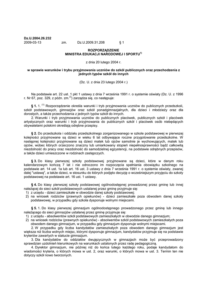 Dz.U.2004.26.232 2009-03-13 zm. Dz.U.2009.31.208 §1 ROZPORZĄDZENIE 1) MINISTRA EDUKACJI NARODOWEJ I SPORTU z dnia 20 lutego 2004 r. w sprawie warunków i trybu przyjmowania uczniów do szkół publicznych oraz przechodzenia z jednych typów szkół do innych (Dz. U. z dnia 23 lutego 2004 r.) Na podstawie art. 22 ust. 1 pkt 1 ustawy z dnia 7 września 1991 r. o systemie oświaty (Dz. U. z 1996 2) r. Nr 67, poz. 329, z późn. zm. ) zarządza się, co następuje: (1) § 1. 1. Rozporządzenie określa warunki i tryb przyjmowania uczniów do publicznych przedszkoli, szkół podstawowych, gimnazjów oraz szkół ponadgimnazjalnych, dla dzieci i młodzieży oraz dla dorosłych, a także przechodzenia z jednych typów szkół do innych. 2. Warunki i tryb przyjmowania uczniów do publicznych placówek, publicznych szkół i placówek artystycznych oraz warunki i tryb przyjmowania do publicznych szkół i placówek osób niebędących obywatelami polskimi określają odrębne przepisy. § 2. Do przedszkola i oddziału przedszkolnego zorganizowanego w szkole podstawowej w pierwszej kolejności przyjmowane są dzieci w wieku 6 lat odbywające roczne przygotowanie przedszkolne. W następnej kolejności przyjmowane są dzieci matek lub ojców samotnie je wychowujących, matek lub ojców, wobec których orzeczono znaczny lub umiarkowany stopień niepełnosprawności bądź całkowitą niezdolność do pracy oraz niezdolność do samodzielnej egzystencji, na podstawie odrębnych przepisów, a także dzieci umieszczone w rodzinach zastępczych. § 3. Do klasy pierwszej szkoły podstawowej przyjmowane są dzieci, które w danym roku kalendarzowym kończą 7 lat i nie odroczono im rozpoczęcia spełniania obowiązku szkolnego na podstawie art. 14 ust. 1a lub art. 16 ust. 3 ustawy z dnia 7 września 1991 r. o systemie oświaty, zwanej dalej "ustawą", a także dzieci, w stosunku do których podjęto decyzję o wcześniejszym przyjęciu do szkoły podstawowej na podstawie art. 16 ust. 1 ustawy. § 4. Do klasy pierwszej szkoły podstawowej ogólnodostępnej prowadzonej przez gminę lub innej należącej do sieci szkół podstawowych ustalanej przez gminę przyjmuje się: 1) z urzędu - dzieci zamieszkałe w obwodzie danej szkoły podstawowej; 2) na wniosek rodziców (prawnych opiekunów) - dzieci zamieszkałe poza obwodem danej szkoły podstawowej, w przypadku gdy szkoła dysponuje wolnymi miejscami. § 5. 1. Do klasy pierwszej gimnazjum ogólnodostępnego prowadzonego przez gminę lub innego należącego do sieci gimnazjów ustalanej przez gminę przyjmuje się: 1) z urzędu - absolwentów szkół podstawowych zamieszkałych w obwodzie danego gimnazjum; 2) na wniosek rodziców (prawnych opiekunów) - absolwentów szkół podstawowych zamieszkałych poza obwodem danego gimnazjum, w przypadku gdy gimnazjum dysponuje wolnymi miejscami. 2. W przypadku gdy liczba kandydatów zamieszkałych poza obwodem danego gimnazjum jest większa niż liczba wolnych miejsc, którymi dysponuje gimnazjum, kandydatów przyjmuje się na podstawie kryteriów zawartych w statucie gimnazjum. 3. Dla kandydatów do oddziałów dwujęzycznych w gimnazjach może być przeprowadzony sprawdzian uzdolnień kierunkowych na warunkach ustalonych przez radę pedagogiczną. 4. Dyrektor gimnazjum, nie później niż do końca lutego każdego roku, podaje kandydatom do wiadomości kryteria, o których mowa w ust. 2, oraz warunki, o których mowa w ust. 3. Termin ten nie dotyczy szkół nowo tworzonych. 5. Do kandydatów, którzy ukończyli szkołę podstawową dla dzieci obywateli polskich czasowo przebywających za granicą lub ukończyli szkołę za granicą, stosuje się odpowiednio § 19 ust. 1 pkt 3. 6. Laureaci konkursów o zasięgu wojewódzkim i ponadwojewódzkim, których program obejmuje w całości lub poszerza treści podstawy programowej co najmniej jednego przedmiotu, przyjmowani są do wybranego gimnazjum niezależnie od kryteriów, o których mowa w ust. 2. § 6. 1. Do przedszkola specjalnego, szkoły podstawowej specjalnej i gimnazjum specjalnego oraz do oddziałów specjalnych w przedszkolach, szkołach podstawowych i gimnazjach ogólnodostępnych przyjmowane są, na wniosek rodziców (prawnych opiekunów), dzieci posiadające orzeczenie o potrzebie kształcenia specjalnego, wydane przez zespół orzekający działający w publicznej poradni psychologicznopedagogicznej, w tym publicznej poradni specjalistycznej, na podstawie odrębnych przepisów. 2. Do przedszkola integracyjnego, szkoły podstawowej integracyjnej i gimnazjum integracyjnego oraz do oddziałów integracyjnych w przedszkolach, szkołach podstawowych i gimnazjach ogólnodostępnych, na wniosek rodziców (prawnych opiekunów), przyjmowane są: 1) dzieci posiadające orzeczenie, o którym mowa w ust. 1; 2) dzieci pełnosprawne, na warunkach określonych w § 2-5. § 7. 1. O przyjęcie do klasy pierwszej szkół ponadgimnazjalnych: zasadniczej szkoły zawodowej, liceum ogólnokształcącego, liceum profilowanego, technikum oraz szkoły specjalnej przysposabiającej do pracy mogą ubiegać się absolwenci gimnazjum. 2. O przyjęcie do klasy pierwszej szkół ponadgimnazjalnych: uzupełniającego liceum ogólnokształcącego i technikum uzupełniającego mogą ubiegać się absolwenci zasadniczych szkół zawodowych. 3. O przyjęcie na semestr pierwszy szkoły ponad-gimnazjalnej - szkoły policealnej mogą ubiegać się absolwenci posiadający wykształcenie średnie. 4. Kandydaci ubiegający się o przyjęcie do klasy pierwszej lub na semestr pierwszy szkoły ponadgimnazjalnej prowadzącej kształcenie zawodowe powinni posiadać zaświadczenie lekarskie o braku przeciwwskazań zdrowotnych do kształcenia w określonym zawodzie, wydane na podstawie odrębnych przepisów. 5. Kandydaci niepełnosprawni ubiegający się o przyjęcie do klasy pierwszej szkół ponadgimnazjalnych powinni posiadać orzeczenie o potrzebie kształcenia specjalnego, wydane przez zespół orzek