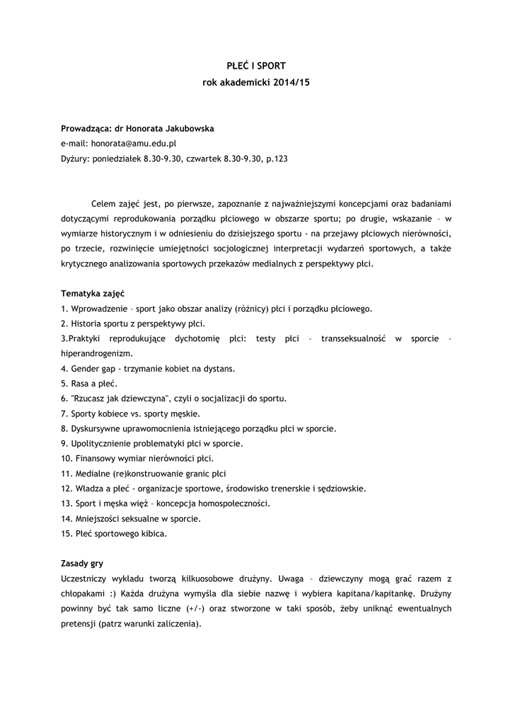 PŁEĆ I SPORT rok akademicki 2014/15 Prowadząca: dr Honorata Jakubowska e-mail: [email protected] Dyżury: poniedziałek 8.30-9.30, czwartek 8.30-9.30, p.123 Celem zajęć jest, po pierwsze, zapoznanie z najważniejszymi koncepcjami oraz badaniami dotyczącymi reprodukowania porządku płciowego w obszarze sportu; po drugie, wskazanie – w wymiarze historycznym i w odniesieniu do dzisiejszego sportu - na przejawy płciowych nierówności, po trzecie, rozwinięcie umiejętności socjologicznej interpretacji wydarzeń sportowych, a także krytycznego analizowania sportowych przekazów medialnych z perspektywy płci. Tematyka zajęć 1. Wprowadzenie – sport jako obszar analizy (różnicy) płci i porządku płciowego. 2. Historia sportu z perspektywy płci. 3.Praktyki reprodukujące dychotomię płci: testy płci – transseksualność w sporcie – hiperandrogenizm. 4. Gender gap - trzymanie kobiet na dystans. 5. Rasa a płeć. 6. "Rzucasz jak dziewczyna", czyli o socjalizacji do sportu. 7. Sporty kobiece vs. sporty męskie. 8. Dyskursywne uprawomocnienia istniejącego porządku płci w sporcie. 9. Upolitycznienie problematyki płci w sporcie. 10. Finansowy wymiar nierówności płci. 11. Medialne (re)konstruowanie granic płci 12. Władza a płeć - organizacje sportowe, środowisko trenerskie i sędziowskie. 13. Sport i męska więź – koncepcja homospołeczności. 14. Mniejszości seksualne w sporcie. 15. Płeć sportowego kibica. Zasady gry Uczestniczy wykładu tworzą kilkuosobowe drużyny. Uwaga – dziewczyny mogą grać razem z chłopakami :) Każda drużyna wymyśla dla siebie nazwę i wybiera kapitana/kapitankę. Drużyny powinny być tak samo liczne (+/-) oraz stworzone w taki sposób, żeby uniknąć ewentualnych pretensji (patrz warunki zaliczenia). Do 20 stycznia będzie toczyła się rywalizacja pomiędzy drużynami. Punkty będzie można zdobywać poprzez: 1. zadania realizowane podczas zajęć 2. zadanie medialne (za zadanie to przyznam od 1 do 20 punktów) 3. aktywność na zajęciach (pojedyncze osoby zdobywają punkty dla swojej drużyny) Warunki zaliczenia 1. zdobywanie punktów podczas zajęć [jeśli członkowie któregoś z zespołów nie zdobędą żadnych punktów na zajęciach, wówczas będą zaliczać przedmiot na podstawie wskazanych przeze mnie tekstów] 2. wykonanie zadania drużynowego Do końca listopada każda z drużyn musi przeprowadzić tygodniową (od poniedziałku do niedzieli) analizę głównych telewizyjnych wiadomości sportowych (TVP1 lub Polsat). Jako jednostkę analizy proszę przyjąć pojedynczą wiadomość/materiał. Analiza powinna dotyczyć następujących kwestii: - jaka dyscyplina jest tematem wiadomości - jakiej płci jest przedstawiany sportowiec / są przedstawiani sportowcy - jakiej płci jest dziennikarz przedstawiający dany materiał - czemu poświęcona jest dana wiadomość (zapowiedź wydarzenia sportowego; relacja z wydarzenia sportowego; infrastruktura; doping; kibice; …) Wymienione kryteria analizy są obowiązkowe. Oprócz tego mogą Państwo stworzyć również swoje własne kryteria. Wyniki analizy wraz z ich interpretacją należy przedstawić w mini-raporcie (do 10 stron). Każda drużyna będzie musiała przedstawić wyniki swojego badania podczas zajęć. Ocena końcowa Ocena będzie zależała od końcowej klasyfikacji drużyn na koniec semestru. Z założenia cała drużyna otrzymuje tą samą liczbę punktów. Jednak daję sobie prawo do obniżenia/podwyższenia oceny ze względu na indywidualne zaangażowanie w zajęcia lub jego całkowity brak. LITERATURA polska Chrostowski K. (2005), Płeć a sport, „Sport Wyczynowy”, nr 3-4, ss. 61-66. „Czas Kultury” nr 2/2006, 1/2012. Czubaj i in. (2012). Postfutbol. Antropologia piłki nożnej. Wydawnictwo Katedra. Dzik A. (2011). Kobieta niekobieca? Socjologiczny portret kobiet wyczynowo uprawiających „męskie” sporty. Na przykładzie wspinaczki wysokogórskiej, narciarstwa wysokogórskiego oraz rajdów przygodowych. [w:] K.Slany, B.Kowalska, M.Ślusarczyk (red.). Kalejdoskop genderowy. Kraków: WUJ. Jakubowska H. (2008). Medialne wizerunki sportowego ciała – (re)konstrukcja gender? [w:] J.Bator, A.Wieczorkiewicz (red.). Ucieleśnienia II. Płeć między ciałem a tekstem. Warszawa: Wydawnictwo IFiS. ---------------- (2009). Sport jako pole (re)produkowania płci kulturowej, [w:] T.Sahaj (red.). Pogranicza współczesnego sportu. Ujęcie społeczne. Poznań: Akademia Wychowania Fizycznego im. Eugeniusza Piaseckiego. ----------------- (2012). Zasady wynagradzania w sporcie w kontekście idei sprawiedliwości i równości płci. „Ruch Prawniczy, Ekonomiczny i Socjologiczny” nr 1/2012 --------------- (2013). Świat sportu w gazetach codziennych na podstawie wyników „The International Sports Press Survey”, „Studia Medioznawcze”, nr 1 (52) 2013 ------------------ (2014). Gra ciałem. Praktyki i dyskursy różnicowania płci w sporcie. PWN: Warszawa. Kluczyńska U. (2011). Konstruowanie relacji między rodzajami w sporcie. Analiza telewizyjnych wiadomości sportowych. [w:] K.Slany, B.Kowalska, M.Ślusarczyk (red.). Kalejdoskop genderowy. Kraków: WUJ. Kłodecka-Różalska J. (red.). (2003). Sportsmenka – kobietą sukcesu. Korzyści i bariery aktywności sportowej kobiet. Warszawa: PSSK Kossakowski i in. (red.) (2013). Futbol i cała reszta. Sport w perspektywie nauk społecznych. Orbis Exterior. „Kultura i Społeczeństwo” Nr 3/2012. Sport w kulturze Media, eros, przemoc. (2003).Wybór, wstęp i opracowanie Andrzej Gwódź. Kraków: UNIVERSITAS. Myśliwy D. (2011). Kobiety na igrzyskach olimpijskich. [w:] K.Slany, B.Kowalska, M.Ślusarczyk (red.). Kalejdoskop genderowy. Kraków: WUJ. Rogowski Ł., Skrobacki R. (2011). Społeczne zmagania ze sportem. Poznań: Wydawnictwo Naukowe Wydziału Nauk Społecznych. Sahaj T. (2004), Kobiety we współczesnym sporcie, „Sport Wyczynowy”, nr 1-2, ss. 47-54. ---------- (2006), Kobiety na boisku