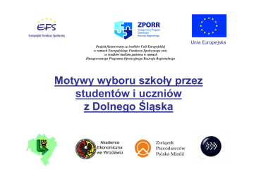 Projekt finansowany ze środków Unii Europejskiej w ramach Europejskiego Funduszu Społecznego oraz ze środków budżetu państwa w ramach Zintegrowanego Programu Operacyjnego Rozwoju Regionalnego Unia Europejska Motywy wyboru szkoły przez studentów i uczniów z Dolnego Śląska Akademia Ekonomiczna we Wrocławiu Celem prezentacji będzie przedstawienie motywów wyboru szkoły/kierunku studiów przez dolnośląskich uczniów szkół ponadgimnazjalnych i studentów uczelni wyższych Prezentowane wyniki pochodzą z dwóch badań ankietowych: • badanie studentów uczelni wyższych (I 2006r.) • badanie uczniów szkół ponadgimnazjalnych (I 2006r.) Obydwa badania wykonał instytut ASM – Centrum Badań i Analiz Rynku w ramach projektu „WIEDZA PLUS 2” Badanie studentów: • badanie zostało przeprowadzone w styczniu 2006r. • badanie zostało przeprowadzone techniką ankietową za pomocą specjalnie stworzonego kwestionariusza wywiadu • próba badawcza objęła 900 studentów ostatnich dwóch lat studiów • próba badawcza była dobrana w sposób kwotowy • analizy były prowadzone oddzielnie dla studentów uczelni państwowych i prywatnych Badanie uczniów: • badanie zostało przeprowadzone w styczniu 2006r. • badanie zostało przeprowadzone techniką ankietową za pomocą specjalnie stworzonego kwestionariusza wywiadu • próba badawcza objęła 580 uczniów ostatnich dwóch klas szkół ponadgimnazjalnych • próba badawcza była dobrana w sposób kwotowy • analizy były prowadzone oddzielnie dla uczniów z zasadniczych szkół zawodowych, liceów ogólnokształcących i średnich szkół zawodowych Motywy wyboru uczelni wyższej Przyczyny wyboru kierunku studiów (w %; N=900)* moje zainteresowania 66,6 24,2 daje szansę na znalezienie pracy 20,2 prestiz tego kierunku 16,8 przypadek procedura rekrutacyjna 12,8 10,4 szkoła średnia przygotowała mnie do tego kierunku ktoś inny pomógł mi podjąc decyzję 8,4 modny, popularny kierunek 7,6 6,8 studiują tu moi znajomi 5,4 tradycje rodzinne 2,8 mogę jednoczesnie pracowac 1,1 ograniczony wybór w mojej miejscowości 0 *Wykres prezentuje odpowiedzi, które uzyskały pow. 1% wskazań. 80 Przyczyny wyboru kierunku studiów przez studentów z uczelni państwowych (w %; N=748)* 68,0 moje zainteresowania 22,7 daje szansę na znalezienie pracy przypadek 17,9 prestiz tego kierunku 17,8 procedura rekrutacyjna 12,0 11,0 szkoła średnia przygotowała mnie do tego kierunku ktoś inny pomógł mi podjąc decyzję 7,8 6,0 tradycje rodzinne studiują tu moi znajomi 5,9 modny, popularny kierunek 5,7 1,6 mogę jednoczesnie pracowac 1,3 ograniczony wybór w mojej miejscowości 0 *Wykres prezentuje odpowiedzi, które uzyskały pow. 1% wskazań. 80 Przyczyny wyboru kierunku studiów przez studentów z uczelni prywatnych (w %; N=152)* moje zainteresowania 59,2 32,2 prestiz tego kierunku 31,6 daje szansę na znalezienie pracy procedura rekrutacyjna 16,4 modny, popularny kierunek 16,4 ktoś inny pomógł mi podjąc decyzję 11,8 przypadek 11,2 studiują tu moi znajomi 11,2 mogę jednoczesnie pracowac 8,6 szkoła średnia przygotowała mnie do tego kierunku 7,9 2,6 tradycje rodzinne 0 *Wykres prezentuje odpowiedzi, które uzyskały pow. 1% wskazań. 70 Motywy wyboru szkoły ponadgimnazjalnej Przyczyny wyboru rodzaju szkoły (w %; N=580)* 43,3 moje zainteresowania prestiż tej szkoły 34,8 znajomi też wybrali tę szkołę 28,3 27,4 chcę mieć dobre przygotowanie do studiów daje szansę na znalezienie pracy 22,1 20,9 chcę mieć konkretny zawód po ukończeniu szkoły ktoś inny pomógł mi podjąc decyzję 20,2 15,5 liczba punktów w teście na koniec gimnazjum 10,9 ograniczony wybór szkół w tej miejscowości 8,8 tradycje rodzinne 3,1 lokalizacja 1,9 inne 0 *Wykres prezentuje odpowiedzi, które uzyskały pow. 1% wskazań. 50 Przyczyny wyboru rodzaju szkoły przez uczniów z zasadniczych szkół zawodowych (w %; N=80)* 42,5 moje zainteresowania 41,3 daje szansę na znalezienie pracy 37,5 chcę mieć konkretny zawód po ukończeniu szkoły 32,5 znajomi też wybrali tę szkołę ktoś inny pomógł mi podjąc decyzję 18,8 liczba punktów w teście na koniec gimnazjum 17,5 11,3 prestiż tej szkoły ograniczony wybór szkół w tej miejscowości 7,5 5,0 inne 3,8 tradycje rodzinne 2,5 nie dostałem/am się do innej szkoły lokalizacja 1,3 chcę mieć dobre przygotowanie do studiów 1,3 0 *Wykres prezentuje odpowiedzi, które uzyskały pow. 1% wskazań. 50 Przyczyny wyboru rodzaju szkoły przez uczniów ze szkół średnich zawodowych (w %; N=225)* 44,9 moje zainteresowania 35,1 chcę mieć konkretny zawód po ukończeniu szkoły znajomi też wybrali tę szkołę 32,4 31,6 daje szansę na znalezienie pracy 20,4 ktoś inny pomógł mi podjąc decyzję prestiż tej szkoły 18,2 13,3 ograniczony wybór szkół w tej miejscowości liczba punktów w teście na koniec gimnazjum 11,6 6,7 chcę mieć dobre przygotowanie do studiów 5,8 tradycje rodzinne 4,4 lokalizacja inne 1,3 brak odp. 1,3 0 *Wykres prezentuje odpowiedzi, które uzyskały pow. 1% wskazań. 50 Przyczyny wyboru rodzaju szkoły przez uczniów z liceów ogólnokształcących (w %; N=275)* 55,3 prestiż tej szkoły chcę mieć dobre przygotowanie do studiów 52,0 42,2 moje zainteresowania 23,6 znajomi też wybrali tę szkołę ktoś inny pomógł mi podjąc decyzję 20,4 liczba punktów w teście na koniec gimnazjum 18,2 tradycje rodzinne 12,7 9,8 ograniczony wybór szkół w tej miejscowości daje szansę na znalezienie pracy 8,7 4,4 chcę mieć konkretny zawód po ukończeniu szkoły 2,5 lokalizacja 1,5 inne 0 *Wykres prezentuje odpowiedzi, które uzyskały pow. 1% wskazań. 60 Wnioski • Zarówno uczniowie jak i studenci wybierając szkołę/kierunek studiów kierują się motywacją trojakiego rodzaju: • orientacja zawodowo-pragmatyczna (wybór szkoły/kierunku studiów podyktowany szansami na uzyskanie pracy), • orientacja hobbystyczna (własne zainteresowania) • orien