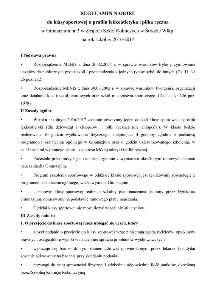REGULAMIN NABORU do klasy sportowej o profilu lekkoatletyka i piłka ręczna w Gimnazjum nr 3 w Zespole Szkół Rolniczych w Środzie Wlkp. na rok szkolny 2016/2017 I Podstawa prawna • Rozporządzenie MENiS z dnia 20.02.2004 r. w sprawie warunków trybu przyjmowania uczniów do publicznych przedszkoli i przechodzenia z jednych typów szkól do innych (Dz. U. Nr 26 poz. 232) • Rozporządzenie MENiS z dnia 30.07.2002 r. w sprawie warunków tworzenia, organizacji oraz działania klas i szkół sportowych oraz szkół mistrzostwa sportowego. (Dz. U. Nr 126 poz. 1078) II Zasady ogólne • W roku szkolnym 2016/2017 zostanie utworzony jeden oddział klasy sportowej o profilu lekkoatletyki (dla dziewcząt i chłopców) i piłki ręcznej (dla chłopców). W klasie będzie realizowane 10 godzin wychowania fizycznego, obejmujące 4 godziny zgodnie z podstawą programową kształcenia ogólnego w Gimnazjum oraz 6 godzin ukierunkowanego szkolenia, w zależności od wybranego sportu, z zakresu lekkiej atletyki i piłki ręcznej. • Pozostałe przedmioty będą nauczane zgodnie z wymiarem określonym ramowym planem nauczania dla Gimnazjum. • Program szkolenia sportowego w oddziale klasie sportowej jest realizowany równolegle z programem kształcenia ogólnego, właściwym dla Gimnazjum • Uczniowie klasy sportowej realizują szkolny plan nauczania ustalony przez Dyrektora Gimnazjum, opracowany na podstawie ramowego planu nauczania. • Oddział klasy sportowej nie może liczyć więcej niż 30 uczniów. III Zasady naboru 1. O przyjęcie do klasy sportowej może ubiegać się uczeń, który : • złożył podanie o przyjęcie do klasy sportowej wraz z pisemną zgodą rodziców/ opiekunów prawnych osiąga dobre wyniki w nauce i nie sprawia problemów wychowawczych • wykazuje się bardzo dobrym stanem zdrowia potwierdzonym przez lekarza (kandydat zostanie skierowany na badania przy składaniu podania) • przystąpi do testu sprawności fizycznej i zdobędzie odpowiednią ilość punktów, określoną przez Szkolną Komisję Rekrutacyjną 2. Wymagane dokumenty a) niezbędne do przeprowadzenia testu sprawności fizycznej • podanie o przyjęcie do klasy pierwszej sportowej w Gimnazjum nr 3 w Środzie Wlkp. • deklaracja przystąpienia do testu sprawności fizycznej • zaświadczenie lekarskie o stanie zdrowia (kandydat zostanie skierowany na badania przy składaniu podania), b) niezbędne do przyjęcia do klasy pierwszej : • dokumenty podstawowe wymienione w podaniu o przyjęcie do klasy pierwszej • zaświadczenie o osiągnięciach sportowych zdobytych w zawodach o randze mistrzostw rejonu, województwa, itp. • zaświadczenie o przynależności do klubu sportowego (jeżeli należy) IV Terminy rekrutacji Powołując się na ZARZĄDZENIE NR 110.1.4.2016 WIELKOPOLSKIEGO KURATORA OŚWIATY z dnia 28 stycznia 2016 r. w sprawie szczegółowych terminów przyjmowania do publicznych szkół na rok szkolny 2016/2017, ustalono następujące terminy : Data Działanie Do 24.03.2016 r. Zamieszczenie na stronie internetowej opisu testów sprawności fizycznej 4 -18.05.2016 r. Złożenie podania o przyjęcie do gimnazjum wraz z dokumentami potwierdzającymi spełnianie przez kandydata warunków (wg pkt. 2a) 20.05.2016 r. 24.05.2016 r. Do 2.06.2016 r. Test sprawności I termin* • piłka ręczna • lekkoatletyka Test sprawności II termin dla osób, które nie uczestniczyły w I terminie* • piłka ręczna • lekkoatletyka Podanie do publicznej wiadomości przez komisję rekrutacyjną listy kandydatów, którzy uzyskali pozytywne wyniki prób sprawności fizycznej 24-28.06.2016 r. Uzupełnienie wniosku o przyjęcie do gimnazjum o świadectwo ukończenia szkoły podstawowej oraz zaświadczenie o wynikach sprawdzaniu (wg pkt. 2b) Do 18.07.2016 r. Wywieszenie listy przyjętych kandydatów do Gimnazjum *Szczegółowy plan godzinowy testów sprawnościowych zostanie opublikowany na stronie internetowej szkoły V Szkolna komisja Rekrutacyjna 1. W celu przeprowadzenia rekrutacji do klasy sportowej, dyrektor powołuje Szkolną Komisję Rekrutacyjną. 2. W skład komisji wchodzi dyrektor/zastępca jako przewodniczący, nauczyciel wychowania fizycznego, trener danej dyscypliny. 3. Szkolna Komisja Rekrutacyjna : a) podaje do wiadomości kandydatom informacje o warunkach rekrutacji, b) prowadzi postępowanie rekrutacyjne zgodnie z zasadami naboru, c) ogłasza listę kandydatów przyjętych do klasy sportowej (decyduje punktacja za test sprawności fizycznej oraz osiągnięcia sportowe ) d) sporządza protokół z postępowania rekrutacyjnego. VI Postanowienia końcowe • Wszystkie sprawy nie ujęte w regulaminie rozstrzyga Dyrektor Szkoły.