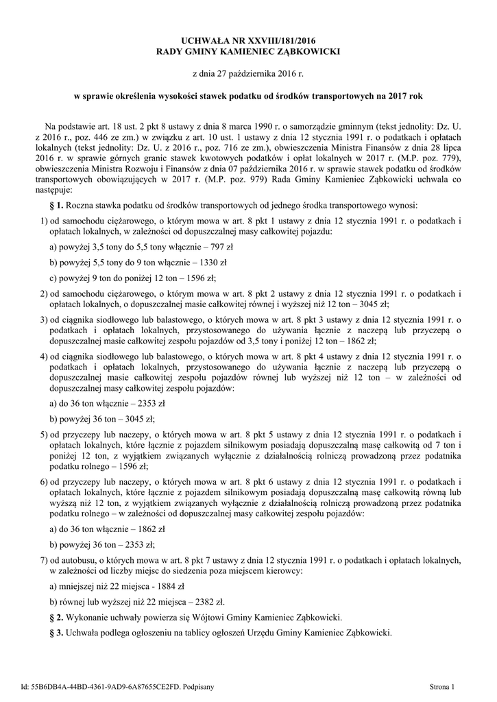 UCHWAŁA NR XXVIII/181/2016 RADY GMINY KAMIENIEC ZĄBKOWICKI z dnia 27 października 2016 r. w sprawie określenia wysokości stawek podatku od środków transportowych na 2017 rok Na podstawie art. 18 ust. 2 pkt 8 ustawy z dnia 8 marca 1990 r. o samorządzie gminnym (tekst jednolity: Dz. U. z 2016 r., poz. 446 ze zm.) w związku z art. 10 ust. 1 ustawy z dnia 12 stycznia 1991 r. o podatkach i opłatach lokalnych (tekst jednolity: Dz. U. z 2016 r., poz. 716 ze zm.), obwieszczenia Ministra Finansów z dnia 28 lipca 2016 r. w sprawie górnych granic stawek kwotowych podatków i opłat lokalnych w 2017 r. (M.P. poz. 779), obwieszczenia Ministra Rozwoju i Finansów z dnia 07 października 2016 r. w sprawie stawek podatku od środków transportowych obowiązujących w 2017 r. (M.P. poz. 979) Rada Gminy Kamieniec Ząbkowicki uchwala co następuje: § 1. Roczna stawka podatku od środków transportowych od jednego środka transportowego wynosi: 1) od samochodu ciężarowego, o którym mowa w art. 8 pkt 1 ustawy z dnia 12 stycznia 1991 r. o podatkach i opłatach lokalnych, w zależności od dopuszczalnej masy całkowitej pojazdu: a) powyżej 3,5 tony do 5,5 tony włącznie – 797 zł b) powyżej 5,5 tony do 9 ton włącznie – 1330 zł c) powyżej 9 ton do poniżej 12 ton – 1596 zł; 2) od samochodu ciężarowego, o którym mowa w art. 8 pkt 2 ustawy z dnia 12 stycznia 1991 r. o podatkach i opłatach lokalnych, o dopuszczalnej masie całkowitej równej i wyższej niż 12 ton – 3045 zł; 3) od ciągnika siodłowego lub balastowego, o których mowa w art. 8 pkt 3 ustawy z dnia 12 stycznia 1991 r. o podatkach i opłatach lokalnych, przystosowanego do używania łącznie z naczepą lub przyczepą o dopuszczalnej masie całkowitej zespołu pojazdów od 3,5 tony i poniżej 12 ton – 1862 zł; 4) od ciągnika siodłowego lub balastowego, o których mowa w art. 8 pkt 4 ustawy z dnia 12 stycznia 1991 r. o podatkach i opłatach lokalnych, przystosowanego do używania łącznie z naczepą lub przyczepą o dopuszczalnej masie całkowitej zespołu pojazdów równej lub wyższej niż 12 ton – w zależności od dopuszczalnej masy całkowitej zespołu pojazdów: a) do 36 ton włącznie – 2353 zł b) powyżej 36 ton – 3045 zł; 5) od przyczepy lub naczepy, o których mowa w art. 8 pkt 5 ustawy z dnia 12 stycznia 1991 r. o podatkach i opłatach lokalnych, które łącznie z pojazdem silnikowym posiadają dopuszczalną masę całkowitą od 7 ton i poniżej 12 ton, z wyjątkiem związanych wyłącznie z działalnością rolniczą prowadzoną przez podatnika podatku rolnego – 1596 zł; 6) od przyczepy lub naczepy, o których mowa w art. 8 pkt 6 ustawy z dnia 12 stycznia 1991 r. o podatkach i opłatach lokalnych, które łącznie z pojazdem silnikowym posiadają dopuszczalną masę całkowitą równą lub wyższą niż 12 ton, z wyjątkiem związanych wyłącznie z działalnością rolniczą prowadzoną przez podatnika podatku rolnego – w zależności od dopuszczalnej masy całkowitej zespołu pojazdów: a) do 36 ton włącznie – 1862 zł b) powyżej 36 ton – 2353 zł; 7) od autobusu, o których mowa w art. 8 pkt 7 ustawy z dnia 12 stycznia 1991 r. o podatkach i opłatach lokalnych, w zależności od liczby miejsc do siedzenia poza miejscem kierowcy: a) mniejszej niż 22 miejsca - 1884 zł b) równej lub wyższej niż 22 miejsca – 2382 zł. § 2. Wykonanie uchwały powierza się Wójtowi Gminy Kamieniec Ząbkowicki. § 3. Uchwała podlega ogłoszeniu na tablicy ogłoszeń Urzędu Gminy Kamieniec Ząbkowicki. Id: 55B6DB4A-44BD-4361-9AD9-6A87655CE2FD. Podpisany Strona 1 § 4. Uchwała podlega ogłoszeniu w Dzienniku Urzędowym Województwa Dolnośląskiego i wchodzi w życie po upływie 14 dni od daty jej ogłoszenia, z mocą obowiązującą od dnia 1 stycznia 2017 r. Id: 55B6DB4A-44BD-4361-9AD9-6A87655CE2FD. Podpisany Strona 2 UZASADNIENIE Na podstawie art. 10 ust. 1 oraz art. 12 ust. 4 ustawy z dnia 12 stycznia 1991 r. o podatkach i opłatach lokalnych (tekst jednolity: Dz. U. z 2016 r. poz. 716 ze zm.) Rada Gminy określa wysokość stawek podatku od środków transportowych oraz wprowadza inne niż wymienione w tejże ustawie zwolnienia. Rada Gminy Kamieniec Ząbkowicki co roku swoją uchwałą, stosownie do przepisów ustawy o podatkach i opłatach lokalnych kreuje politykę podatkową w zakresie swoich kompetencji. Oznacza to, że może ustalać wysokość stawek podatkowych w zakresie ustawowych limitów. Przedkładany projekt uchwały o stawkach kwotowych w podatku od środków transportowych na 2017 r. jest zgodny z ustawą z dnia 12 stycznia 1991 r. o podatkach i opłatach lokalnych. Stosownie do przepisów art. 20 ust. 1 wyżej powołanej ustawy określone zostały zasady wzrostu górnych stawek kwotowych podatków i opłat lokalnych - minister właściwy do spraw finansów publicznych ogłasza, w drodze obwieszczenia, w Dzienniku Urzędowym Rzeczypospolitej Polskiej „Monitor Polski”, górne granice stawek kwotowych podatku od nieruchomości (art. 5 ust. 1), podatku od środków transportowych (art. 10 ust. 1) oraz opłat lokalnych – opłaty targowej, miejscowej i uzdrowiskowej (art. 19 pkt 1). Stawki obowiązujące w danym roku podatkowym ulegają corocznie zmianie na następny rok podatkowy w stopniu odpowiadającym wskaźnikowi cen towarów i usług konsumpcyjnych w okresie pierwszego półrocza roku, w którym stawki ulegają zmianie, w stosunku do analogicznego okresu roku poprzedniego i są zaokrąglane w górę do pełnych groszy. Wskaźnik cen ustala się na podstawie komunikatu Prezesa Urzędu Statystycznego ogłoszonego w Dzienniku Urzędowym Rzeczypospolitej Polskiej "Monitor Polski" w terminie 20 dni po upływie pierwszego półrocza. Zgodnie z komunikatem Prezesa Głównego Urzędu Statystycznego z dnia 11 lipca 2016 r. w sprawie wskaźnika cen towarów i usług konsumpcyjnych w I półroczu 2016 r. wskaźnik cen towarów i usług konsumpcyjnych w I półroczu 2016 r