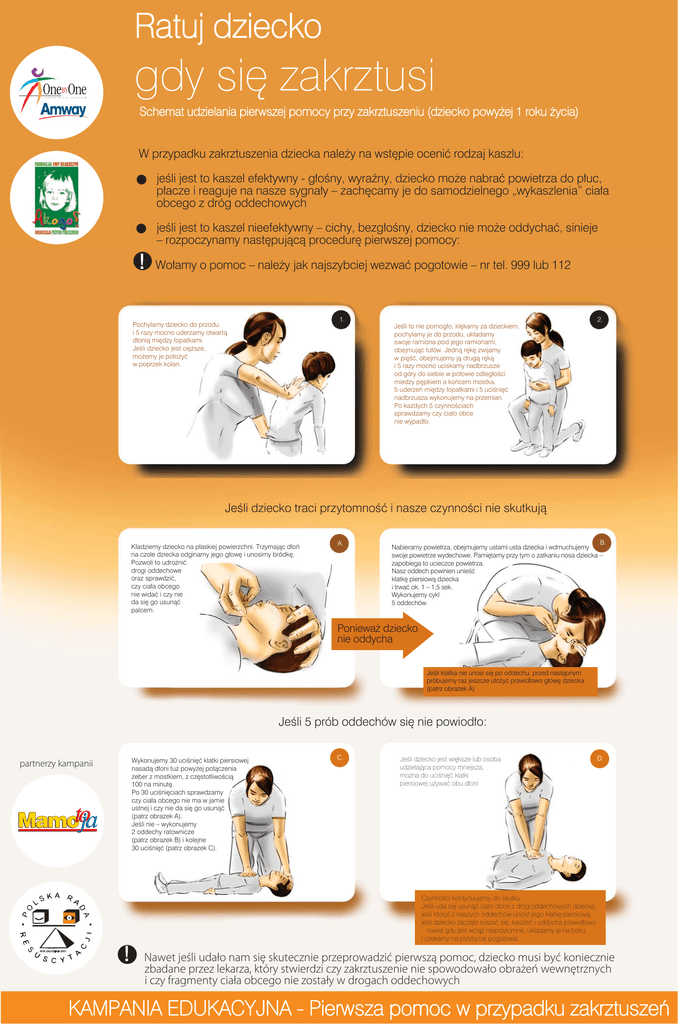Ratuj dziecko gdy się zakrztusi A. Schemat udzielania pierws pie wszej ej pomocy pomo y przy p y zakrztus za ztuszeniu eniu (dziec dziecko o powyżej p ej 1 roku u życia) cia) W przypadku zakrztuszenia dziecka należy na wstępie ocenić rodzaj kaszlu: jeśli jest to kaszel efektywny - głośny, wyraźny, dziecko może nabrać powietrza do płuc, płacze i reaguje na nasze sygnały – zachęcamy je do samodzielnego „wykaszlenia” ciała obcego z dróg oddechowych jeśli jest to kaszel nieefektywny – cichy, bezgłośny, dziecko nie może oddychać, sinieje – rozpoczynamy następującą procedurę pierwszej pomocy: ! Wołamy o pomoc – należy jak najszybciej wezwać pogotowie – nr tel. 999 lub 112 1. Pochylamy dziecko do przodu i 5 razy mocno uderzamy otwartą dłonią między łopatkami. Jeśli dziecko jest cięższe, możemy je położyć w poprzek kolan. Jeśli to nie pomogło, klękamy za dzieckiem, pochylamy je do przodu, układamy swoje ramiona pod jego ramionami, obejmując tułów. Jedną rękę zwijamy w pięść, obejmujemy ją drugą ręką i 5 razy mocno uciskamy nadbrzusze od góry do siebie w połowie odległości miedzy pępkiem a końcem mostka. 5 uderzeń między łopatkami i 5 uciśnięć nadbrzusza wykonujemy na przemian. Po każdych 5 czynnościach sprawdzamy czy ciało obce nie wypadło. 2. Jeśli dziecko traci przytomność i nasze czynności nie skutkują Kładziemy dziecko na płaskiej powierzchni. Trzymając dłoń na czole dziecka odginamy jego głowę i unosimy bródkę. Pozwoli to udrożnić drogi oddechowe oraz sprawdzić, czy ciała obcego nie widać i czy nie da się go usunąć palcem. A. B. Nabieramy powietrza, obejmujemy ustami usta dziecka i wdmuchujemy swoje powietrze wydechowe. Pamiętamy przy tym o zatkaniu nosa dziecka – zapobiega to ucieczce powietrza. Nasz oddech powinien unieść klatkę piersiową dziecka i trwać ok. 1 – 1,5 sek. Wykonujemy cykl 5 oddechów. Ponieważ dziecko nie oddycha Jeśli klatka nie unosi się po oddechu, przed następnym próbujemy raz jeszcze ułożyć prawidłowo głowę dziecka (patrz obrazek A) Jeśli 5 prób oddechów się nie powiodło: Wykonujemy 30 uciśnięć klatki piersiowej nasadą dłoni tuż powyżej połączenia żeber z mostkiem, z częstotliwością 100 na minutę. Po 30 uciśnięciach sprawdzamy czy ciała obcego nie ma w jamie ustnej i czy nie da się go usunąć (patrz obrazek A). Jeśli nie – wykonujemy 2 oddechy ratownicze (patrz obrazek B) i kolejne 30 uciśnięć (patrz obrazek C). partnerzy kampanii ! C. Jeśli dziecko jest większe lub osoba udzielająca pomocy mniejsza, można do uciśnięć klatki piersiowej używać obu dłoni D. Czynności kontynuujemy do skutku. Jeśli uda się usunąć ciało obce z dróg oddechowych dziecka, jeśli któryś z naszych oddechów uniósł jego klatkę piersiową, jeśli dziecko zaczęło ruszać się, kaszleć i oddycha prawidłowo – nawet gdy jest wciąż nieprzytomne, układamy je na boku i czekamy na przybycie pogotowia. Nawet jeśli udało nam się skutecznie przeprowadzić pierwszą pomoc, dziecko musi być koniecznie zbadane przez lekarza, który stwierdzi czy zakrztuszenie nie spowodowało obrażeń wewnętrznych i czy fragmenty ciała obcego nie zostały w drogach oddechowych KAMPANIA EDUKACYJNA - Pierwsza pomoc w przypadku zakrztuszeń