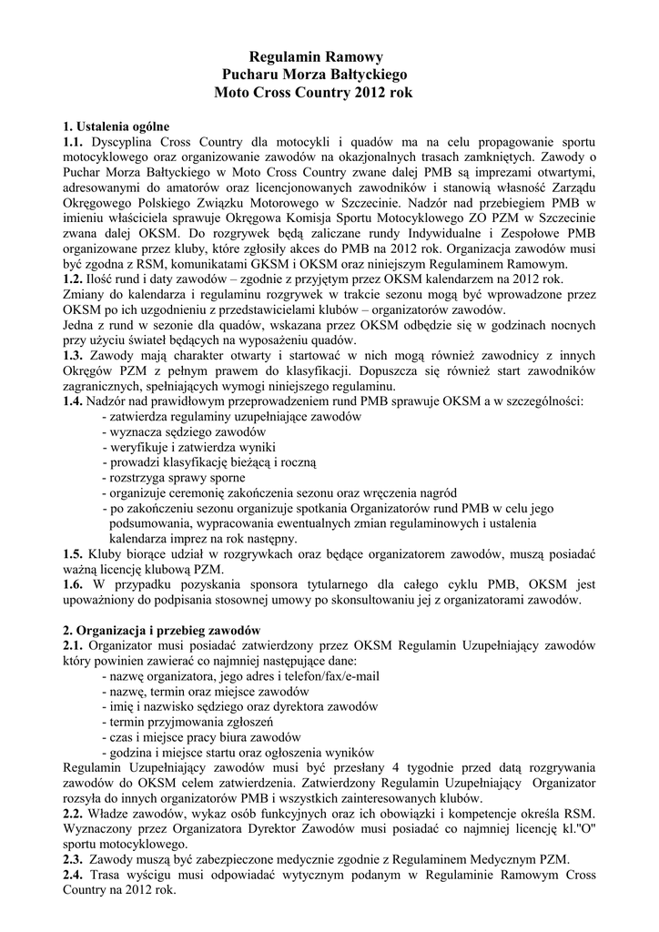 Regulamin Ramowy Pucharu Morza Bałtyckiego Moto Cross Country 2012 rok 1. Ustalenia ogólne 1.1. Dyscyplina Cross Country dla motocykli i quadów ma na celu propagowanie sportu motocyklowego oraz organizowanie zawodów na okazjonalnych trasach zamkniętych. Zawody o Puchar Morza Bałtyckiego w Moto Cross Country zwane dalej PMB są imprezami otwartymi, adresowanymi do amatorów oraz licencjonowanych zawodników i stanowią własność Zarządu Okręgowego Polskiego Związku Motorowego w Szczecinie. Nadzór nad przebiegiem PMB w imieniu właściciela sprawuje Okręgowa Komisja Sportu Motocyklowego ZO PZM w Szczecinie zwana dalej OKSM. Do rozgrywek będą zaliczane rundy Indywidualne i Zespołowe PMB organizowane przez kluby, które zgłosiły akces do PMB na 2012 rok. Organizacja zawodów musi być zgodna z RSM, komunikatami GKSM i OKSM oraz niniejszym Regulaminem Ramowym. 1.2. Ilość rund i daty zawodów – zgodnie z przyjętym przez OKSM kalendarzem na 2012 rok. Zmiany do kalendarza i regulaminu rozgrywek w trakcie sezonu mogą być wprowadzone przez OKSM po ich uzgodnieniu z przedstawicielami klubów – organizatorów zawodów. Jedna z rund w sezonie dla quadów, wskazana przez OKSM odbędzie się w godzinach nocnych przy użyciu świateł będących na wyposażeniu quadów. 1.3. Zawody mają charakter otwarty i startować w nich mogą również zawodnicy z innych Okręgów PZM z pełnym prawem do klasyfikacji. Dopuszcza się również start zawodników zagranicznych, spełniających wymogi niniejszego regulaminu. 1.4. Nadzór nad prawidłowym przeprowadzeniem rund PMB sprawuje OKSM a w szczególności: - zatwierdza regulaminy uzupełniające zawodów - wyznacza sędziego zawodów - weryfikuje i zatwierdza wyniki - prowadzi klasyfikację bieżącą i roczną - rozstrzyga sprawy sporne - organizuje ceremonię zakończenia sezonu oraz wręczenia nagród - po zakończeniu sezonu organizuje spotkania Organizatorów rund PMB w celu jego podsumowania, wypracowania ewentualnych zmian regulaminowych i ustalenia kalendarza imprez na rok następny. 1.5. Kluby biorące udział w rozgrywkach oraz będące organizatorem zawodów, muszą posiadać ważną licencję klubową PZM. 1.6. W przypadku pozyskania sponsora tytularnego dla całego cyklu PMB, OKSM jest upoważniony do podpisania stosownej umowy po skonsultowaniu jej z organizatorami zawodów. 2. Organizacja i przebieg zawodów 2.1. Organizator musi posiadać zatwierdzony przez OKSM Regulamin Uzupełniający zawodów który powinien zawierać co najmniej następujące dane: - nazwę organizatora, jego adres i telefon/fax/e-mail - nazwę, termin oraz miejsce zawodów - imię i nazwisko sędziego oraz dyrektora zawodów - termin przyjmowania zgłoszeń - czas i miejsce pracy biura zawodów - godzina i miejsce startu oraz ogłoszenia wyników Regulamin Uzupełniający zawodów musi być przesłany 4 tygodnie przed datą rozgrywania zawodów do OKSM celem zatwierdzenia. Zatwierdzony Regulamin Uzupełniający Organizator rozsyła do innych organizatorów PMB i wszystkich zainteresowanych klubów. 2.2. Władze zawodów, wykaz osób funkcyjnych oraz ich obowiązki i kompetencje określa RSM. Wyznaczony przez Organizatora Dyrektor Zawodów musi posiadać co najmniej licencję kl.''O'' sportu motocyklowego. 2.3. Zawody muszą być zabezpieczone medycznie zgodnie z Regulaminem Medycznym PZM. 2.4. Trasa wyścigu musi odpowiadać wytycznym podanym w Regulaminie Ramowym Cross Country na 2012 rok. 2.5. Procedura startu wg (Le Mans) Regulaminu Ramowego Cross Country na 2012 rok. Zasady ustawienia quadów na linii startu: po zakończeniu okrążenia zapoznawczego i ustawieniu na linii startu zawodnicy oczekują na quadach z uruchomionym silnikiem na podejście sędziego i w jego obecności kolejno dokonują wyłączenia zapłonu poprzez wyciągnięcie zrywki, po tej czynności oddalają się od quada bez możliwości dotykania pojazdu do chwili startu. 2.6. Strefa napraw i zasady obsługi wg Regulaminu Ramowego Cross Country na 2012 rok. 2.7. Zasady wykluczenia zawodnika z wyścigu – zgodnie z Regulaminem Ramowym Cross Country na 2012 rok. 3. Uczestnictwo w zawodach 3.1. Prawo startu mają zawodnicy z licencją C oraz B i A. Uczestnicy startujący pierwszy raz (nie posiadający jeszcze licencji), muszą przystąpić do egzaminu teoretycznego i praktycznego na certyfikat. W kolejnych zawodach obowiązuje ich posiadanie licencji C. Zasady uzyskiwania licencji zgodnie z RSM na 2012 rok. Egzamin teoretyczny należy przeprowadzić przed startem w dniu zawodów. 3.2. Uczestnicy bez licencji, którzy nie ukończyli 18 lat, muszą przedłożyć pisemną zgodę rodziców lub opiekuna prawnego (z podaniem numeru dokumentu tożsamości osoby podpisującej zgodę) na udział w zawodach. 3.3. Warunkiem dopuszczenia do udziału w zawodach jest: - dysponowanie pojazdem odebranym przez komisję techniczną - posiadanie certyfikatu i właściwej licencji ważnej na 2012 rok - okazanie dokumentu tożsamości (tylko uczestnik bez licencji) - posiadanie aktualnych badań lekarskich - posiadanie przez zawodników i uczestników niepełnoletnich kołnierza ochronnego - przedłożenie wypełnionej i podpisanej karty zgłoszenia – można dokonać zgłoszenia jednorazowo na wszystkie lub wybrane rundy w sezonie, wg załącznika nr 2 - opłacenie wpisowego 3.4. Wpisowe do zawodów wynosi 100zł za zawody jednodniowe i 180zł za dwudniowe, dla wszystkich zawodników. Wpisowe nie zawiera opłaty za transponder. Uczestnicy bez licencji wnoszą dodatkową opłatę 50zł za egzamin na certyfikat oraz 25zł na ubezpieczenie NNW. 3.5. Numery startowe nadaje organizator zawodów. Numer raz nadany zawodnikowi obowiązuje go przez cały sezon i nie może być przyznany innemu zawodnikowi. Każdy motocykl musi mieć trzy numery startowe, jeden na przedzie i dwa po obu bokach, w tylnej części pojazdu. Quady muszą mieć jeden numer z przodu, zamocowany powyżej przedniego zderzaka i pon