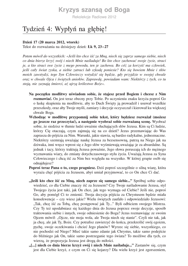 Kryzys szansą od Boga Rekolekcje Radiowe 2012 Tydzień 4: Wypłyń na głębię! Dzień 17 (20 marca 2012, wtorek) Tekst do rozważania na dzisiejszy dzień: Łk 9, 23– 27 Potem mówił do wszystkich: «Jeśli kto chce iść za Mną, niech się zaprze samego siebie, niech co dnia bierze krzyż swój i niech Mnie naśladuje! Bo kto chce zachować swoje życie, straci je, a kto straci swe życie z mego powodu, ten je zachowa. Bo cóż za korzyść ma człowiek, jeśli cały świat zyska, a siebie zatraci lub szkodę poniesie? Kto się bowiem Mnie i słów moich zawstydzi, tego Syn Człowieczy wstydzić się będzie, gdy przyjdzie w swojej chwale oraz w chwale Ojca i świętych aniołów. Zaprawdę, powiadam wam: Niektórzy z tych, co tu stoją, nie zaznają śmierci, aż ujrzą królestwo Boże». Na początku modlitwy uświadom sobie, że stajesz przed Bogiem i chcesz z Nim rozmawiać. On jest teraz obecny przy Tobie. Po uczynieniu znaku krzyża poproś Go o łaskę skupienia na modlitwie, aby to Duch Święty ją prowadził i usuwał wszelkie przeszkody, oraz aby Twoje myśli, zamiary i decyzje oczyszczał i kierował ku większej chwale Boga. Wchodząc w modlitwę przypomnij sobie tekst, który będziesz rozważał (możesz go jeszcze raz przeczytać), a następnie wyobraź sobie rozważaną scenę. Wyobraź sobie, że siedzisz w tłumie ludzi uważnie słuchających słów Jezusa. Kim są Ci ludzie, którzy Cię otaczają, czym zajmują się na co dzień? Jezus przemawiając do Was zaprasza do pójścia za Nim. Warunki, jakie stawia, są bardzo radykalne, jednoznaczne. Niektórzy szemrają uważając naukę Jezusa za bezsensowną, patrzą na Niego jak na dziwaka, inni wręcz wprost się z Jego słów wyśmiewają uważając je za absurdalne. Są jednak i tacy, którzy traktują Jezusa poważnie, Jego słowa poruszają ich do mężnego wyznawania wiary, do zmiany dotychczasowego stylu życia. Uważają Jezusa za Syna Człowieczego i chcą iść za Nim bez względu na wszystko. W której grupie osób się odnajdujesz? Poproś teraz Pana o to, czego pragniesz. Dziś poproś szczególnie o silną wiarę, która wyraża chęć pójścia za Jezusem, abyś umiał przyjmować, to co On chce Ci dać. „Jeśli kto chce iść za Mną, niech zaprze się samego siebie...” Spróbuj sobie odpowiedzieć, co dla Ciebie znaczy iść za Jezusem? Czy Twoje naśladowanie Jezusa, styl Twojego życia jest taki, jak On chce, jak tego wymaga od Ciebie? Jeśli nie, poproś Go, aby pomógł Ci to zmienić. Twoja decyzja pójścia za Chrystusem będzie miała konsekwencje – czy wiesz jakie? Wielu świętych zaufało i odpowiedziało Jezusowi: „Tak, chcę iść za Tobą, chcę postępować jak Ty...” Byli odbiciem swojego Mistrza. Czy Ty też upodabniasz się każdego dnia do Jezusa poprzez swoje decyzje, sposób traktowania siebie i innych, swoje odniesienie do Boga? Jezus rozmawiając ze swoim Ojcem mówił: „Ojcze, nie moja wola, ale Twoja niech się stanie”. Czyli nie tak, jak ja chcę, ale jak Ty, Boże. Czy potrafisz zawierzyć do końca, przekreślić swój egoizm, pychę, swoje oczekiwania i chcieć Jego planów? Wyrzec się siebie, wszystkiego, co nie pochodzi od Niego? Mieć takie samo zdanie jak Chrystus, takie samo podejście do bliźniego jak On, takie samo postrzeganie tego świata? To możliwe dla tych, co wierzą, że propozycja Jezusa jest drogą do miłości. „[...] niech co dnia bierze krzyż swój i niech Mnie naśladuje...” Zastanów się, czym jest dla Ciebie krzyż, z czym on Ci się kojarzy? Dla wielu krzyż jest zgorszeniem, karą, cierpieniem, dla innych zaś Miłością, drogą do nieba. Niektórzy codziennie klękają przed krzyżem, całują Go i biorą krzyż swojego życia, i z nim przeżywają każdy swój dzień. Wielu śpiewa: „nie zdejmę krzyża z mego serca choćby mi umrzeć trzeba, choć by mi groził kat-morderca, bo krzyż to klucz do nieba”. Głębokie słowa pieśni pomagają bardziej zrozumieć sens brania krzyża co dnia. Wziąć krzyż jak Jezus i dać się do niego przybić... nie odrzucać go... Wziąć krzyż i być gotowym na śmierć. Umrzeć dla Miłości... Czy jesteś na to zdecydowany? Jezus ostrzega przed złudnym pragnieniem tego świata i jego propozycji. W oczach świata można być „kimś”, ale kim jesteś w oczach Boga? Możesz pozyskać tutaj wiele, ale ile będzie to warte w Królestwie Bożym? Czy wziąłeś już swój krzyż, aby naśladować Jezusa? „[...] kto się bowiem Mnie i słów moich zawstydzi, tego Syn Człowieczy wstydzić się będzie...” Miłość, która każe iść za Jezusem, daje wolność, daje prawdziwą radość i pokój. Żyć dziś, tak jak On, przyjmować każde Jego Słowo, być na przekór temu co złe, mimo że dla niektórych może to być niezrozumiałe, nawet wyśmiane. Potrafisz tak żyć? Przyznanie się do Chrystusa, nie wstydzenie się swojej przynależności do Niego jest równoznaczne z tym, że On sam przyzna się do Ciebie w Dzień Sądu Ostatecznego. Czy miałeś takie sytuacje w swoim życiu, że wyparłeś się Boga, Kościoła? Nie chciałeś się przyznać do wiary? Jeśli tak, to wiedz że Chrystus zawsze na Ciebie czeka, miej więc odwagę, aby do Niego powrócić. Chrystus przygotował wiele miejsc w Królestwie Niebieskim i czeka na każdego z nas. Umarł za wszystkich, ale oczekuje Twojej odpowiedzi na swoją Miłość. Na koniec porozmawiaj z Jezusem o tym wszystkim, co zrodziło się w Twoim sercu pod wpływem dzisiejszej modlitwy. Wypowiedz przed Nim swoje uczucia – radości, pokoju, bezpieczeństwa, ale również smutku, obawy, lęku. Bądź szczery przed Panem. Możesz Mu podziękować za to, co odkryłeś lub poprosić Go o coś, czego bardzo potrzebujesz. Porozmawiaj z Nim przez chwilę serdecznie – jak przyjaciel z przyjacielem. Na zakończenie pomódl się słowami modlitwy „Ojcze nasz”. © Trójmiejska Wspólnota Życia Chrześcijańskiego www.wzch-trojmi