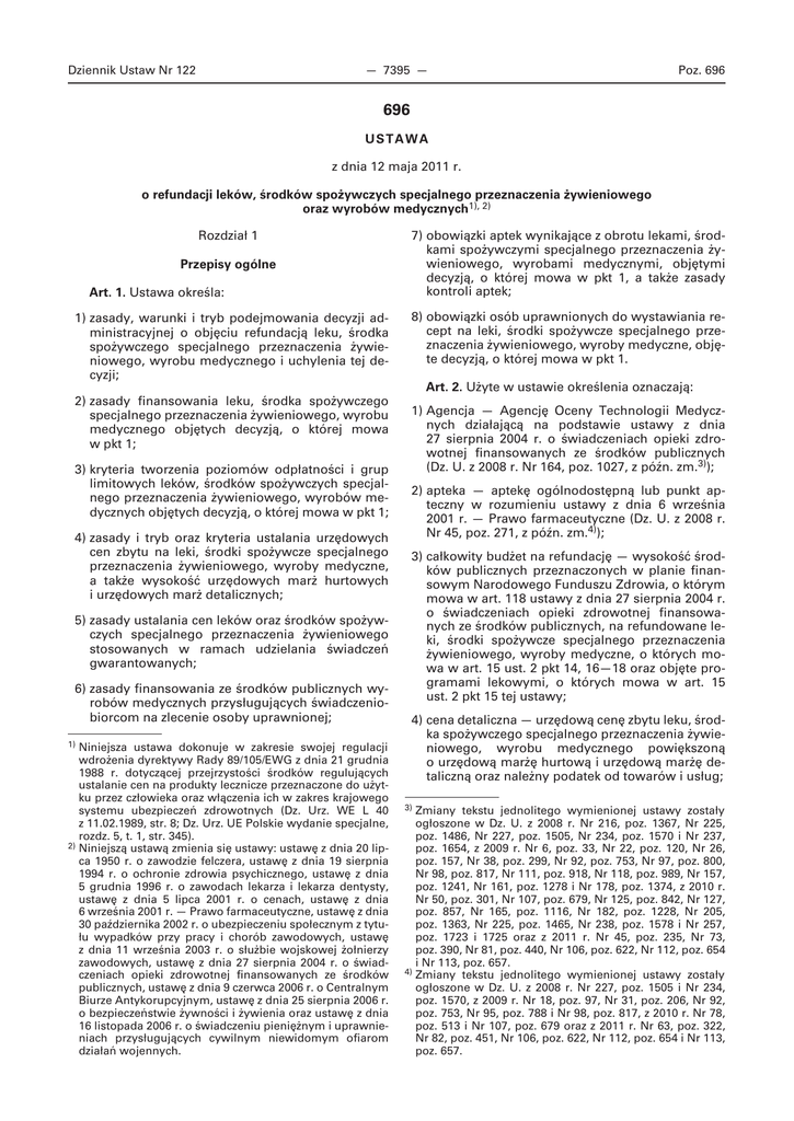 Dziennik Ustaw Nr 122 — 7395 — Poz. 696 696 USTA WA z dnia 12 maja 2011 r. o refundacji leków, środków spożywczych specjalnego przeznaczenia żywieniowego oraz wyrobów medycznych1), 2) Rozdział 1 Przepisy ogólne Art. 1. Ustawa określa: 1) zasady, warunki i tryb podejmowania decyzji administracyjnej o objęciu refundacją leku, środka spożywczego specjalnego przeznaczenia żywieniowego, wyrobu medycznego i uchylenia tej decyzji; 2) zasady finansowania leku, środka spożywczego specjalnego przeznaczenia żywieniowego, wyrobu medycznego objętych decyzją, o której mowa w pkt 1; 3) kryteria tworzenia poziomów odpłatności i grup limitowych leków, środków spożywczych specjalnego przeznaczenia żywieniowego, wyrobów medycznych objętych decyzją, o której mowa w pkt 1; 4) zasady i tryb oraz kryteria ustalania urzędowych cen zbytu na leki, środki spożywcze specjalnego przeznaczenia żywieniowego, wyroby medyczne, a także wysokość urzędowych marż hurtowych i urzędowych marż detalicznych; 5) zasady ustalania cen leków oraz środków spożywczych specjalnego przeznaczenia żywieniowego stosowanych w ramach udzielania świadczeń gwarantowanych; 6) zasady finansowania ze środków publicznych wyrobów medycznych przysługujących świadczeniobiorcom na zlecenie osoby uprawnionej; 1) Niniejsza ustawa dokonuje w zakresie swojej regulacji wdrożenia dyrektywy Rady 89/105/EWG z dnia 21 grudnia 1988 r. dotyczącej przejrzystości środków regulujących ustalanie cen na produkty lecznicze przeznaczone do użytku przez człowieka oraz włączenia ich w zakres krajowego systemu ubezpieczeń zdrowotnych (Dz. Urz. WE L 40 z 11.02.1989, str. 8; Dz. Urz. UE Polskie wydanie specjalne, rozdz. 5, t. 1, str. 345). 2) Niniejszą ustawą zmienia się ustawy: ustawę z dnia 20 lipca 1950 r. o zawodzie felczera, ustawę z dnia 19 sierpnia 1994 r. o ochronie zdrowia psychicznego, ustawę z dnia 5 grudnia 1996 r. o zawodach lekarza i lekarza dentysty, ustawę z dnia 5 lipca 2001 r. o cenach, ustawę z dnia 6 września 2001 r. — Prawo farmaceutyczne, ustawę z dnia 30 października 2002 r. o ubezpieczeniu społecznym z tytułu wypadków przy pracy i chorób zawodowych, ustawę z dnia 11 września 2003 r. o służbie wojskowej żołnierzy zawodowych, ustawę z dnia 27 sierpnia 2004 r. o świadczeniach opieki zdrowotnej finansowanych ze środków publicznych, ustawę z dnia 9 czerwca 2006 r. o Centralnym Biurze Antykorupcyjnym, ustawę z dnia 25 sierpnia 2006 r. o bezpieczeństwie żywności i żywienia oraz ustawę z dnia 16 listopada 2006 r. o świadczeniu pieniężnym i uprawnieniach przysługujących cywilnym niewidomym ofiarom działań wojennych. 7) obowiązki aptek wynikające z obrotu lekami, środkami spożywczymi specjalnego przeznaczenia żywieniowego, wyrobami medycznymi, objętymi decyzją, o której mowa w pkt 1, a także zasady kontroli aptek; 8) obowiązki osób uprawnionych do wystawiania recept na leki, środki spożywcze specjalnego przeznaczenia żywieniowego, wyroby medyczne, objęte decyzją, o której mowa w pkt 1. Art. 2. Użyte w ustawie określenia oznaczają: 1) Agencja — Agencję Oceny Technologii Medycznych działającą na podstawie ustawy z dnia 27 sierpnia 2004 r. o świadczeniach opieki zdrowotnej finansowanych ze środków publicznych (Dz. U. z 2008 r. Nr 164, poz. 1027, z późn. zm.3)); 2) apteka — aptekę ogólnodostępną lub punkt apteczny w rozumieniu ustawy z dnia 6 września 2001 r. — Prawo farmaceutyczne (Dz. U. z 2008 r. Nr 45, poz. 271, z późn. zm.4)); 3) całkowity budżet na refundację — wysokość środków publicznych przeznaczonych w planie finansowym Narodowego Funduszu Zdrowia, o którym mowa w art. 118 ustawy z dnia 27 sierpnia 2004 r. o świadczeniach opieki zdrowotnej finansowanych ze środków publicznych, na refundowane leki, środki spożywcze specjalnego przeznaczenia żywieniowego, wyroby medyczne, o których mowa w art. 15 ust. 2 pkt 14, 16—18 oraz objęte programami lekowymi, o których mowa w art. 15 ust. 2 pkt 15 tej ustawy; 4) cena detaliczna — urzędową cenę zbytu leku, środka spożywczego specjalnego przeznaczenia żywieniowego, wyrobu medycznego powiększoną o urzędową marżę hurtową i urzędową marżę detaliczną oraz należny podatek od towarów i usług; 3) Zmiany tekstu jednolitego wymienionej ustawy zostały ogłoszone w Dz. U. z 2008 r. Nr 216, poz. 1367, Nr 225, poz. 1486, Nr 227, poz. 1505, Nr 234, poz. 1570 i Nr 237, poz. 1654, z 2009 r. Nr 6, poz. 33, Nr 22, poz. 120, Nr 26, poz. 157, Nr 38, poz. 299, Nr 92, poz. 753, Nr 97, poz. 800, Nr 98, poz. 817, Nr 111, poz. 918, Nr 118, poz. 989, Nr 157, poz. 1241, Nr 161, poz. 1278 i Nr 178, poz. 1374, z 2010 r. Nr 50, poz. 301, Nr 107, poz. 679, Nr 125, poz. 842, Nr 127, poz. 857, Nr 165, poz. 1116, Nr 182, poz. 1228, Nr 205, poz. 1363, Nr 225, poz. 1465, Nr 238, poz. 1578 i Nr 257, poz. 1723 i 1725 oraz z 2011 r. Nr 45, poz. 235, Nr 73, poz. 390, Nr 81, poz. 440, Nr 106, poz. 622, Nr 112, poz. 654 i Nr 113, poz. 657. 4) Zmiany tekstu jednolitego wymienionej ustawy zostały ogłoszone w Dz. U. z 2008 r. Nr 227, poz. 1505 i Nr 234, poz. 1570, z 2009 r. Nr 18, poz. 97, Nr 31, poz. 206, Nr 92, poz. 753, Nr 95, poz. 788 i Nr 98, poz. 817, z 2010 r. Nr 78, poz. 513 i Nr 107, poz. 679 oraz z 2011 r. Nr 63, poz. 322, Nr 82, poz. 451, Nr 106, poz. 622, Nr 112, poz. 654 i Nr 113, poz. 657. Dziennik Ustaw Nr 122 — 7396 — 5) cena hurtowa — urzędową cenę zbytu leku, środka spożywczego specjalnego przeznaczenia żywieniowego, wyrobu medycznego powiększoną o urzędową marżę hurtową oraz należny podatek od towarów i usług; 6) cena zbytu netto — cenę sprzedaży leku, środka spożywczego specjalnego przeznaczenia żywieniowego, wyrobu medycznego do podmiotów uprawnionych do obrotu, nieuwzględniającą należnego podatku od towarów i usług; 7) DDD — dobową dawkę leku ustaloną przez Światową Organizację Zdrowia; 8) Fundusz 