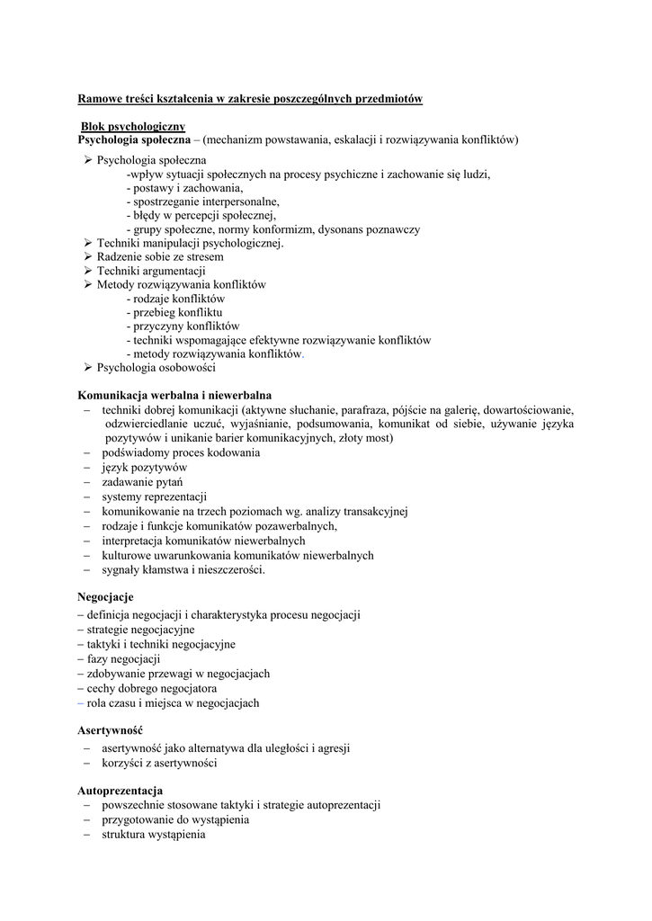 Ramowe treści kształcenia w zakresie poszczególnych przedmiotów Blok psychologiczny Psychologia społeczna – (mechanizm powstawania, eskalacji i rozwiązywania konfliktów) Psychologia społeczna -wpływ sytuacji społecznych na procesy psychiczne i zachowanie się ludzi, - postawy i zachowania, - spostrzeganie interpersonalne, - błędy w percepcji społecznej, - grupy społeczne, normy konformizm, dysonans poznawczy Techniki manipulacji psychologicznej. Radzenie sobie ze stresem Techniki argumentacji Metody rozwiązywania konfliktów - rodzaje konfliktów - przebieg konfliktu - przyczyny konfliktów - techniki wspomagające efektywne rozwiązywanie konfliktów - metody rozwiązywania konfliktów. Psychologia osobowości Komunikacja werbalna i niewerbalna − techniki dobrej komunikacji (aktywne słuchanie, parafraza, pójście na galerię, dowartościowanie, odzwierciedlanie uczuć, wyjaśnianie, podsumowania, komunikat od siebie, używanie języka pozytywów i unikanie barier komunikacyjnych, złoty most) − podświadomy proces kodowania − język pozytywów − zadawanie pytań − systemy reprezentacji − komunikowanie na trzech poziomach wg. analizy transakcyjnej − rodzaje i funkcje komunikatów pozawerbalnych, − interpretacja komunikatów niewerbalnych − kulturowe uwarunkowania komunikatów niewerbalnych − sygnały kłamstwa i nieszczerości. Negocjacje − definicja negocjacji i charakterystyka procesu negocjacji − strategie negocjacyjne − taktyki i techniki negocjacyjne − fazy negocjacji − zdobywanie przewagi w negocjacjach − cechy dobrego negocjatora − rola czasu i miejsca w negocjacjach Asertywność − asertywność jako alternatywa dla uległości i agresji − korzyści z asertywności Autoprezentacja − powszechnie stosowane taktyki i strategie autoprezentacji − przygotowanie do wystąpienia − struktura wystąpienia − radzenie sobie z tremą − sposoby skupiania uwagi audytorium − tworzenie własnego wizerunku Coaching − ABC coachingu –zasady coachingu. Czym jest caching? Czym nie jest? − Mediator jako coach − Strzała coachingu − 4 pytania, które zmieniają wszystko – rama rezultatu Blok prawny Aspekty prawne mediacji cywilnych, gospodarczych, pracowniczych − pojęcie mediacji , przedmiot mediacji, mediator, postępowanie mediacyjne w polskim prawie cywilnym i gospodarczym − rodzaje postępowań mediacyjnych − przebieg postępowania mediacyjnego − koszty postępowania − wzory postanowień − ugoda mediacyjna w polskim prawie cywilnym gospodarczym, pracowniczym − zapoznanie z wybranymi fragmentami kodeksu cywilnego, gospodarczego, pracy − procedury, m.in. pisanie ugód gospodarczych sądowych i pozasądowych Aspekty prawne mediacji rodzinnych − pojęcie mediacji , przedmiot mediacji, mediator, postępowanie mediacyjne w polskim prawie cywilnym i rodzinnym − koszty postępowania − wzory postanowień − ugoda mediacyjna w polskim prawie cywilnym rodzinnym − zapoznanie z wybranymi fragmentami kodeksu cywilnego, rodzinnego − procedury – m.in. pisanie ugód w sprawach rodzinnych – rozwody, separacje, kontakty z dziećmi, alimentacja – sądowych i pozasądowych Aspekty prawne mediacji karnych i z nieletnim sprawcą czynu karalnego − źródła umocowania prawnego − postępowanie w sprawach karnych. Osoba godna zaufania – mediator − postępowanie w sprawach nieletnich. Osoba godna zaufania – mediator − mediacja pośrednia − typy spraw najbardziej nadających się i najczęściej kierowanych do mediacji w sprawach karnych i w sprawach nieletnich − zapoznanie z wybranymi fragmentami kodeksu karnego i ustawy o postępowaniu w sprawach nieletnich − procedury – m.in. pisanie ugód, wnioski Blok mediacyjny Sprawiedliwość naprawcza a sprawiedliwość karna- Wprowadzenie do mediacji - idea sprawiedliwości naprawczej i jej formy - definicje i idee mediacji - rozwój alternatywnych metod rozwiązywania sporów w Stanach Zjednoczonych i w innych krajach - cel mediacji, rodzaje mediacji, zasady mediacji, reguły postępowania , procedury mediacyjne - korzyści wynikające z mediacji - kompetencje mediatora - czas i miejsce mediacji - standardy prowadzenia mediacji i postępowania mediatora - podstawowa wiedza z zakresu etyki - zapoznanie z Kodeksem Mediatora PCM - zasady etycznego postępowania człowieka a mediatora w szczególności, - kwalifikacje moralno – etyczne mediatora - przykłady etycznego i nieetycznego zachowania mediatora Mediacje cywilne, gospodarcze w sprawach sądowych. Mediacje biznesowe – pozasądowe - procedura, etapy mediacji cywilnych - procedura, etapy mediacji gospodarczych - techniki mediacyjne charakterystyczne dla mediacji cywilnych sądowych i pozasądowych - techniki mediacyjne charakterystyczne dla mediacji gospodarczych sądowych i pozasądowych - budowanie równowagi stron w mediacjach cywilnych z udziałem osób fizycznych i osób prawnych - prowadzenie dokumentacji mediacji pozasądowych i sądowych - współpraca pełnomocnika w mediacjach cywilnych i gospodarczych z mediatorem - różnorodność ról pełnomocnika w mediacjach cywilnych i gospodarczych Mediacje rodzinne - procedura, etapy mediacji rodzinnej - techniki mediacji charakterystyczne dla mediacji rodzinnej - mediacja w sytuacji różnych sytuacji kryzysowych w rodzinie - mediacja okołorozwodowa - specyficzna rola mediatora rodzinnego - praca w parze mediatorów - rozwód w ujęciu małżonków, dzieci, rodziny, przyjaciół, środowiska – etapy, fazy - role dziecka w sytuacji rozwodu rodziców - przygotowanie planu wychowawczego - prowadzenie dokumentacji sądowej - mediacja ofiara – sprawca w sytuacji rodziny – czyli mediacja a przemoc w rodzinie Mediacje pracownicze − specyfika mediacji pracowniczych − relacje interpersonalne w miejscu pracy − rola mediatora uprawnionego: - mediator życzliwie wspierający, mediato kierowniczoadministracyjny, mediator zorientowany na wła