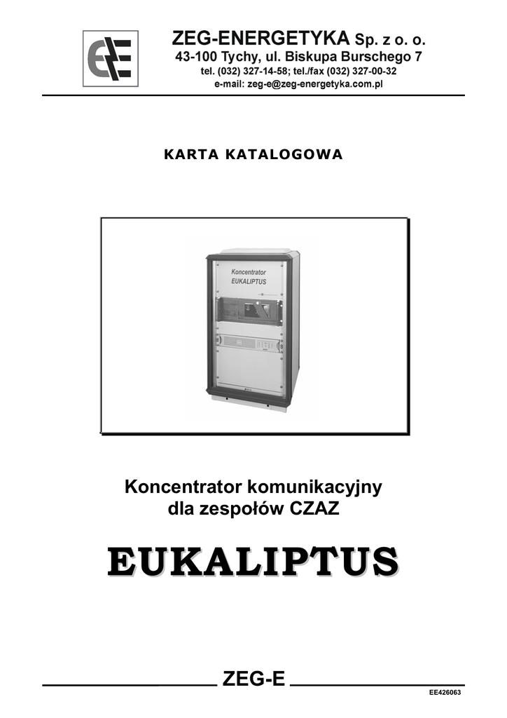 KARTA KATALOGOWA Koncentrator komunikacyjny dla zespołów CZAZ EUKALIPTUS ZEG-E EE426063 Koncentrator komunikacyjny Eukaliptus dla zespołów CZAZ KARTA KATALOGOWA PRZEZNACZENIE Koncentrator komunikacyjny Eukaliptus przeznaczony jest do zapewnienia zdalnego dostępu, kontroli, sterowania oraz nadzoru nad cyfrowymi zespołami automatyki zabezpieczeniowej typu CZAZ. Zapewnia także wymianę informacji pomiędzy zabezpieczeniami a nadrzędnym systemem sterowania. CHARAKTERYSTYKA OGÓLNA Koncentrator zbudowany jest w oparciu o komputer w wykonaniu przemysłowym pracujący pod kontrolą systemu operacyjnego Linux. W zależności od wyposażenia posiada następujące interfejsy zewnętrzne: • RS-485 (master) – przeznaczony dla podłączenia urządzeń pracujących w protokole Modbus-RTU; • RS-485 (slave) – przeznaczony dla systemu nadrzędnego (komunikacja w protokole Modbus-RTU); • RS-485 (slave) – przeznaczony dla systemu dyspozytorskiego (komunikacja w protokole IEC-870-5-103); • Ethernet – przeznaczony dla systemu nadrzędnego (komunikacja w protokole Open-Modbus* – zgodny ze specyfikacją firmy Modicon); * ) Protokół OpenModbus jest odmianą protokołu Modbus opracowaną przez firmę Modicon, w którym wymiana danych odbywa się poprzez sieć TCP/IP. Dzięki temu do komunikacji można wykorzystać szereg mediów komunikacyjnych np.: sieć Ethernet, połączenie modemowe, sieć bezprzewodową. -2- EE426063 Koncentrator komunikacyjny Eukaliptus dla zespołów CZAZ KARTA KATALOGOWA FUNKCJE Koncentrator zapewnia ciągłą kontrolę podłączonych do niego zespołów realizując między innymi funkcje automatycznego i cyklicznego pobierania plików zakłóceń rejestrowanych w podłączonych urządzeniach. W ten sposób oprogramowanie sterujące uzyskuje szybki i wygodny dostęp do archiwum plików zakłóceń zarejestrowanych w poszczególnych zespołach CZAZ. Korzystając z jednego z dostępnych standardów: GPS, DCF, NTP (Network Time Protocol) może być zapewniona na bieżąca aktualizacja i synchronizacja czasu pracy zespołów CZAZ pracujących w sieci. Stosując protokół IEC-870-5-103 możliwe jest podłączenie urządzeń typu CZAZ do nadrzędnego systemu operatorskiego obsługującego ten protokół. W układzie tym koncentrator udostępnia z podłączonych do niego urządzeń następujące parametry: bieżące pomiary, zdarzenia, sygnalizacje jak również stan liczników zadziałania poszczególnych zabezpieczeń. Koncentrator daje również możliwość podłączenia dowolnych urządzeń firm trzecich pracujących w protokole Modbus-RTU umożliwiając zdalny dostęp do nich w protokole Open-Modbus poprzez łącze modemowe lub sieć Ethernet. OPROGRAMOWANIE Wraz z koncentratorem dostarczane jest oprogramowanie stanowiska inżynierskiego do monitoringu i sterowania cyfrowymi zespołami automatyki zabezpiecziowej CZAZ oparte na nowoczesnej architekturze programowej klient-serwer, które umożliwia pełny monitoring, kontrolę i sterowanie szeroką gamą urządzeń przeznaczonych do pracy zarówno w zabezpieczeniach średnich i wysokich napięć jak i w zespołach bloków generator-transformator. Oprogramowanie pracuje pod kontrolą systemów operacyjnych Windows 98/2000/XP i realizuje następujące funkcje: • • • • • • • • • Dostęp do nastaw zabezpieczeń i układów, Kontrola i podgląd aktualnego stanu urządzenia, Przegląd aktualnego stanu zabezpieczeń, Podgląd pomiarów, Wysyłanie poleceń sterowniczych, Przeprowadzanie testów funkcjonalnych, Możliwość zmiany hasła dostępu, Dostęp do autonomicznego rejestratora zdarzeń (zadziałanie zabezpieczeń), Możliwość dostępu do archiwum rejestratora zakłóceń, podgląd i możliwość wydruku oraz eksport do formatu Comtrade lub mapy bitowej. -3- EE426063 KARTA KATALOGOWA Koncentrator komunikacyjny Eukaliptus dla zespołów CZAZ PARAMETRY TECHNICZNE Zasilanie: - napięcie zasilania - częstotliwość - czas pracy baterii 160 do 286 V∼ 47 do 63 Hz od 3 do 6 lat, zależnie od liczby cykli rozładowania i temperatury otoczenia - powrót do pracy >50% pojemności baterii Poziom hałasu: <42 dBA Warunki środowiskowe: - temperatura otoczenia - wilgotność względna - poziom pracy - poziom przechowywania 0°C do +40°C 0 do 70%, niekondensująca 0 do +3000 m n.p.m. 0 do +15000 m n.p.m. Wymiary zewnętrzne, masa: - wysokość, szerokość, głębokość - masa 1080 x 600 x 600mm 60kg Kompatybilność elektromagnetyczna PN-EN 55022:2000 Klasa A Bezpieczeństwo urządzeń laserowych PN-EN 60825-2 Klasa 1 Stopień ochrony obudowy: IP40 Zgodność z normami: PN-EN 55022:2000, PN-EN 60950:2002(U), PN-EN 500912:2002(U), PN-EN 62040-1-2:2003(U), PN-EN 60825-2:2001, PN-EN 60529:2003, PN-EN 55024:2000 Parametry interfejsów RS-485: - optoizolacja - zabezpieczenie przeciwprzepięciowe 2kV 25kV EST Tor światłowodowy: Typ światłowodu multimode: 50/125, 62.5/125 Typ złącz: ST Typ źródła światła: LED/820nm Max moc optyczna nadajnika: -7dBm Tor LAN (ethernet) Typ kabla: Rodzaj wtyku: Maksymalna sumaryczna liczba portów RS-485: 16 Maksymalna liczba obsługiwanych urządzeń: 247 -4- UTP kat. 5 RJ-45 EE426063 Koncentrator komunikacyjny Eukaliptus dla zespołów CZAZ KARTA KATALOGOWA SZKIC WYMIAROWY 600 1000 1100 600 Smart-UPS T E ST 700 600 APC 600 SZKIC WYMIAROWY KONCENTRATORA KOMUNIKACYJNEGO DLA ZESPOLOW TYPU CZAZ -5- EE426063 KARTA KATALOGOWA Koncentrator komunikacyjny Eukaliptus dla zespołów CZAZ SPOSÓB ZAMAWIANIA Przy zamówieniu należy wyspecyfikować podane poniżej parametry koncentratora wraz z wyborem odpowiedniej opcji. Parametr koncentratora Dostępne opcje Liczba portów RS-485 (master) • • Liczba portów RS-485 (slave) • skrętka światłowód Port RS-485 (slave) dla protokołu IEC-870-5-103 • • skrętka światłowód • • (10MHz) UTP (100MHz) UTP światłowód DCF 77 GPS NTP (Network Time Protocol v3 lub v4) Typ łącza w sieci Ethernet • • • Rodzaj ź