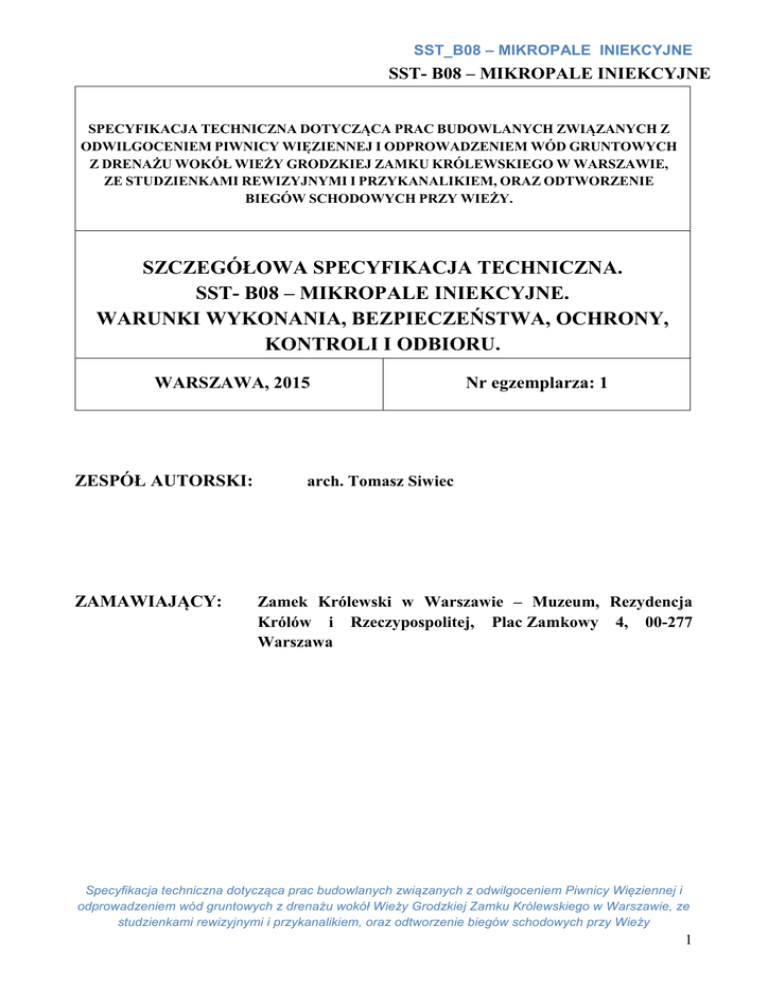 SST_B08 – MIKROPALE INIEKCYJNE SST- B08 – MIKROPALE INIEKCYJNE SPECYFIKACJA TECHNICZNA DOTYCZĄCA PRAC BUDOWLANYCH ZWIĄZANYCH Z ODWILGOCENIEM PIWNICY WIĘZIENNEJ I ODPROWADZENIEM WÓD GRUNTOWYCH Z DRENAŻU WOKÓŁ WIEŻY GRODZKIEJ ZAMKU KRÓLEWSKIEGO W WARSZAWIE, ZE STUDZIENKAMI REWIZYJNYMI I PRZYKANALIKIEM, ORAZ ODTWORZENIE BIEGÓW SCHODOWYCH PRZY WIEŻY. SZCZEGÓŁOWA SPECYFIKACJA TECHNICZNA. SST- B08 – MIKROPALE INIEKCYJNE. WARUNKI WYKONANIA, BEZPIECZEŃSTWA, OCHRONY, KONTROLI I ODBIORU. WARSZAWA, 2015 ZESPÓŁ AUTORSKI: ZAMAWIAJĄCY: Nr egzemplarza: 1 arch. Tomasz Siwiec Zamek Królewski w Warszawie – Muzeum, Rezydencja Królów i Rzeczypospolitej, Plac Zamkowy 4, 00-277 Warszawa Specyfikacja techniczna dotycząca prac budowlanych związanych z odwilgoceniem Piwnicy Więziennej i odprowadzeniem wód gruntowych z drenażu wokół Wieży Grodzkiej Zamku Królewskiego w Warszawie, ze studzienkami rewizyjnymi i przykanalikiem, oraz odtworzenie biegów schodowych przy Wieży 1 SST_B08 – MIKROPALE INIEKCYJNE Spis treści 1. WSTĘP 1.1. Przedmiot ST 1.2. Zakres stosowania ST 1.3. Zakres robót objętych ST 1.4. Ogólne wymagania dotyczące robót. 2. MATERIAŁY 2.1. Zaczyn cementowy 2.2. Zbrojenie 3. SPRZĘT 4. TRANSPORT 4.1. Ogólne wymagania dotyczące transportu 4.2. Środki transportu 5. WYKONANIE ROBÓT 5.1. Ogólna charakterystyka mikropali 5.2. Wyznaczenie osi mikropali 5.3. Sposób wykonania robót 5.4. Roboty wykończeniowe 6. KONTROLA JAKOŚCI 6.1. Zakres kontroli 6.2. Kontrola warunków gruntowych 6.3. Kontrola materiałów 6.4. Kontrola robót i ich zgodności z Dokumentacją Projektową 6.5. Tolerancje wykonania 7. OBMIAR ROBÓT 8. ODBIÓR ROBÓT 8.1. Zakres odbiorów 8.2. Sposób postępowania w przypadku uzyskania negatywnych wyników badań 9. PODSTAWA PŁATNOŚCI 10. PRZEPISY ZWIĄZANE Specyfikacja techniczna dotycząca prac budowlanych związanych z odwilgoceniem Piwnicy Więziennej i odprowadzeniem wód gruntowych z drenażu wokół Wieży Grodzkiej Zamku Królewskiego w Warszawie, ze studzienkami rewizyjnymi i przykanalikiem, oraz odtworzenie biegów schodowych przy Wieży 2 SST_B08 – MIKROPALE INIEKCYJNE SPECYFIKACJA TECHNICZNA MIKROPALI INIEKCYJNYCH 1. WSTĘP 1.1. Przedmiot ST Przedmiotem niniejszej Specyfikacji Technicznej są wymagania dotyczące wykonania, odbioru robót i badań kontrolnych związanych z wykonywaniem mikropali iniekcyjnych1. W ramach odwilgocenia Piwnicy Więziennej i odprowadzenia wód gruntowych z drenażu wokół Wieży Grodzkiej Zamku Królewskiego w Warszawie, ze studzienkami rewizyjnymi i przykanalikiem , oraz odtworzenia biegów schodowych przy Wieży 1.2. Zakres stosowania ST Przykładowa Specyfikacja Techniczna może służyć do opracowania Szczegółowej Specyfikacji Technicznej, która jest stosowana jako dokument przetargowy i kontraktowy przy zlecaniu i realizacji robót wymienionych w p.1.1. 1.3. Zakres robót objętych ST Ustalenia zawarte w niniejszej specyfikacji dotyczą wykonania robót wymienionych w p. 1.1., związanych z wykonywaniem mikropali iniekcyjnych. Mikropale stosuje się do posadowienia obiektów mostowych, przemysłowych, hydrotechnicznych i innych obiektów budowlanych, gdy warunki gruntowe wykluczają posadowienie bezpośrednie lub wykonane już obiekty wymagają wzmocnienia: - fundamentów bezpośrednich, - fundamentów palowych, - konstrukcji oporowych. Mikropale wykonuje się pod konstrukcją fundamentu lub w bezpośredniej jego bliskości w celu przeniesienia: - całkowitych obciążeń pionowych i poziomych, - części obciążeń wynikających z niedoboru nośności istniejącego fundamentu. Mikropale wykonuje się pionowe i ukośne, nawet o znacznym kącie nachylenia. 1.4. Ogólne wymagania dotyczące robót. Wykonawca robót jest odpowiedzialny za jakość ich wykonania oraz za zgodność z dokumentacją projektową, ST i poleceniami nadzoru robót ze strony Zamawiającego. 1.4.1. Dokumentacja techniczna Dokumentacja techniczna na podstawie, której wykonuje się mikropale iniekcyjne powinna zawierać: - plan urządzeń i instalacji podziemnych w miejscu budowy, dostępne informacje o istniejących fundamentach lub innych przeszkodach oraz, w razie potrzeby, wymagania dotyczące zabezpieczeń i sprawdzania w czasie robót rzeczywistego położenia urządzeń, - dokumentację badań podłoża, podającą budowę geologiczną, parametry geotechniczne warstw gruntu, poziomy występowania i poziomy piezometryczne wód gruntowych, dane o przepuszczalności warstw oraz składzie chemicznym wód i agresywności środowiska, - projekt wykonawczy fundamentu palowego lub wzmocnienia istniejącego fundamentu, 1 Mikropale iniekcyjne - należą do grupy pali małośrednicowych (poniżej 300 mm) i odznaczają się zwiększoną nośnością jednostkową pobocznicy w stosunku do pali wykonanych metodami klasycznymi, wynikającą z zastosowania iniekcji o stosunkowo dużych ciśnieniach przy ich formowaniu Specyfikacja techniczna dotycząca prac budowlanych związanych z odwilgoceniem Piwnicy Więziennej i odprowadzeniem wód gruntowych z drenażu wokół Wieży Grodzkiej Zamku Królewskiego w Warszawie, ze studzienkami rewizyjnymi i przykanalikiem, oraz odtworzenie biegów schodowych przy Wieży 3 SST_B08 – MIKROPALE INIEKCYJNE - na życzenie zamawiającego Program Zapewnienia Jakości, wymagania BHP. Dokumentacja technologiczna powinna być opracowana przedsiębiorstwo wykonujące mikropale albo przez nie uzgodniona. przez specjalistyczne 1.4.2. Kierownictwo i nadzór robót W czasie robót należy zapewnić dozór techniczny ze strony wykonawcy i nadzór ze strony zamawiającego. Niezbędna jest obecność odpowiedzialnego kierownika robót lub jego kompetentnego zastępcy. Przebieg robót powinien być bieżąco dokumentowany w dzienniku budowy oraz w metrykach mikropali. 1.4.3. Zgodność z dokumentacją Mikropale iniekcyjne należy wykonać zgodnie z wymaganiami Dokumentacji Projektowej. W przypadku st