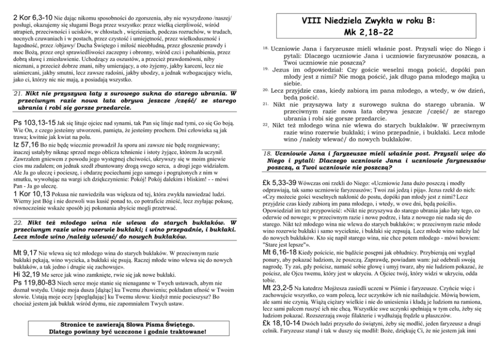 2 Kor 6,3-10 Nie dając nikomu sposobności do zgorszenia, aby nie wyszydzono /naszej/ posługi, okazujemy się sługami Boga przez wszystko: przez wielką cierpliwość, wśród utrapień, przeciwności i ucisków, w chłostach , więzieniach, podczas rozruchów, w trudach, nocnych czuwaniach i w postach, przez czystość i umiejętność, przez wielkoduszność i łagodność, przez /objawy/ Ducha Świętego i miłość nieobłudną, przez głoszenie prawdy i moc BoŜą, przez oręŜ sprawiedliwości zaczepny i obronny, wśród czci i pohańbienia, przez dobrą sławę i zniesławienie. Uchodzący za oszustów, a przecieŜ prawdomówni, niby nieznani, a przecieŜ dobrze znani, niby umierający, a oto Ŝyjemy, jakby karceni, lecz nie uśmiercani, jakby smutni, lecz zawsze radośni, jakby ubodzy, a jednak wzbogacający wielu, jako ci, którzy nic nie mają, a posiadają wszystko. 21. Nikt nie przyszywa łaty z surowego sukna do starego ubrania. W przeciwnym razie nowa łata obrywa jeszcze /część/ ze starego ubrania i robi się gorsze przedarcie. Ps 103,13-15 Jak się lituje ojciec nad synami, tak Pan się lituje nad tymi, co się Go boją. Wie On, z czego jesteśmy utworzeni, pamięta, Ŝe jesteśmy prochem. Dni człowieka są jak trawa; kwitnie jak kwiat na polu. Iz 57,16 Bo nie będę wiecznie prowadził Ja sporu ani zawsze nie będę rozgniewany; inaczej ustałyby niknąc sprzed mego oblicza tchnienie i istoty Ŝyjące, którem Ja uczynił. Zawrzałem gniewem z powodu jego występnej chciwości, ukrywszy się w moim gniewie cios mu zadałem; on jednak szedł zbuntowany drogą swego serca, a drogi jego widziałem. Ale Ja go uleczę i pocieszę, i obdarzę pociechami jego samego i pogrąŜonych z nim w smutku, wywołując na wargi ich dziękczynienie: Pokój! Pokój dalekim i bliskim! - - mówi Pan - Ja go uleczę. 1 Kor 10,13 Pokusa nie nawiedziła was większa od tej, która zwykła nawiedzać ludzi. Wierny jest Bóg i nie dozwoli was kusić ponad to, co potraficie znieść, lecz zsyłając pokusę, równocześnie wskaŜe sposób jej pokonania abyście mogli przetrwać. 22. Nikt teŜ młodego wina nie wlewa do starych bukłaków. W przeciwnym razie wino rozerwie bukłaki; i wino przepadnie, i bukłaki. Lecz młode wino /naleŜy wlewać/ do nowych bukłaków. Mt 9,17 Nie wlewa się teŜ młodego wina do starych bukłaków. W przeciwnym razie bukłaki pękają, wino wycieka, a bukłaki się psują. Raczej młode wino wlewa się do nowych bukłaków, a tak jedno i drugie się zachowuje». Hi 32,19 Me serce jak wino zamknięte, rwie się jak nowe bukłaki. Ps 119,80-83 Niech serce moje stanie się nienaganne w Twych ustawach, abym nie doznał wstydu. Ustaje moja dusza [dąŜąc] ku Twemu zbawieniu; pokładam ufność w Twoim słowie. Ustają moje oczy [spoglądając] ku Twemu słowu: kiedyŜ mnie pocieszysz? Bo chociaŜ jestem jak bukłak wśród dymu, nie zapomniałem Twych ustaw. Stronice te zawierają Słowa Pisma Świętego. Dlatego powinny być uczczone i godnie traktowane! VIII Niedziela Zwykła w roku B: Mk 2,18-22 18. Uczniowie Jana i faryzeusze mieli właśnie post. Przyszli więc do Niego i pytali: Dlaczego uczniowie Jana i uczniowie faryzeuszów poszczą, a Twoi uczniowie nie poszczą? 19. Jezus im odpowiedział: Czy goście weselni mogą pościć, dopóki pan młody jest z nimi? Nie mogą pościć, jak długo pana młodego majką u siebie. 20. Lecz przyjdzie czas, kiedy zabiorą im pana młodego, a wtedy, w ów dzień, będą pościć. 21. Nikt nie przyszywa łaty z surowego sukna do starego ubrania. W przeciwnym razie nowa łata obrywa jeszcze /część/ ze starego ubrania i robi się gorsze przedarcie. 22. Nikt teŜ młodego wina nie wlewa do starych bukłaków. W przeciwnym razie wino rozerwie bukłaki; i wino przepadnie, i bukłaki. Lecz młode wino /naleŜy wlewać/ do nowych bukłaków. 18. Uczniowie Jana i faryzeusze mieli właśnie post. Przyszli więc do Niego i pytali: Dlaczego uczniowie Jana i uczniowie faryzeuszów poszczą, a Twoi uczniowie nie poszczą? £k 5,33-39 Wówczas oni rzekli do Niego: «Uczniowie Jana duŜo poszczą i modły odprawiają, tak samo uczniowie faryzeuszów; Twoi zaś jedzą i piją». Jezus rzekł do nich: «Czy moŜecie gości weselnych nakłonić do postu, dopóki pan młody jest z nimi? Lecz przyjdzie czas kiedy zabiorą im pana młodego, i wtedy, w owe dni, będą pościli». Opowiedział im teŜ przypowieść: «Nikt nie przyszywa do starego ubrania jako łaty tego, co oderwie od nowego; w przeciwnym razie i nowe podrze, i łata z nowego nie nada się do starego. Nikt teŜ młodego wina nie wlewa do starych bukłaków; w przeciwnym razie młode wino rozerwie bukłaki i samo wycieknie, i bukłaki się zepsują. Lecz młode wino naleŜy lać do nowych bukłaków. Kto się napił starego wina, nie chce potem młodego - mówi bowiem: "Stare jest lepsze"». Mt 6,16-18 Kiedy pościcie, nie bądźcie posępni jak obłudnicy. Przybierają oni wygląd ponury, aby pokazać ludziom, Ŝe poszczą. Zaprawdę, powiadam wam: juŜ odebrali swoją nagrodę. Ty zaś, gdy pościsz, namaść sobie głowę i umyj twarz, aby nie ludziom pokazać, Ŝe pościsz, ale Ojcu twemu, który jest w ukryciu. A Ojciec twój, który widzi w ukryciu, odda tobie. Mt 23,2-5 Na katedrze MojŜesza zasiedli uczeni w Piśmie i faryzeusze. Czyńcie więc i zachowujcie wszystko, co wam polecą, lecz uczynków ich nie naśladujcie. Mówią bowiem, ale sami nie czynią. WiąŜą cięŜary wielkie i nie do uniesienia i kładą je ludziom na ramiona, lecz sami palcem ruszyć ich nie chcą. Wszystkie swe uczynki spełniają w tym celu, Ŝeby się ludziom pokazać. Rozszerzają swoje filakterie i wydłuŜają frędzle u płaszczów. £k 18,10-14 Dwóch ludzi przyszło do świątyni, Ŝeby się modlić, jeden faryzeusz a drugi celnik. Faryzeusz stanął i tak w duszy się modlił: BoŜe, dziękuję Ci, Ŝe nie jestem jak inni ludzie, zdziercy, oszuści, cudzołoŜnicy, albo jak i t