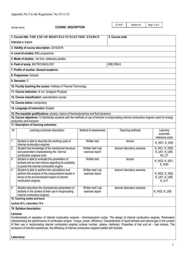 Appendix No 5 to the Regulation. No 33/11/12 Z1-PU7 COURSE DESCRIPTION (faculty stamp) 1. Course title: THE USE OF BIOFUELS IN ELECTRIC ENERGY Edition N1 Page 1 of 2 2. Course code PRODUCTION 3. Validity of course description: 2015/2016 4. Level of studies: MSc programme 5. Mode of studies: full time stationary studies 6. Field of study: BIOTECHNOLOGY (RIE) RIE-6 7. Profile of studies: General academic 8. Programme: biofuels 9. Semester: 2 10. Faculty teaching the course: Institute of Thermal Technology 11. Course instructor: dr inż. Grzegorz Przybyla 12. Course classification: specialization course 13. Course status: compulsory 14. Language of instruction: English 15. Pre-requisite qualifications: physics, basics of thermodynamics and fluid dynamics 16. Course objectives: To familiarize students with the methods of use of biofuels in reciprocating internal combustion engines used for energy production and transport 17. Description of learning outcomes: Nr 1 2 3 4 5 Learning outcomes description Method of assessment Teaching methods Student is able to describe the working cycle of Internal combustion engines Student has knowledge of the mechanical structure and parameters characterizing the internal combustion engines work Student is able to evaluate the parameters of biofuels and air-fuel mixture regarding its suitability to power the internal combustion engine Student is able to perform the calculations and perform the analysis of the measurement results in terms of the environmental impact of internal combustion engines Written test lecture Written test/ Lab exercise report lecture/ laboratory exercise Written test lecture Written test/ Lab exercise report lecture/ laboratory exercise Written test/ Lab exercise report lecture/ laboratory exercise Student describes the characteristic parameters of biofuels in the context of their use in reciprocating internal combustion engines Learning outcomes reference code K_W01, K_W20 K_W21, K_W20, K_U01, K_U08, KU_27 K_W22, K_W21, K_W20 K_W22, K_W20, K_U01, K_U08, K_U11 K_W22, K_U08 18. Teaching modes and hours Lecture 30 h, Laboratory 15 h 19. Syllabus description: Lectures Fundamentals of operation of internal combustion engines - thermodynamic cycles. The design of internal combustion engines. Parameters characterizing the performance of combustion engine - torque, power, efficiency. Characteristics of liquid biofuels and natural gas in the context of their use in reciprocating internal combustion engines (octane number, cetane, methane). Properties of fuel and air - fuel mixture. The emissions of harmful substances, the efficiency of internal combustion engines fuelled with biofuels Laboratory: 1 Lab tests with using a chassis dynamometer and test rig with hydraulic/electromagnetic braking system. Determination of the composition of the exhaust gas and the effective parameters of the internal combustion engine fuelled with conventional fuel and biofuel. Determination of emission during combustion of selected fuels and biofuels in reciprocating internal combustion engines. Influence of the ignition timing on the engine operating parameters using biofuel and conventional fuel. 20. Examination: No 21. Primary sources: Lecture notes 1. Szargut Jan, Termodynamika techniczna, Wydawnictwo Politechniki Śląskiej, Gliwice 2000. 3. Juliszewski Tadeusz, Biopaliwo rzepakowe, Wyd. PWRiL, 2007. 4. Postrzenik Stefan, Żmudka Zbigniew, Termodynamiczne oraz ekologiczne uwarunkowania eksploatacji tłokowych silników spalinowych”, Wyd. Pol. Śl., Gliwice 2007. 5. Surygała Jan, „Wodór jako paliwo” WNT, Warszawa 2008. 22. Secondary sources: 1. Barczewski K., Kałdoński T., Paliwa do silników o zapłonie samoczynnym, WKŁ sp. z o. o. Warszawa 2004. 2. Ścieżko Marek, Zuwała Jarosław, Pronobis Marek, Współspalanie biomasy i paliw alternatywnych w energetyce, Instytut Chemicznej Przeróbki Węgla Zabrze 2007. 23. Total workload required to achieve learning outcomes Lp. Teaching mode : 1 Lecture 30/15 2 Classes 0/0 3 Laboratory 4 Project 0/0 5 BA/ MA Seminar 0/0 6 Other 0/0 Total number of hours Contact hours / Student workload hours 15/30 45/45 24. Total hours: 90 25. Number of ECTS credits: 3 26. Number of ECTS credits allocated for contact hours: 1.5 27. Number of ECTS credits allocated for in-practice hours (laboratory classes, projects): 1.5 26. Comments: Approved: ……………………………. (date, Instructor’s signature) ………………………………………………… (date , the Director of the Faculty Unit signature) 2