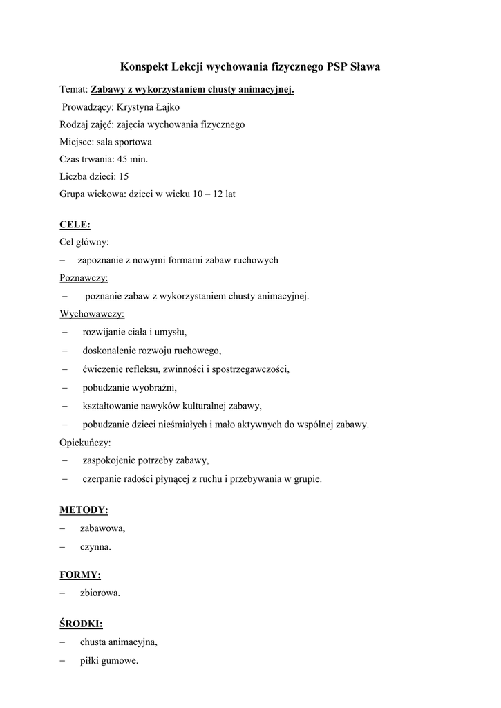 Konspekt Lekcji wychowania fizycznego PSP Sława Temat: Zabawy z wykorzystaniem chusty animacyjnej. Prowadzący: Krystyna Łajko Rodzaj zajęć: zajęcia wychowania fizycznego Miejsce: sala sportowa Czas trwania: 45 min. Liczba dzieci: 15 Grupa wiekowa: dzieci w wieku 10 – 12 lat CELE: Cel główny: zapoznanie z nowymi formami zabaw ruchowych Poznawczy: poznanie zabaw z wykorzystaniem chusty animacyjnej. Wychowawczy: rozwijanie ciała i umysłu, doskonalenie rozwoju ruchowego, ćwiczenie refleksu, zwinności i spostrzegawczości, pobudzanie wyobraźni, kształtowanie nawyków kulturalnej zabawy, pobudzanie dzieci nieśmiałych i mało aktywnych do wspólnej zabawy. Opiekuńczy: zaspokojenie potrzeby zabawy, czerpanie radości płynącej z ruchu i przebywania w grupie. METODY: zabawowa, czynna. FORMY: zbiorowa. ŚRODKI: chusta animacyjna, piłki gumowe. CZĘŚĆ I WSTĘPNA 1. Czynności organizacyjno-porządkowe Przywitanie dzieci i podanie tematu zajęć Sprawdzenie gotowości do zajęć Ułożenie na podłodze chusty i omówienie zasad uczestnictwa w zajęciach 2. Ćwiczenia zapoznające z chustą animacyjną : unoszenie i opuszczanie chusty fale na morzu szklana tafla 3. Zabawy integrujące grupę: „Paczka” - trzymając chustę za uchwyty, grupa wchodzi na nią i „pakuje” siebie, łącząc jej brzegi. ,,Przebieganie pod chustą”- uczestnicy podnoszą i opuszczają chustę trzymając ją za uchwyty. Każde dziecko trzyma inny kolor, prowadzący mówi, które kolory mają zmienić swoje miejsce, gdy chusta jest maksymalnie w górze osoby te przebiegają pod nią. ,,Kogo brakuje?”- uczestnicy siedzą w kręgu dookoła chusty z zamkniętymi oczami. Prowadzący wybiera osobę (może być ich więcej), która wchodzi pod chustę. Następnie wszyscy otwierają oczy i odgadują, kto jest pod chustą. CZĘŚĆ II ZASADNICZA 1. Zabawy ćwiczące współdziałanie: ,,Bilard”- grupa wachluje chustą na której jest piłeczka. Ma ona wpaść do otworu znajdującego się na środku chusty. ,,Sztorm”- na chustę wrzucamy więcej piłeczek. Podczas wachlowania nie mogą one wypaść z chusty. ,,Na karuzeli”- chętna osoba siada na środku chusty, a reszta kręci nią, idąc coraz szybciej w jedną stronę. Osoba na środku stara się wstać i utrzymać równowagę. „Rybak i rybka” - uczestnicy stoją w kręgu trzymając brzeg chusty. Wybieramy dwie osoby, które przyjmują rolę „rybaka i „rybki”. Rybak wchodzi na chustę (bez butów) i stara się złapać pływającą w wodzie rybkę. Bawiący się falują chustą, utrudniając w ten sposób zadanie rybakowi. Gdy ten złapie rybkę, następuje zmiana par. „Bieganie pod chustą” uczestnicy zabawy trzymają chustę za uchwyty. Na hasło nauczyciela podnoszą ją jednocześnie w górę. W tym czasie przebiegają pod nią osoby, których dotyczy polecenie osoby prowadzącej, zamieniając się przy tym miejscami. 2. Zabawy z piłką: ”Bilard”- grupa wachluje chusta, na której jest piłeczka tenisowa. Ma ona wpaść do otworu znajdującego się na środku chusty. 3. Zabawa wybrana przez dzieci , np. „Rekin” - uczestnicy siedzą w kręgu trzymając chustę na wysokości barków. Są oni turystami kąpiącymi się w morzu. Pod chustą jest jedna osoba- rekin, który poluje na turystów, wciągając ich za nogi pod chustę. Kiedy rekin wciąga ofiarę do wody, ta krzyczy „rekin”. Na pomoc przybiega ratownik stojący za turystami na brzegu morza i stara się uratować turystów ciągnąc ich za ręce. Osoba wciągnięta do morza staje się rekinem. CZEŚĆ III KOŃCOWA 1. Ćwiczenia uspakajające i relaksacyjne „Kolorowa gwiazda” - wszystkie dzieci leżą na chuście, nogi mają skierowane do środka chusty. Jednocześnie wykonują polecenia: turlamy się w prawo dwa razy, turlamy się w lewo trzymamy się za ręce i ponosimy je do góry, kładziemy ręce za głowę i znowu podnosimy do góry, podnosimy prawą nogę do góry, lewą, opuszczamy podnosimy obie nogi do góry siadamy powoli wstajemy 2. Pożegnanie – zabawa „Zamiana miejsc”- zamieniają się miejscami te osoby, którym zajęcia sprawiły radość. 3. Omówienie zajęć, ocena aktywności dzieci - Która zabawa sprawiła ci najwięcej radości? - Czy była zabawa, która Ci się nie podobała? 4. Podziękowanie za udział w zajęciach, pożegnanie uczestników zabaw.