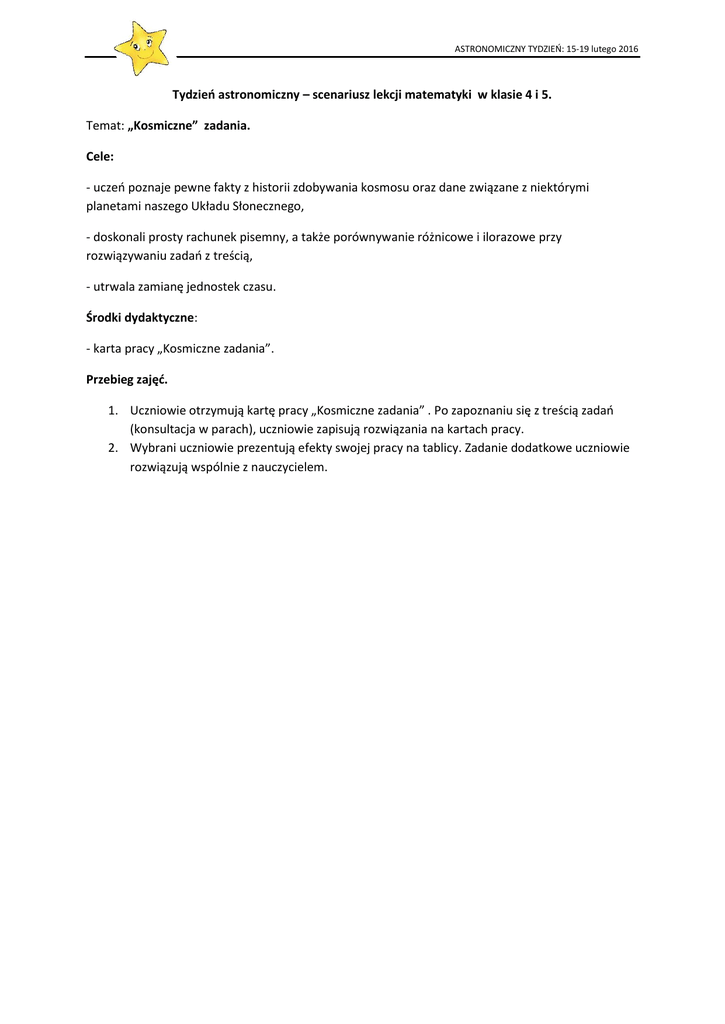 ASTRONOMICZNY TYDZIEŃ: 15-19 lutego 2016 Tydzień astronomiczny – scenariusz lekcji matematyki w klasie 4 i 5. Temat: „Kosmiczne” zadania. Cele: - uczeń poznaje pewne fakty z historii zdobywania kosmosu oraz dane związane z niektórymi planetami naszego Układu Słonecznego, - doskonali prosty rachunek pisemny, a także porównywanie różnicowe i ilorazowe przy rozwiązywaniu zadań z treścią, - utrwala zamianę jednostek czasu. Środki dydaktyczne: - karta pracy „Kosmiczne zadania”. Przebieg zajęć. 1. Uczniowie otrzymują kartę pracy „Kosmiczne zadania” . Po zapoznaniu się z treścią zadań (konsultacja w parach), uczniowie zapisują rozwiązania na kartach pracy. 2. Wybrani uczniowie prezentują efekty swojej pracy na tablicy. Zadanie dodatkowe uczniowie rozwiązują wspólnie z nauczycielem. ASTRONOMICZNY TYDZIEŃ: 15-19 lutego 2016 „Kosmiczne” zadania. 1. Księżyc, naturalny satelita Ziemi, ma promień 1737 km. Ziemia ma promień 6371 km. Oblicz, o ile promień Ziemi jest dłuższy od promienia Księżyca ? 2. Doba na Marsie jest o 40 minut dłuższa niż doba na Ziemi, natomiast rok jest dwa razy dłuższy. O ile dłuższy jest tydzień na Marsie od tygodnia na Ziemi ? Ile dni trwa rok na Marsie? 3. Tajemniczy i nieznany świat gwiazd i planet od dawna interesował człowieka. Pełniejsze poznanie tego fascynującego świata umożliwiły wyprawy w kosmos. 12 kwietnia 1961 roku Rosjanin Jurij Gagarin pierwszy raz w historii ludzkości odbył lot dookoła kuli ziemskiej. W 1969 roku na Księżycu wylądowali Amerykanie Neil Armstrong i Edwin Aldrin. W roku 1978 w kosmosie był także pierwszy Polak - Mirosław Hermaszewski. Ile lat upłynęło od pierwszego lotu człowieka w kosmos do lotu pierwszego Polaka? 4. 20 lipca 1969 roku człowiek po raz pierwszy stanął na Księżycu i przebywał na nim około 20 godzin i 39 minut. Ile minut spędzili kosmonauci na powierzchni Księżyca ? 5. Na Księżycu ciężar ciała jest 6 razy mniejszy niż na powierzchni Ziemi. Oblicz wagę Ani, jej mamy i taty na Księżycu , jeżeli na Ziemi ważą: Ania 36 kg Mama 66 kg Tata 96 kg Ile waży na Ziemi samochód, jeżeli jego waga na Księżycu wynosi 165 kg? 6. Rekord przebywania człowieka w kosmosie wynosi 365 dni i 22 godziny. Ile to godzin? 7.* Temperatura na Księżycu waha się od 130°C podczas dnia, aż do -150°C podczas księżycowej nocy. Oblicz różnicę między najwyższą a najniższą temperaturą na Księżycu. ASTRONOMICZNY TYDZIEŃ: 15-19 lutego 2016 Tydzień astronomiczny – scenariusz lekcji matematyki w klasie 6. Temat: Podróż przez Układ Słoneczny. Cele: - uczeń poznaje planety Układu Słonecznego oraz ich cechy, - uczeń potrafi uporządkować planety w zależności od wagi i odległości od Słońca, - uczeń potrafi wykazać się podstawowymi umiejętnościami rachunkowymi przy rozwiązywaniu zadań z treścią. Środki dydaktyczne: - karty z nazwami planet i ich odległościami od Słońca, karta pracy „Planety Układu Słonecznego”. Przebieg zajęć. 1. Uczniowie losowo otrzymują karty z nazwami planet. Jeden z uczniów dostaje kartę ze Słońcem. Ich zadanie polega na ustawieniu się w poprawnej kolejności od Słońca (odległości znajdują się na kartach). Po ustaleniu właściwej kolejności, jeden z uczniów zapisuje uporządkowany ciąg planet na tablicy. 2. Uczniowie otrzymują kartę pracy „Planety Układu Słonecznego”. Po zapoznaniu się z jej treścią, rozwiązują zadania (zadanie dodatkowe mogą konsultować w parach). 3. Wybrani uczniowie prezentują efekty swojej pracy na forum klasy. Planety Układu Słonecznego. Merkury jest planetą, która leży najbliżej Słońca. Jego masa wynosi 3,334 ∙ 1023 kg. Powierzchnię planety pokrywają kratery i strome skarpy skalne. Merkury odznacza się dużymi wahaniami temperatur od -180 do +430°C. Wenus, druga planeta od Słońca, to skalny glob o masie 4,87 ∙ 1024 kg, otulony gęstymi chmurami, które odbijają większość światła słonecznego. Dlatego Wenus jest najjaśniejszym ciałem na niebie po Słońcu i Księżycu. Jest na niej duszno i gorąco, nawet do +480°C. Ziemia jest trzecią planetą od Słońca. Jej masa wynosi 5,975 ∙ 1024 kg. Spośród czterech planet skalistych (Merkury, Wenus, Ziemia, Mars) tylko na Ziemi występuje woda w stanie płynnym, bogata w tlen atmosfera oraz inne warunki sprzyjające życiu. Posiada również naturalnego satelitę – Księżyc. Mars, czwarta planeta od Słońca, pod wieloma względami przypomina Ziemię. Podobnie zmieniają się tu pory roku, chociaż rok jest dwa razy dłuższy. Mars jest jednak suchy i zimny, a jego atmosfera trująca dla człowieka. Masa tej planety wynosi 6,417 ∙ 1023 kg. Jowisz, piąta planeta od Słońca, jest jedną z czterech gazowych planet – olbrzymów. Jego masa wynosi 1,899 ∙ 1027 i przewyższa 2,5 razy łączną masę pozostałych planet. ASTRONOMICZNY TYDZIEŃ: 15-19 lutego 2016 Saturn, szósta planeta od Słońca, posiada co najmniej 20 księżyców i imponujący układ pierścieni. Masa jego nie przekracza 1/3 masy Jowisza, mimo iż średnice obu planet niewiele się różnią i wynosi 5,685 ∙ 1026 kg. Uran, siódma planeta od Słońca, ma masę 8,688 ∙ 1025 kg. Ze względu na usytuowanie w zewnętrznych rejonach Układu Słonecznego, temperatura górnej powierzchni chmur wynosi tylko -210°C. Neptun jest ósmą planetą od Słońca, a czwartą z gazowych planet olbrzymów. Wielkością i budową przypomina swojego sąsiada - Uran. Jego masa wynosi 1,03 ∙ 1026 kg. Na Neptunie wieją najszybsze wiatry Układu Słonecznego do 2200km/h. Zad.1. „Uporządkuj” planety pod względem ich mas, w kolejności rosnącej. Zad.2. Oblicz różnicę między najniższą a najwyższą temperaturą na Merkurym. Zad.3. Ile dni trwa rok na Marsie? Zad.4.* Ile razy prędkość wiatru na Neptunie jest większa od prędkości halnego – wiatru wiejącego w polskich górach, który w p