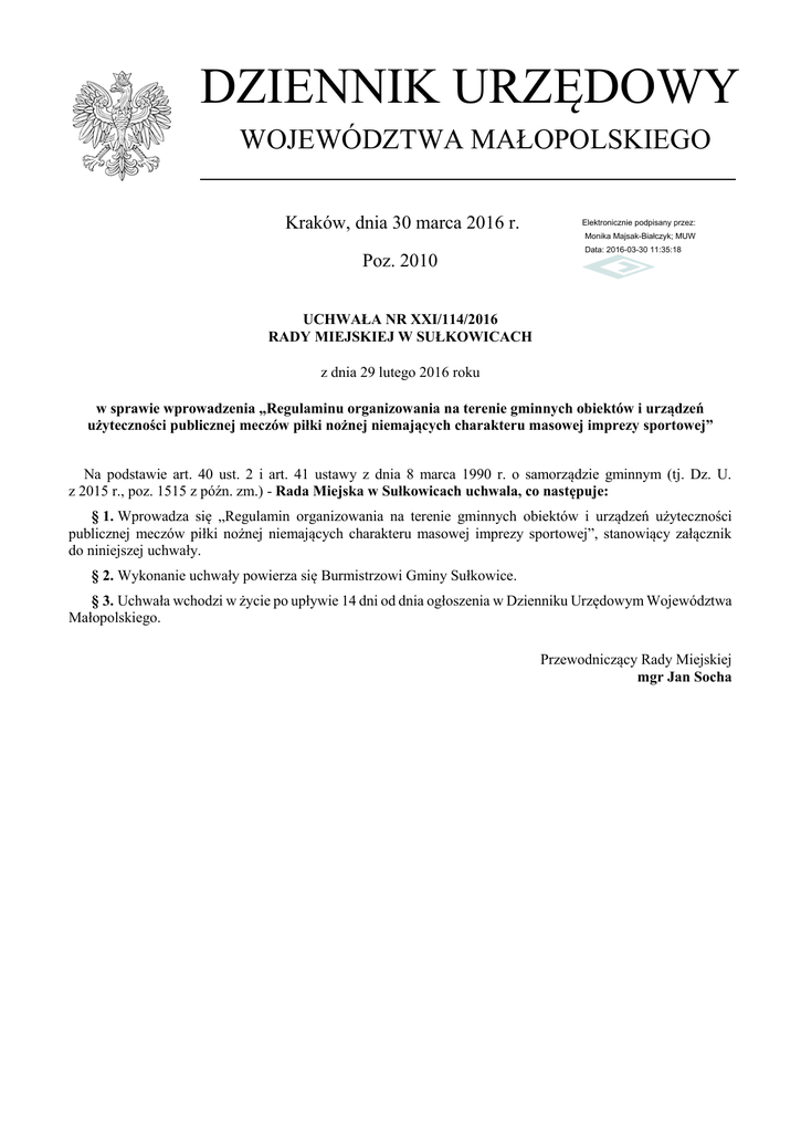 DZIENNIK URZĘDOWY WOJEWÓDZTWA MAŁOPOLSKIEGO Kraków, dnia 30 marca 2016 r. Elektronicznie podpisany przez: Monika Majsak-Białczyk; MUW Poz. 2010 Data: 2016-03-30 11:35:18 UCHWAŁA NR XXI/114/2016 RADY MIEJSKIEJ W SUŁKOWICACH z dnia 29 lutego 2016 roku w sprawie wprowadzenia „Regulaminu organizowania na terenie gminnych obiektów i urządzeń użyteczności publicznej meczów piłki nożnej niemających charakteru masowej imprezy sportowej” Na podstawie art. 40 ust. 2 i art. 41 ustawy z dnia 8 marca 1990 r. o samorządzie gminnym (tj. Dz. U. z 2015 r., poz. 1515 z późn. zm.) - Rada Miejska w Sułkowicach uchwala, co następuje: § 1. Wprowadza się „Regulamin organizowania na terenie gminnych obiektów i urządzeń użyteczności publicznej meczów piłki nożnej niemających charakteru masowej imprezy sportowej”, stanowiący załącznik do niniejszej uchwały. § 2. Wykonanie uchwały powierza się Burmistrzowi Gminy Sułkowice. § 3. Uchwała wchodzi w życie po upływie 14 dni od dnia ogłoszenia w Dzienniku Urzędowym Województwa Małopolskiego. Przewodniczący Rady Miejskiej mgr Jan Socha Dziennik Urzędowy Województwa Małopolskiego –2– Poz. 2010 Załącznik do Uchwały Nr XXI/114/2016 Rady Miejskiej w Sułkowicach z dnia 29 lutego 2016 r. Regulamin organizowania na terenie gminnych obiektów i urządzeń użyteczności publicznej meczów piłki nożnej niemających charakteru masowej imprezy sportowej Przepisy ogólne § 1. Ilekroć w Regulaminie jest mowa o: 1) meczu – należy przez to rozumieć mecz piłki nożnej IV ligi i lig niższych niemający charakteru masowej imprezy sportowej; 2) organizatorze – należy przez to rozumieć prezesa klubu sportowego, na terenie którego rozgrywany jest mecz lub osobę wyznaczoną z zarządu klubu; 3) obiekcie – należy przez to rozumieć stadion lub boisko sportowe wraz z infrastrukturą, na którym rozgrywany jest mecz; 4) koordynatorze ds. bezpieczeństwa – należy przez to rozumieć osobę odpowiedzialną za problematykę ochrony i bezpieczeństwa; 5) służbach – należy przez to rozumieć osoby wyznaczone przez organizatora podległe koordynatorowi ds. bezpieczeństwa, odpowiedzialne za ład i porządek publiczny, posiadające charakterystyczne oznakowanie pozwalające na ich identyfikację (np. kamizelki z napisem); 6) uczestnikach – należy przez to rozumieć kibiców i inne osoby przebywające na obiekcie z wyjątkiem piłkarzy, koordynatora ds. bezpieczeństwa oraz podległych mu służb. § 2. 1. Każdy mecz organizowany na terenie gminnych obiektów i urządzeń użyteczności publicznych powinien posiadać wskazanego organizatora. 2. Informacja ze wskazanym terminem i miejscem rozgrywek, przewidywaną liczbą kibiców, danymi organizatora i koordynatora ds. bezpieczeństwa oraz liczbą pracowników służb, powinna być przesłana do Komendy Powiatowej Policji w Myślenicach. Obowiązki organizatora imprezy, członków służb oraz uczestników imprezy § 3. Organizator ma obowiązek: 1) zapewnić techniczne przygotowanie obiektu w taki sposób, aby nie występowały zagrożenia dla uczestników meczu; 2) utrzymać porządek i spokój w obrębie obiektu przed rozpoczęciem meczu, w trakcie jego trwania i po zakończeniu; 3) opracować „Regulamin obiektu” oraz umieścić go w sposób umożliwiający zapoznanie się uczestników z przedmiotowym regulaminem; 4) wyznaczyć koordynatora ds. bezpieczeństwa; 5) zapewnić odpowiednią liczbę pracowników służb; 6) w przypadku zbiorowego zakłócenia ładu i porządku publicznego na obiekcie, gdy służby nie będą w stanie zaprowadzić porządku, zwrócić się o interwencję do Policji. § 4. Pracownicy służb mają obowiązek: 1) czuwać nad spokojem i porządkiem publicznym na obiekcie; 2) upominać uczestników naruszających ład i spokój na obiekcie, a w razie konieczności wyprowadzać ich z obiektu i przekazywać Policji lub Straży Miejskiej; Dziennik Urzędowy Województwa Małopolskiego –3– Poz. 2010 3) posiadać charakterystyczne oznakowanie pozwalające na ich identyfikację (np. kamizelki z napisem); 4) wykonywać polecenia koordynatora ds. bezpieczeństwa. § 5. Uczestnicy mają obowiązek: 1) zapoznać się z wprowadzonym Regulaminem i przestrzegać jego postanowień; 2) wykonywać polecenia pracowników służb. Uprawnienia uczestnika imprezy § 6. 1. Uczestnik imprezy ma prawo: 1) przebywać na terenie obiektu w czasie trwania meczu, tj. od chwili udostępnienia obiektu przez organizatora do czasu zakończenia meczu; 2) w nieskrępowany sposób uczestniczyć w meczu, wyrażając swoje emocje, co jest ograniczone jedynie koniecznością przestrzegania przepisów prawnych ogólnie obowiązujących, zasad współżycia społecznego oraz określonych niniejszym Regulaminem; 3) korzystać z urządzeń, w tym z zaplecza higieniczno - sanitarnego, jeżeli takie są udostępnione dla uczestników imprezy, w sposób zgodny z ich przeznaczeniem. 2. Uczestnik imprezy jest uprawniony do: 1) składania skarg; 2) żądania od organizatora zwrotu kosztów, które uczestnik imprezy poniósł za niewykorzystane bilety uprawniające do wstępu na obiekt z winy bądź przyczyn zależnych od organizatora. Zakazy, które uczestnik imprezy winien respektować § 7. 1. Zabrania się w szczególności: 1) wszystkim osobom przebywającym na obiekcie podejmowania działań, które mogą zagrozić porządkowi, spokojowi i bezpieczeństwu publicznemu; 2) wnoszenia i posiadania na obiekcie: a) przedmiotów niebezpiecznych, w szczególności broni, o której mowa w art. 4 Ustawy z dnia 21 maja 1999 roku o broni i amunicji; b) materiałów wybuchowych i pirotechnicznych, między innymi fajerwerków, rac, świec dymnych, petard hukowych itp.; c) napojów alkoholowych, środków odurzających i substancji psychotropowych, a także innych podobnie działających środków; d) butelek, puszek, jak również innych przedmiotów ze szkła lub innego twardego