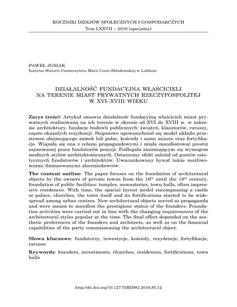 ROCZNIKI DZIEJÓW SPOŁECZNYCH I GOSPODARCZYCH Tom LXXVII – 2016 (specjalny) PAWEŁ JUSIAK Instytut Historii Uniwersytetu Marii Curie-Skłodowskiej w Lublinie DZIAŁALNOŚĆ FUNDACYJNA WŁAŚCICIELI NA TERENIE MIAST PRYWATNYCH RZECZYPOSPOLITEJ W XVI–XVIII WIEKU Zarys treści: Artykuł omawia działalność fundacyjną właścicieli miast prywatnych realizowaną na ich terenie w okresie od XVI do XVIII w. w zakresie architektury, fundacje budowli publicznych: świątyń, klasztorów, ratuszy, często okazałych rezydencji. Stopniowo upowszechniał się model układu przestrzeni obejmującego zamek lub pałac, kościoły i samo miasto oraz fortyfikacje. Wiązała się ona z celami propagandowymi i miała manifestować prestiż zajmowanej przez fundatorów pozycji. Podlegała zmieniającym się wymogom modnych stylów architektonicznych. Ostateczny efekt zależał od gustów estetycznych fundatorów i architektów. Uwarunkowany bywał także możliwościami finansowanymi zleceniodawców. The content outline: The paper focuses on the foundation of architectural objects by the owners of private towns from the 16th until the 18th century, foundation of public facilities: temples, monasteries, town halls, often impressive residences. With time, the spacial layout model encompassing a castle or palace, churches, the town itself and its fortifications started to be widespread among urban centres. New architectural objects served as propaganda and were meant to manifest the prestigious status of the founders. Foundation activities were carried out in line with the changing requirements of the architectural styles popular at the time. The final effect depended on the aesthetic preferences of the founders and architects, as well as on the financial capabilities of the party commissioning the architectural object. Słowa kluczowe: fundatorzy, inwestycje, kościoły, rezydencje, fortyfikacje, ratusze Keywords: founders, investments, churches, residences, fortifications, town halls http://dx.doi.org/10.12775/RDSG.2016.SI.12 272 Paweł Jusiak Istniejący stan badań pozwala stwierdzić, że główne miasta królewskie zostały zorganizowane do końca XV w. Od stulecia XVI natężenie ruchu lokacyjnego obserwujemy zaś w dobrach prywatnych, w których inicjatorami lokacji byli ich właściciele1. Różne było jednak zaangażowanie inicjatorów lokacji w proces lokacyjny. Wśród fundatorów miast w XVI w. Ryszard Szczygieł wyróżnił trzy grupy w zależności od zaangażowania w prowadzoną inwestycję miejską. „Pierwszą stanowili tacy, którzy postarali się o przywilej lokacyjny i później nie ingerowali w budowę oraz organizację powstającego miasta. […] Grupę drugą tworzyli fundatorzy, którzy poza ogłoszeniem dokumentów związanych z lokacją prawną żywo interesowali się procesem lokacyjnym, często nadzorowali prowadzone prace, a także w razie potrzeby wprowadzali korekty. Trzecią stanowili tacy, którzy spełniając wymogi omówione wcześniej, angażowali własne kapitały w budowę miasta, dzięki zaś swojej pozycji w regionie i Rzeczypospolitej starali się o korzystne przywileje handlowe i uprawnienia innego typu dla nowego ośrodka”2. W stuleciach XVII i XVIII zjawisko to uległo nasileniu. Jak pisał Wacław Ostrowski w przedmowie do monografii Wojciecha Trzebińskiego o działalności urbanizacyjnej magnatów i szlachty: „w zestawieniu z tym, co na terenie swoich miast przedsiębrali magnaci i zamożna szlachta blednie działalność urbanistyczna podejmowana w dużych miastach Rzeczypospolitej owego czasu”3. W okresie wczesnonowożytnym ważnym wyznacznikiem osiągniętej pozycji majątkowej i społecznej była działalność fundacyjna. Jak pisała Alicja Kurzątkowska: „Osiągnięte stanowisko i posiadany majątek musiał mieć swój zewnętrzny wyraz w ukształtowaniu siedziby i jej wyposażenia, oraz w odpowiedniej klasie fundacji sakralnych firmowanych herbami i inicjałami dysponenta”4. Podobnie ujmował tę funkcję Janusz Kurtyka, który wprost pisał, że działalność fundacyjna była traktowana jako potwierdzenie wysokiej rangi społecznej 1 A. Wyrobisz, Rola miast prywatnych w Polsce w XVI i XVII wieku, PH, t. 65, 1974, z. 1, s. 19–23. W wydanej cztery lata później kolejnej pracy A. Wyrobisz napisał, że z końcem XV w. „inicjatywa królewska w tej dziedzinie [lokacji miast – P.J.] wygasła niemal zupełnie”; tenże, Miasta prywatne w Polsce XVI–XVIII w. jako inwestycje kulturalne, KHKM, t. 26, 1978, nr 1, s. 47–48. 2 R. Szczygieł, Działalność urbanizacyjna Mikołaja Reja, w: Literatura i pamięć kultury. Studia ofiarowane Profesorowi Stefanowi Nieznanowskiemu w pięćdziesięciolecie pracy naukowej, red. S. Baczewski, D. Chemperek, Lublin 2004, s. 40. 3 W. Trzebiński, Działalność urbanistyczna magnatów i szlachty w Polsce XVIII wieku, Warszawa 1962, s. 5. 4 A. Kurzątkowska, Mecenat artystyczny Firlejów (1526–1626), Warszawa 1963, mps w Bibliotece Uniwersyteckiej w Warszawie, s. 174. Działalność fundacyjna właścicieli na terenie miast prywatnych 273 możnowładcy i koncentrowała się nie tylko w ośrodkach centralnych jego dóbr, ale i w miejscach regularnej aktywności publicznej (np. stolica – Kraków, miasta sejmowe – Piotrków i Lublin czy późnej Warszawa). Wszelkie jej formy (budowa świątyń, zamków, rezydencji w mieście) miały poprzez odpowiedni wystrój i program ideowy podkreślić wspaniałość rodu fundatora i jego dokonań. Szczególnym obszarem ostentacji były zwłaszcza zamki i pałace, w których nawet kształt czy bryła przenosiły określone treści (np. Krzyżtopór, Krasiczyn). Były one nie tylko ośrodkami administracji dóbr, a także umożliwiały publiczne funkcjonowanie magnata na tle jego dworu i klienteli szlacheckiej, nader często też zjazdów okolicznej szlachty5. W niniejszym studium ta obszerna problematyka zostanie ograniczona do zagadnień związanych z archit