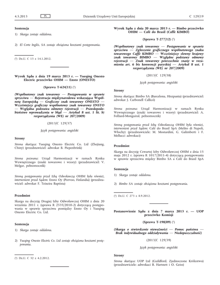 4.5.2013 PL Dziennik Urzędowy Unii Europejskiej C 129/19 Wyrok Sądu z dnia 20 marca 2013 r. — Bimbo przeciwko OHIM — Café do Brasil (Caffè KIMBO) Sentencja 1) Skarga zostaje oddalona. (Sprawa T-277/12) (1) 2) El Corte Inglés, SA zostaje obciążona kosztami postępowania. (1) Dz.U. C 13 z 14.1.2012. (Wspólnotowy znak towarowy — Postępowanie w sprawie sprzeciwu — Zgłoszenie graficznego wspólnotowego znaku towarowego Caffè KIMBO — Wcześniejszy słowny krajowy znak towarowy BIMBO — Względne podstawy odmowy rejestracji — Znak towarowy powszechnie znany w rozu mieniu art. 6 bis konwencji paryskiej — Artykuł 8 ust. 1 rozporządzenia (WE) nr 207/2009) (2013/C 129/38) Wyrok Sądu z dnia 19 marca 2013 r. — Yueqing Onesto Electric przeciwko OHIM — Ensto (ONESTO) (Sprawa T-624/11) (1) (Wspólnotowy znak towarowy — Postępowanie w sprawie sprzeciwu — Rejestracja międzynarodowa wskazująca Wspól notę Europejską — Graficzny znak towarowy ONESTO — Wcześniejszy graficzny wspólnotowy znak towarowy ENSTO — Względna podstawa odmowy rejestracji — Prawdopodo bieństwo wprowadzenia w błąd — Artykuł 8 ust. 1 lit. b) rozporządzenia (WE) nr 207/2009) (2013/C 129/37) Język postępowania: angielski Strony Strona skarżąca: Yueqing Onesto Electric Co. Ltd (Zhejiang, Chiny) (przedstawiciel: adwokat B. Piepenbrink) Strona pozwana: Urząd Harmonizacji w ramach Rynku Wewnętrznego (znaki towarowe i wzory) (przedstawiciel: V. Melgar, pełnomocnik) Język postępowania: angielski Strony Strona skarżąca: Bimbo SA (Barcelona, Hiszpania) (przedstawiciel: adwokat J. Carbonell Callicó) Strona pozwana: Urząd Harmonizacji w ramach Rynku Wewnętrznego (znaki towarowe i wzory) (przedstawiciel: A. Folliard-Monguiral, pełnomocnik) Stroną postępowania przed Izbą Odwoławczą OHIM była również, interwenient przed Sądem: Café do Brasil SpA (Melito di Napoli, Włochy) (przedstawiciele: M. Mostardini, G. Galimberti i F. Mellucci adwokaci) Przedmiot Skarga na decyzję Czwartej Izby Odwoławczej OHIM z dnia 15 maja 2012 r. (sprawa R 1017/2011-4) dotyczącą postępowania w sprawie sprzeciwu między Bimbo SA a Café do Brasil SpA Sentencja 1) Skarga zostaje oddalona. Stroną postępowania przed Izbą Odwoławczą OHIM była również, interwenient przed Sądem: Ensto Oy (Porvoo, Finlandia) (przedsta wiciel: adwokat F. Teixeira Baptista) 2) Bimbo SA zostaje obciążona kosztami postępowania. Przedmiot (1) Dz.U. C 273 z 8.9.2012. Skarga na decyzję Drugiej Izby Odwoławczej OHIM z dnia 20 września 2011 r. (sprawa R 2535/2010-2) dotyczącą postępo wania w sprawie sprzeciwu pomiędzy Ensto Oy i Yueqing Onesto Electric Co. Ltd. Postanowienie Sądu z dnia 7 marca 2013 r. — UOP przeciwko Komisji (Sprawa T-198/09) (1) Sentencja 1) Skarga zostaje oddalona. (Skarga o stwierdzenie nieważności — Pomoc państwa — Brak indywidualnego oddziaływania — Niedopuszczalność) (2013/C 129/39) 2) Yueqing Onesto Electric Co. Ltd zostaje obciążona kosztami postę powania. (1) Dz.U. C 32 z 4.2.2012. Język postępowania: angielski Strony Strona skarżąca: UOP Ltd (Guildford, Zjednoczone Królestwo) (przedstawiciele: adwokaci B. Hartnett i O. Geiss)