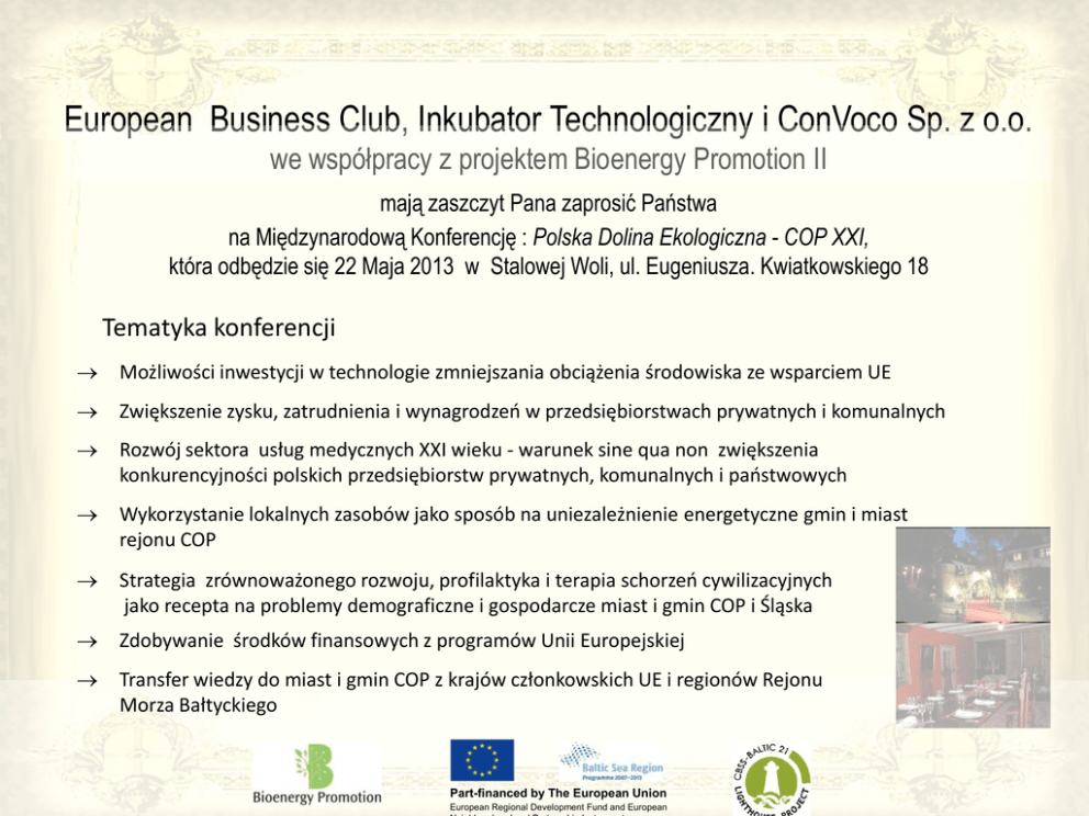 European Business Club, Inkubator Technologiczny i ConVoco Sp. z o.o. we współpracy z projektem Bioenergy Promotion II mają zaszczyt Pana zaprosić Państwa na Międzynarodową Konferencję : Polska Dolina Ekologiczna - COP XXI, która odbędzie się 22 Maja 2013 w Stalowej Woli, ul. Eugeniusza. Kwiatkowskiego 18 Tematyka konferencji Możliwości inwestycji w technologie zmniejszania obciążenia środowiska ze wsparciem UE Zwiększenie zysku, zatrudnienia i wynagrodzeń w przedsiębiorstwach prywatnych i komunalnych Rozwój sektora usług medycznych XXI wieku - warunek sine qua non zwiększenia konkurencyjności polskich przedsiębiorstw prywatnych, komunalnych i państwowych Wykorzystanie lokalnych zasobów jako sposób na uniezależnienie energetyczne gmin i miast rejonu COP Strategia zrównoważonego rozwoju, profilaktyka i terapia schorzeń cywilizacyjnych jako recepta na problemy demograficzne i gospodarcze miast i gmin COP i Śląska Zdobywanie środków finansowych z programów Unii Europejskiej Transfer wiedzy do miast i gmin COP z krajów członkowskich UE i regionów Rejonu Morza Bałtyckiego Part-financed by The European Union European Regional Development Fund and European CELE , ZADANIA I PROBLEMATYKA KONFERENCJI I. Umożliwienie Uczestnikom indywidualnego consultingu specjalistów z zespołów: Prof. dr Zbigniew Bochniarz, CEO - EBC e.V. Dipl. Jurist Zbigniew Roch , prof. dr Anton Stasch Zagadnienia: Inwestycje w sektorze Odnawialnych Źródeł Energii, szanse rozwoju Biznesu w holdingach i klastrach.:pn. amerykanskich, szwajcarskich, niemieckih i polskich Zespół z projektu Bioenergy Promotion II: CEO ConVoco Ltd, Sylwia Klatka, General Project Managers: Joanna Kin, Michał Wójcik Zagadnienia: Coaching dla firm w zakresie Tworzenie własnych projektów przy wsparciu firnansowym i eksperckim z zasobów UE Modele biznesowe zaobserwowane w krajach Rejonu Morza Bałtyckiego Możliwości udziału w przygotowywanych nowych projektach europejskich Dr n. med. Krystyna Anioł Strzyżewska, prof. dr Anton Stasch Zagadnienia:Usługi Zdrowotne XXI wieku najwyżej rozwiniętych społeczeństw Europy i pozostałych kontynentów CEO - EBC e.V. Dipl. Jurist Zbigniew Roch, prof. dr Anton Stasch Zagadnienia: europejskie holdingi i e-holdingi- zakładanie, maksymalizacja zysku, finansowanie działalności gospodarczej w ramach programów pomocy Unii Europejskiej Prof. dr Romuald Szeremietiew, prof. dr Anton Stasch Zagadnienia: finansowane przez NATO i Unię Europejską odnawialne, rozproszone źródła energii jako: Podstawa bezpieczeństwa obywateli i obronności kraju Szansa strategicznej energetycznej i politycznej niezależności od gazu i ropy naftowej w epoce terroryzmu i zagrożeń militarnych Part-financed by The European Union Referaty Sesji Plenarnych Doświadczenia z projektu Bioenergy Promotion II w zakresie tworzenia lokalnych powiązań i bodowania niezależności energetycznej. – Sylwia Klatka (ConVoco Sp. Z o.o.) COP XXI , Polsko - Amerykański Cluster Innowacyjnych Technologii - Zbigniew Bochniarz ( Washington University) Elektrocieplownie Geoplutoniczne Bohdana Żakiewicza - Piotr Moncarz (Stanford University), Dipl. Jurist Zbigniew Roch (European Business Club e.V) Medycyna XXI wieku, nowy sektor usług najbardziej rozwiniętych społeczeństw - Krystyna Anioł-Strzyżewska (Instytut Sportu, European Busines Club e.V.,) Rozwój nowych usług w zakresie profilaktyki i terapii schorzeń cywilizacyjnych – odpowiedź Dolin Technologicznych Europy na kryzys demograficzny i gospodarczy - model dla miast i gmin COP i Śląska, Anton Stasch Stymulacja produkcji biomasy przy pomocy rezonsowej absorpcji promieniowania laserowego-Jan Dobrowolski (Akademia Gorniczo Hutnicza w Krakowie), Zhou Mu, R. Mazur, (Uniwersytet Przyrodniczy w Poznaniu) Redukcja kosztów gospodarowania odpadami płynnymi i stałymi z punktu widzenia pojedynczego gospodarstwa i całej gminy Robert Mazur, Jakub Mazurkiewicz, Przemysław Zakrzewski, Krzysztof Pilarski, (Uniwersytet Przyrodniczy w Poznaniu) II. Prezentacja na stoiskach biznesu i w formie sesji posterowych osiagnięcia Biznesu i Nauki COP, Rejonu Morza Bałtyckiego oraz Szwajcarji produkty i usługi , nauka i technologia, eksport i kooperacja w nastepujacyh obszarach: Strategie zwiększania zysku polskich przedsiębiorstw Doświadczenia z miast i gmin Rejonu Morza Bałtyckiego w zakresie lokalnych strategii energetycznych Nowe miejsca pracy i inne korzyści dla społeczności lokalnej płynące z rozwiązań integrujących zarządzanie odpadami i produkcję energii Nowa medycyna XXI wieku- najwiekszy, nowy sektor usług najbardziej rozwiniętych społeczeństw: bioanalityka,biomedycyna, medycyna naturalna, terapia i rehabilitacja psychomotoryczna w walce ze schorzeniami cywilizacji XXI wieku e-studia w Polsce z niemieckim dyplomem szansą pracy i akumulacji środków w e-biznesie i e-eksporcie wysokokwalifikowanych produktów i usług zamiast emigracji milionów wykształconych Polaków Odnawialne Źródła Energii - największy, najnowocześniejszy biznes XXI wieku: Niemiec, Austrii, Szwecji, Szwajcarii i USA szanse i zagrożenia dla polskich przedsiębiorstw prywatnych i komunalnych Inwestycje ekologiczne szansą dla polskich podwykonawców i producentów Wysoko opłacalne inwestycje ekologiczne przedsiębiorstw oraz gospodarstw domowych Dolin Technologicznych Europy w: - Elektrociepłownie fotowoltaiczne i termo solarne - Elektrociepłownie geoplutoniczne - Biznes produkcji i dystrybucji czystej i taniej zielonej energii dla motoryzacji i napędu maszyn przemysłowych: biogaz, biodiesel, diesel z trudno utylizowalnych odpadów, bioetanol z wierzby energetycznej i kukurydzy Part-financed by The European Union Rada Naukowa Konferencji President, prof. dr Andrew Targowski (USA), Western Michigan University, President of Advisory Council of the IRMA,( Information Resources Management Association) Vice President , prof. dr Zbigniew Bochniarz 