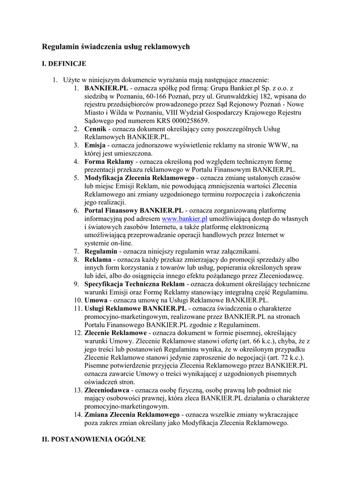 Regulamin świadczenia usług reklamowych I. DEFINICJE 1. Użyte w niniejszym dokumencie wyrażania mają następujące znaczenie: 1. BANKIER.PL - oznacza spółkę pod firmą: Grupa Bankier.pl Sp. z o.o. z siedzibą w Poznaniu, 60-166 Poznań, przy ul. Grunwaldzkiej 182, wpisana do rejestru przedsiębiorców prowadzonego przez Sąd Rejonowy Poznań - Nowe Miasto i Wilda w Poznaniu, VIII Wydział Gospodarczy Krajowego Rejestru Sądowego pod numerem KRS 0000258659. 2. Cennik - oznacza dokument określający ceny poszczególnych Usług Reklamowych BANKIER.PL. 3. Emisja - oznacza jednorazowe wyświetlenie reklamy na stronie WWW, na której jest umieszczona. 4. Forma Reklamy - oznacza określoną pod względem technicznym formę prezentacji przekazu reklamowego w Portalu Finansowym BANKIER.PL. 5. Modyfikacja Zlecenia Reklamowego - oznacza zmianę ustalonych czasów lub miejsc Emisji Reklam, nie powodującą zmniejszenia wartości Zlecenia Reklamowego ani zmiany uzgodnionego terminu rozpoczęcia i zakończenia jego realizacji. 6. Portal Finansowy BANKIER.PL - oznacza zorganizowaną platformę informacyjną pod adresem www.bankier.pl umożliwiającą dostęp do własnych i światowych zasobów Internetu, a także platformę elektroniczną umożliwiającą przeprowadzanie operacji handlowych przez Internet w systemie on-line. 7. Regulamin - oznacza niniejszy regulamin wraz załącznikami. 8. Reklama - oznacza każdy przekaz zmierzający do promocji sprzedaży albo innych form korzystania z towarów lub usług, popierania określonych spraw lub idei, albo do osiągnięcia innego efektu pożądanego przez Zleceniodawcę. 9. Specyfikacja Techniczna Reklam - oznacza dokument określający techniczne warunki Emisji oraz Formę Reklamy stanowiący integralną część Regulaminu. 10. Umowa - oznacza umowę na Usługi Reklamowe BANKIER.PL. 11. Usługi Reklamowe BANKIER.PL - oznacza świadczenia o charakterze promocyjno-marketingowym, realizowane przez BANKIER.PL na stronach Portalu Finansowego BANKIER.PL zgodnie z Regulaminem. 12. Zlecenie Reklamowe - oznacza dokument w formie pisemnej, określający warunki Umowy. Zlecenie Reklamowe stanowi ofertę (art. 66 k.c.), chyba, że z jego treści lub postanowień Regulaminu wynika, że w określonym przypadku Zlecenie Reklamowe stanowi jedynie zaproszenie do negocjacji (art. 72 k.c.). Pisemne potwierdzenie przyjęcia Zlecenia Reklamowego przez BANKIER.PL oznacza zawarcie Umowy o treści wynikającej z uzgodnionych pisemnych oświadczeń stron. 13. Zleceniodawca - oznacza osobę fizyczną, osobę prawną lub podmiot nie mający osobowości prawnej, która zleca BANKIER.PL działania o charakterze promocyjno-marketingowym. 14. Zmiana Zlecenia Reklamowego - oznacza wszelkie zmiany wykraczające poza zakres zmian określany jako Modyfikacja Zlecenia Reklamowego. II. POSTANOWIENIA OGÓLNE 1. BANKIER.PL przyjmuje Zlecenia poprzez przesłanie na adres [email protected] prawidłowo wypełnionego formularza Zlecenia Reklamowego w formacie pdf, określającego Zleceniodawcę w sposób umożliwiający jego identyfikację (w tym w szczególności: adres do korespondencji, numer identyfikacji podatkowej, osobę kontaktową), rodzaj zamawianej Reklamy, ilość i czas Emisji, lokalizację w Portalu Finansowym BANKIER.PL oraz wszystkie pozostałe warunki zamawianego rodzaju Reklamy. BANKIER.PL zastrzega obie prawo do żądania od Zleceniodawcy dodatkowych dokumentów potwierdzających prawidłowość Zlecenia Reklamowego, w tym również oryginału formularza Zlecenia Reklamowego. 2. Zlecenie Reklamowe podpisuje osoba upoważniona do reprezentacji Zleceniodawcy. BANKIER.PL zastrzega sobie prawo do żądania od Zleceniodawcy dodatkowych dokumentów potwierdzających uprawnienie osoby (osób) podpisujących Zlecenie Reklamowe. 3. W przypadku, gdy Zleceniodawca jest podmiotem gospodarczym, działającym na podstawie wpisu do ewidencji działalności gospodarczej, Zlecenie Reklamowe musi ponadto zawierać imię i nazwisko osoby prowadzącej działalność gospodarczą lub wspólników spółki cywilnej. 4. Zlecenie Reklamowe powinno być opatrzone pieczęcią Zleceniodawcy. 5. Wszelkie oświadczenia BANKIER.PL i Zleceniodawcy uważa się za dokonane z zachowaniem formy pisemnej, jeżeli nastąpiły w jeden z poniżej wskazanych sposobów: 1. przez złożenie pisma w siedzibie drugiej Strony w dacie potwierdzenia jego przyjęcia, lub 2. przez wysłanie listem poleconym, lub 3. przez wysłanie skanu oświadczenia w formacie pdf na adres wskazany przez BANKIER.PL lub Zleceniodawcę w dacie potwierdzenia jego odbioru przez adresata. 6. Wszelkie postanowienia Regulaminu mają odpowiednie zastosowanie także do Usług Reklamowych BANKIER.PL świadczonych w serwisach internetowych działających pod następującymi adresami domenowymi: www.eurobankier.pl, www.twoja-firma.pl, www.mam-biznes.pl, www.pit.pl, www.vat.pl, www.24.pl oraz wszystkich innych stronach internetowych, do których po dacie ustanowienia Regulaminu przysługiwać będą prawa umożliwiające świadczenie Usług Reklamowych BANKIER.PL na zasadach określonych w Regulaminie. III. ZAWARCIE UMOWY 1. Zlecenie Reklamowe stanowi ofertę w rozumieniu art. 66 k.c. do chwili potwierdzenia przyjęcia Zlecenia Reklamowego przez BANKIER.PL. 2. Zlecenie Reklamowe musi zostać doręczone do siedziby BANKIER.PL w jednym ze sposobów określonych w Pkt II.5 Regulaminu najpóźniej na 3 dni robocze przed ustalonym terminem rozpoczęcia Emisji. 3. Zlecenie Reklamowe, które zostanie doręczone w terminie późniejszym niż określony w ust. 2 powyżej stanowi jedynie zaproszenie do negocjacji w rozumieniu art. 72 k.c.. Postanowienia ust. 4 poniżej stosuje się odpowiednio. 4. Potwierdzenie przez BANKIER.PL Zlecenia Reklamowego dokonane poprzez doręczenie Zleceniodawcy oświadczenia o przyjęciu wypełnionego formularza Zlecenia Reklamowego z potwierdzeniem rodzaju zamawianej Reklamy, jest równoznaczne z zawarciem Umowy. BANKIER.PL