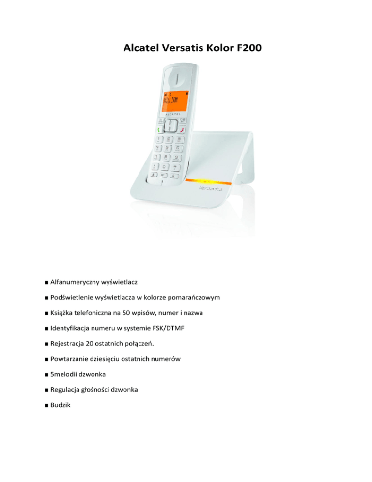 Alcatel Versatis Kolor F200 ■ Alfanumeryczny wyświetlacz ■ Podświetlenie wyświetlacza w kolorze pomaraoczowym ■ Książka telefoniczna na 50 wpisów, numer i nazwa ■ Identyfikacja numeru w systemie FSK/DTMF ■ Rejestracja 20 ostatnich połączeo. ■ Powtarzanie dziesięciu ostatnich numerów ■ 5melodii dzwonka ■ Regulacja głośności dzwonka ■ Budzik